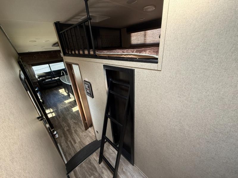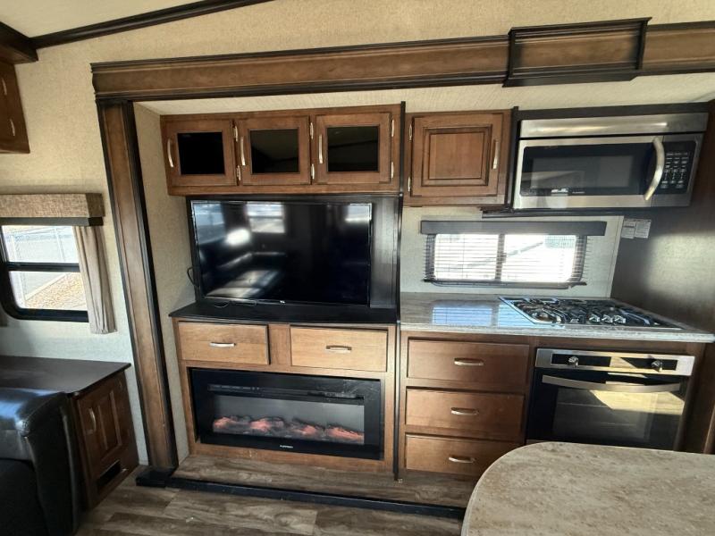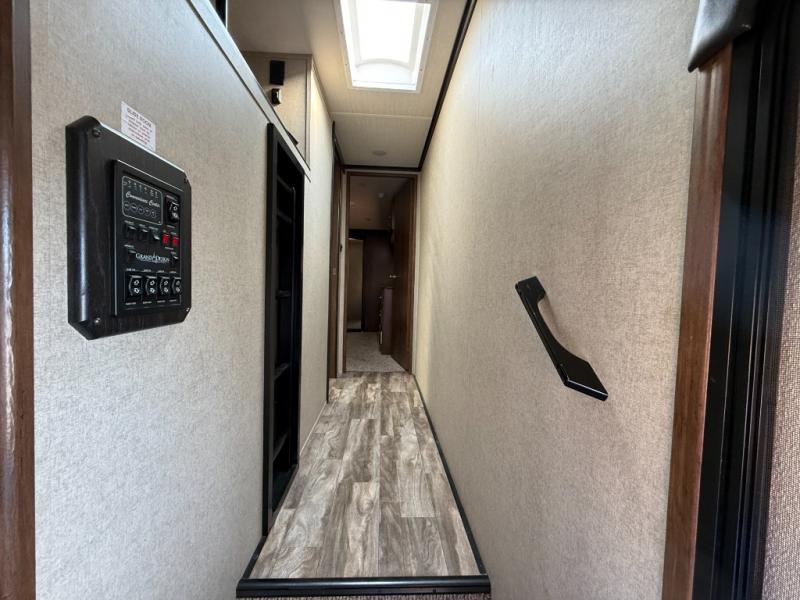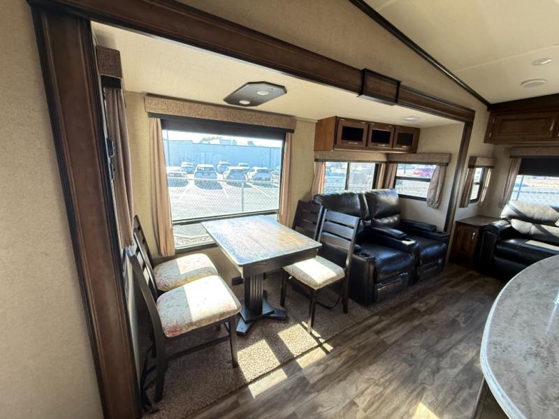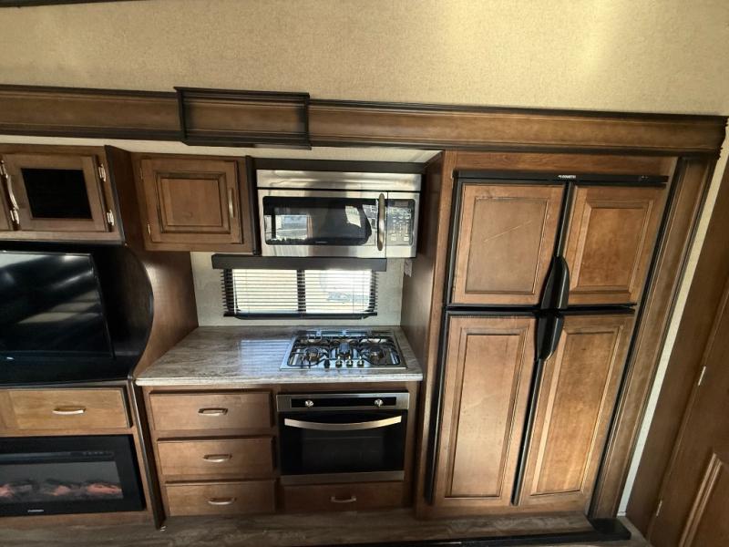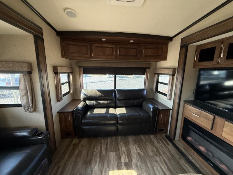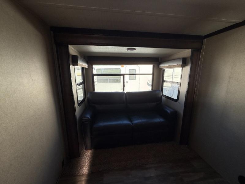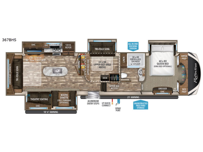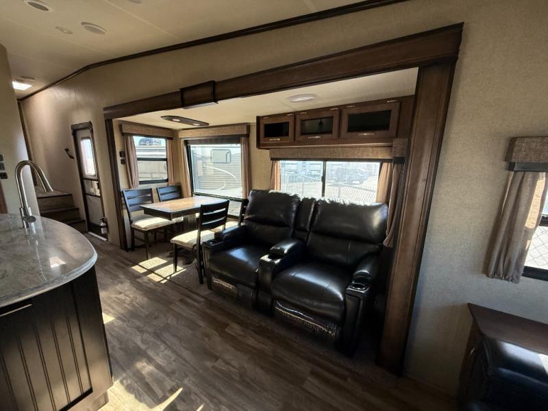 Have you been searching for a fifth wheel that offers a master suite plus an extra room to be used as an office, second living area or even a bedroom? Then start imagining how you will use all of the space in this Reflection 367BHS. The centrally located extra room includes a sofa and a desk, plus a loft above for more sleeping space. The main living area and kitchen offer plenty of seating, a large pantry, and all the appliances to make your favorite meals. There is even extra sleeping space on the tri-fold sofa next to the 40" TV and fireplace. You will be able to entertain as well as relax in this area or in the extra room. The exterior unobstructed pass-through compartment allows for more outdoor gear to be packed, and the two awnings provide extra protection from the elements. Your search is over, this is the model for you!