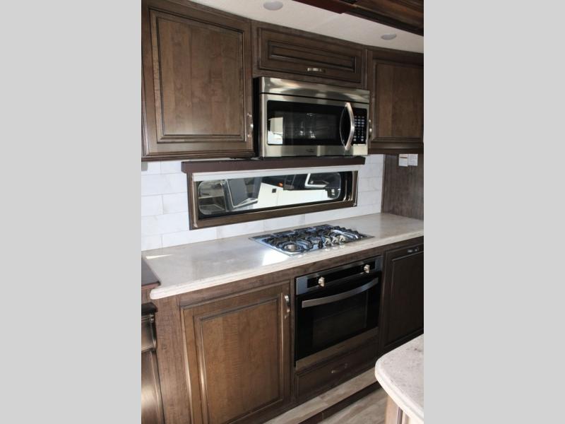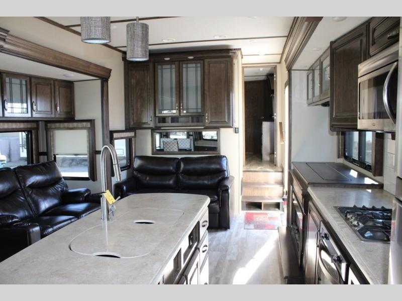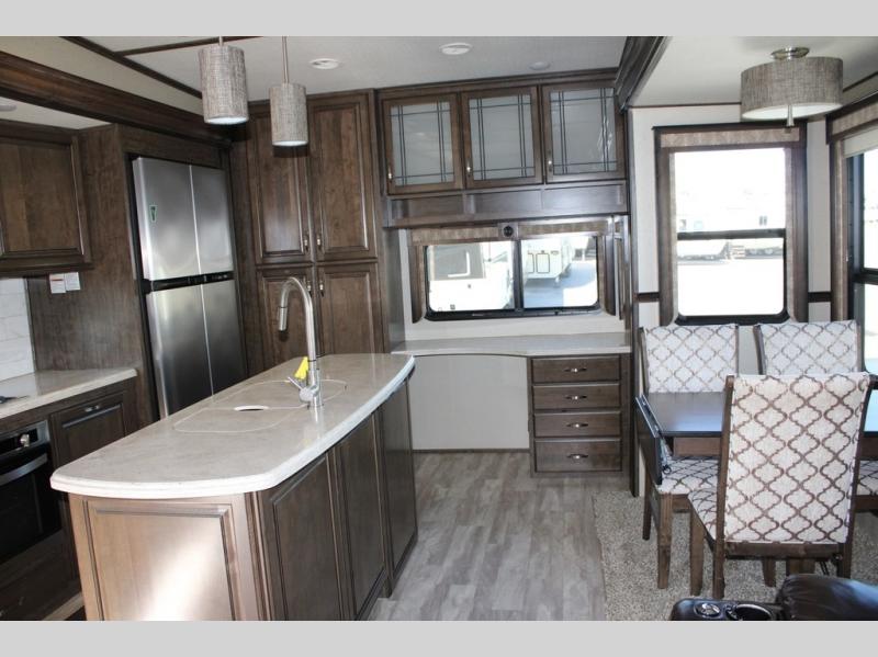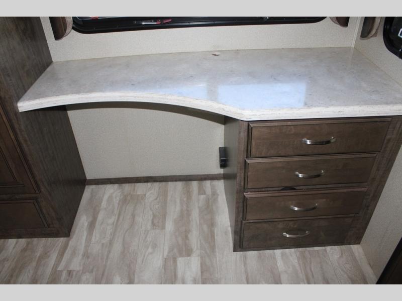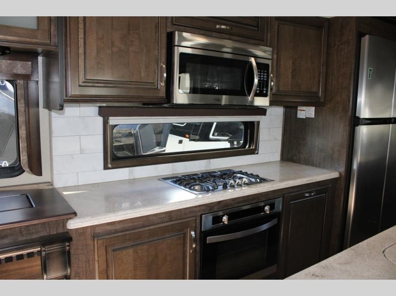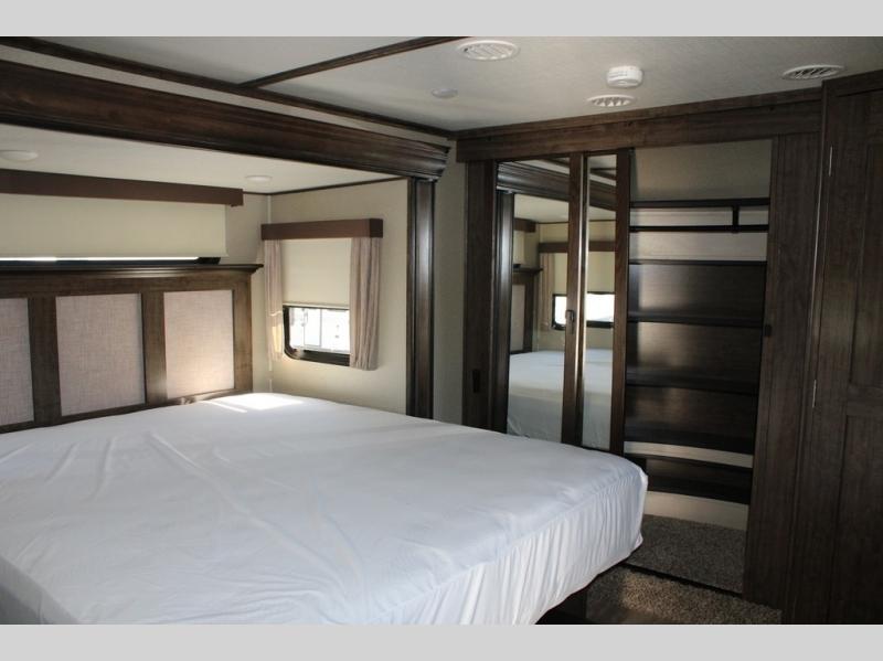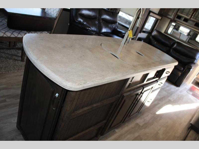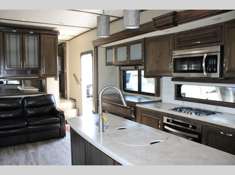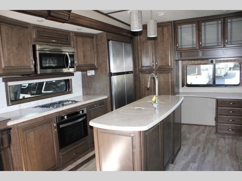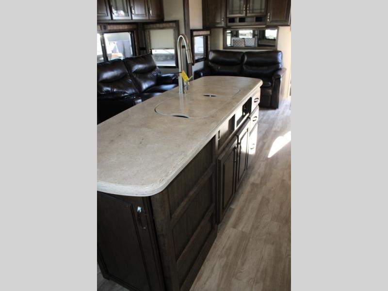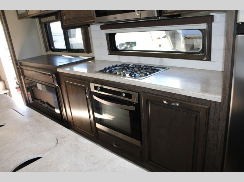 Just imagine working at your own desk while looking out the window at the mountains or the lake in this Solitude 344GK fifth wheel. Now you can start thinking about how you will enjoy a front master bedroom with a flip-top dresser, pullout ottoman, and TV. When you aren't exploring outside, you might decide to cook your meals using the professional grade stainless steel cooktop, built-in oven or convection microwave. There is serving space on the kitchen island, and you can store leftovers in the pantry or in the stainless steel 18 cu. ft. four door refrigerator. You will find plenty of storage throughout including for your shoes, dry goods, linens, and your wardrobe. You might even like to choose a few options such as adding a washer and dryer, a dishwasher, a king size bed, or even a pull-out kitchen outside. Come see how this Solitude allows you to work and play at any destination.
