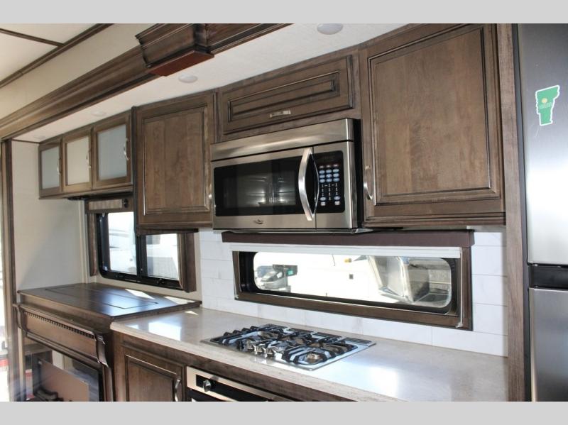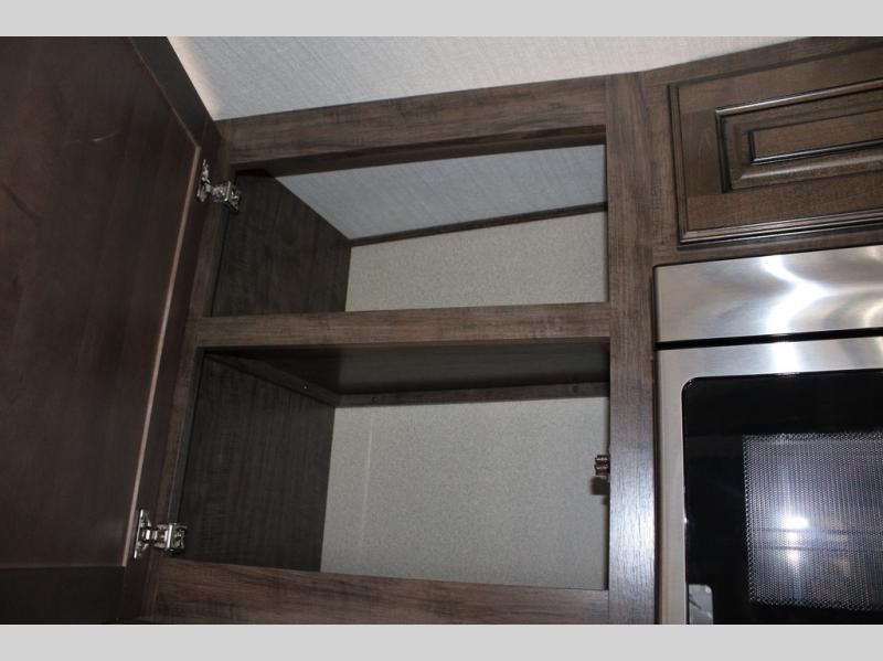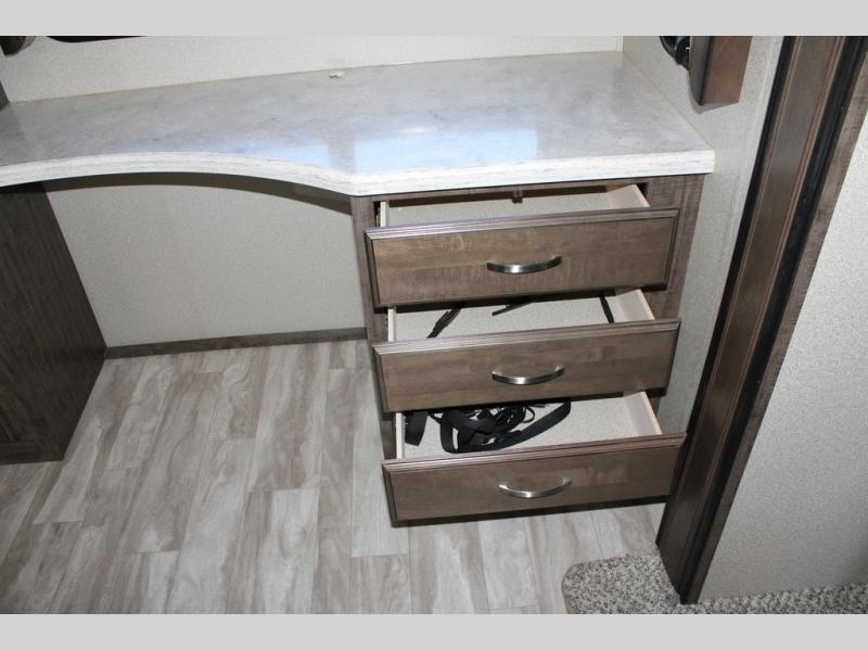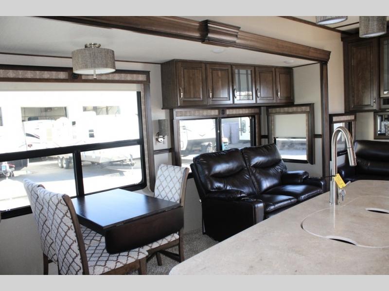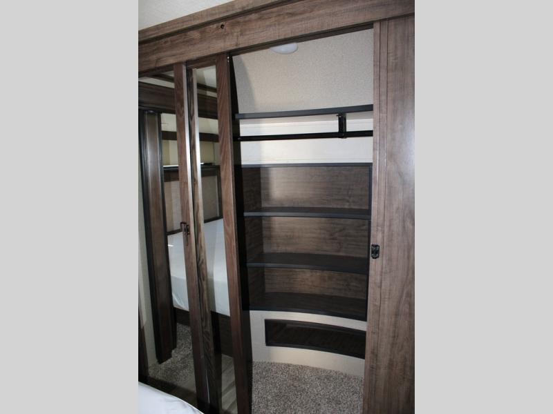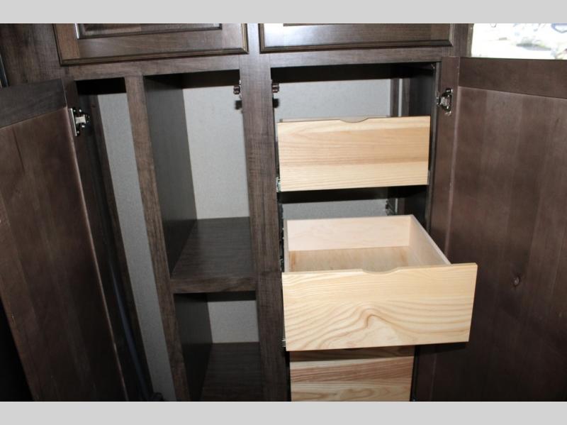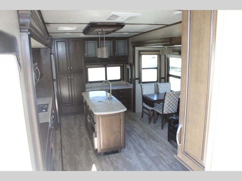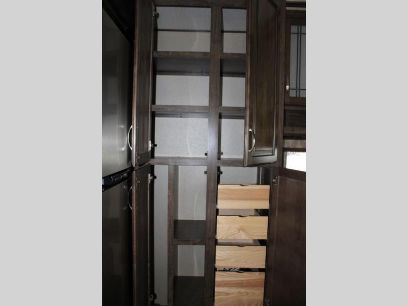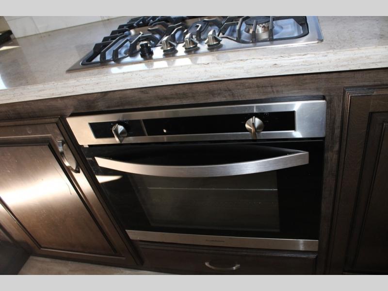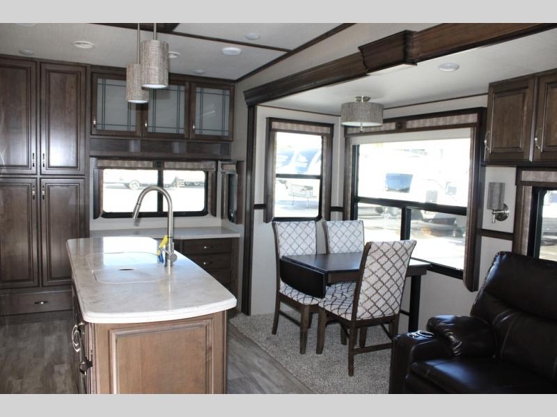 Just imagine working at your own desk while looking out the window at the mountains or the lake in this Solitude 344GK fifth wheel. Now you can start thinking about how you will enjoy a front master bedroom with a flip-top dresser, pullout ottoman, and TV. When you aren't exploring outside, you might decide to cook your meals using the professional grade stainless steel cooktop, built-in oven or convection microwave. There is serving space on the kitchen island, and you can store leftovers in the pantry or in the stainless steel 18 cu. ft. four door refrigerator. You will find plenty of storage throughout including for your shoes, dry goods, linens, and your wardrobe. You might even like to choose a few options such as adding a washer and dryer, a dishwasher, a king size bed, or even a pull-out kitchen outside. Come see how this Solitude allows you to work and play at any destination.