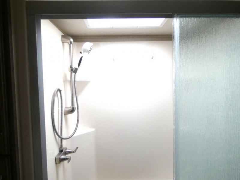 Head up the step to your right and find a side aisle bath and front master bedroom. The bath offers a shower with skylight and seat, a linen cabinet, a toilet, and vanity with sink.