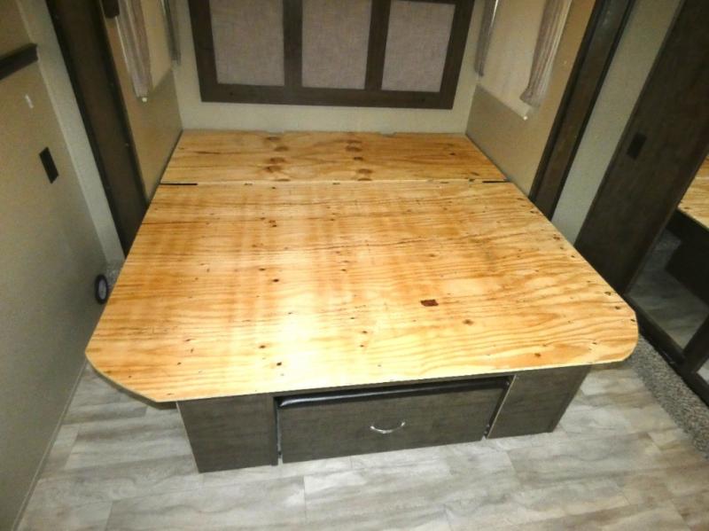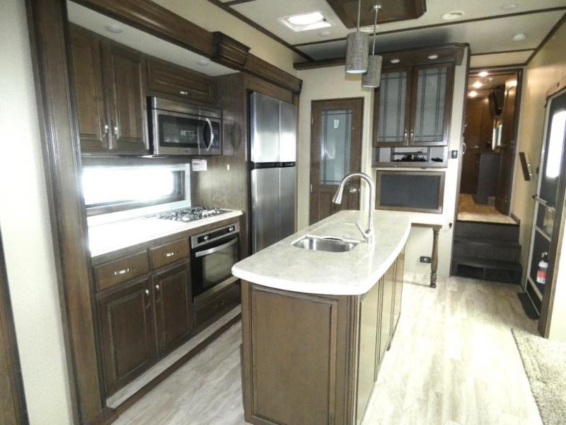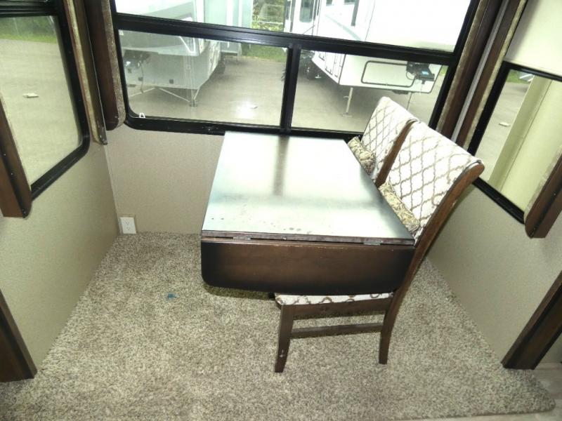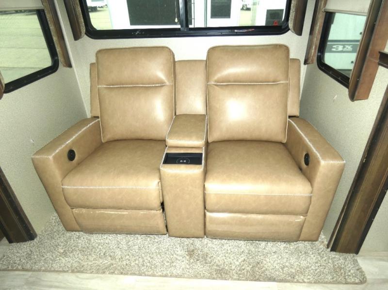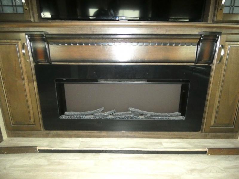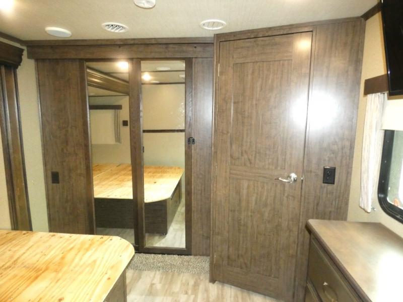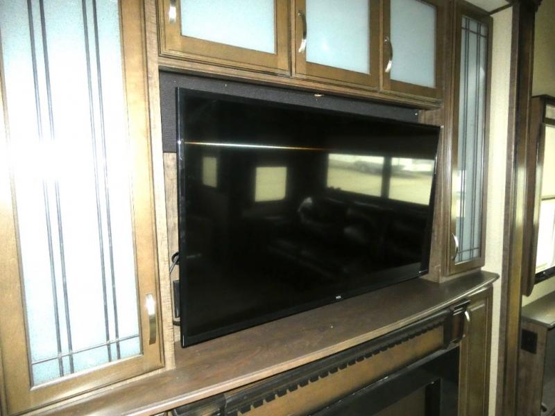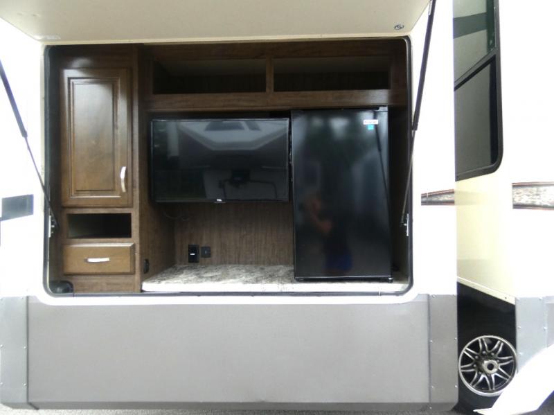 Outside enjoy an exterior LED TV and refrigerator to keep cold drinks handy. You will also love the unobstructed pass-through storage compartment for all of your outdoor camping items, plus universal docking station, and so much more!