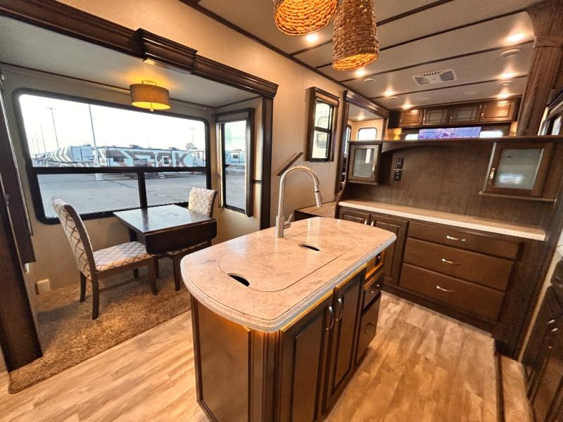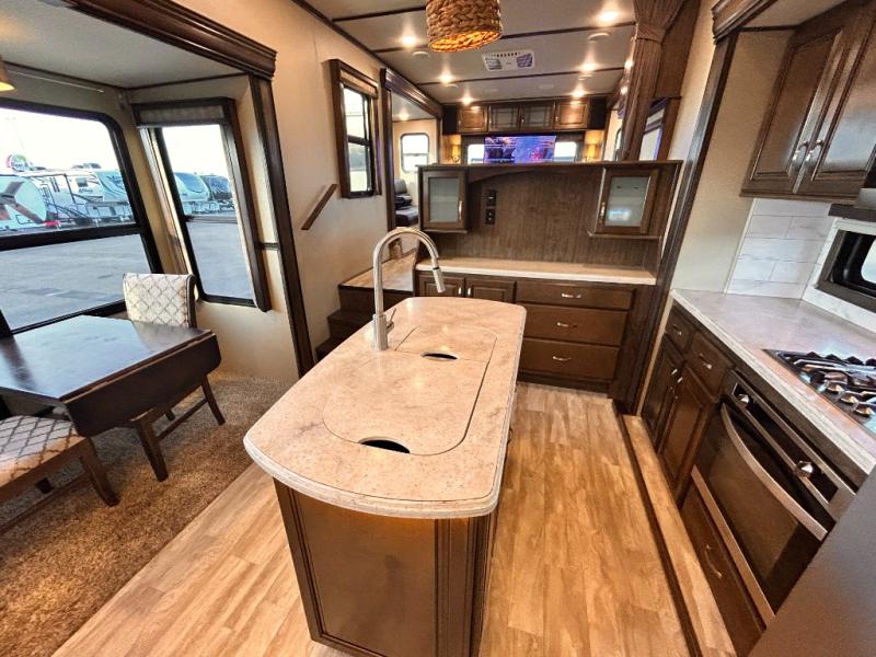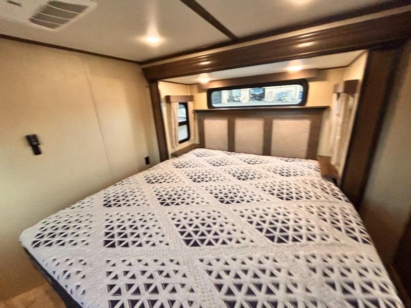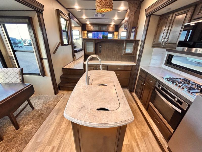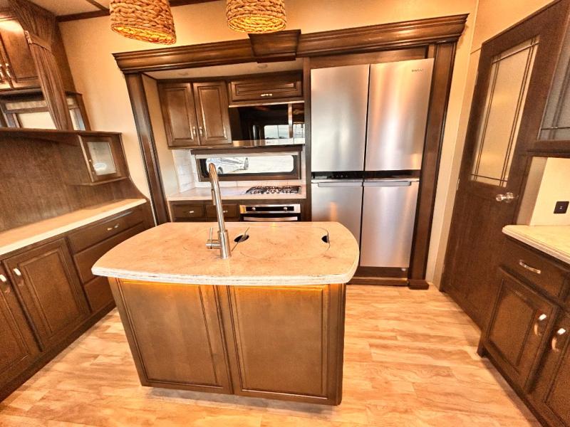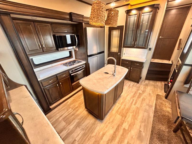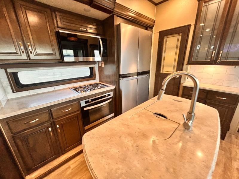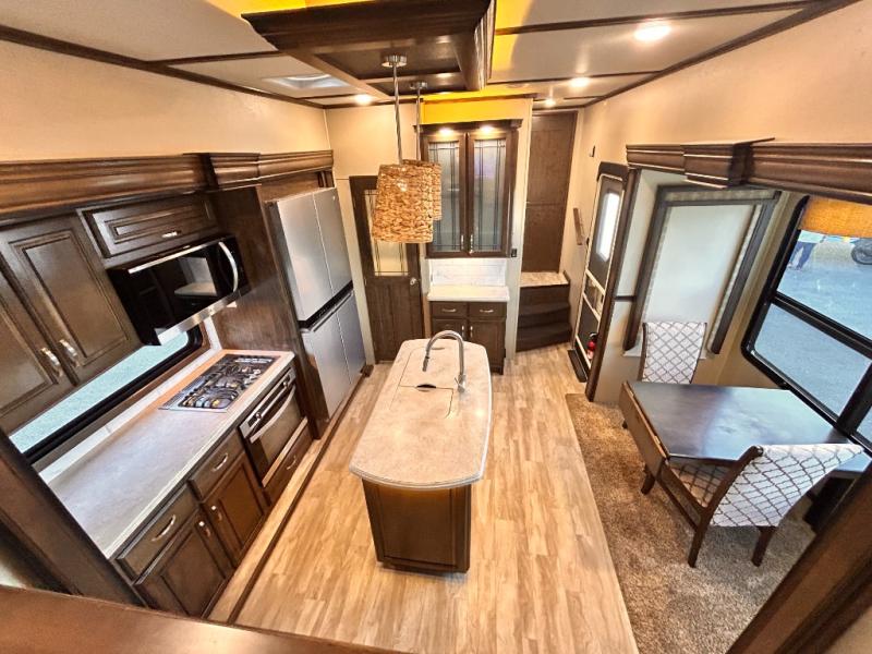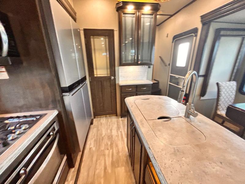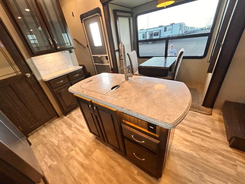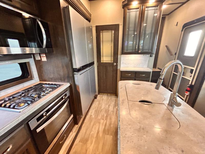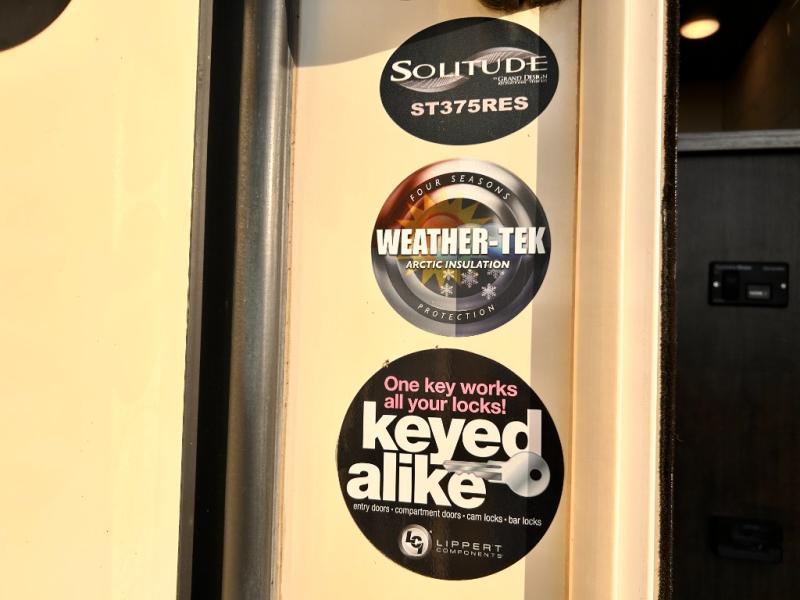 This Solitude 375RES fifth wheel allows you to travel with all the comforts of home including plenty of interior floor space to move around, extra sleeping space for the kids or grandkids, and plenty of storage for everything you might need for an extended stay. The unique exterior rear storage includes a sliding tray allowing easy access to the gear in the back. Inside, the front master bedroom will not disappoint with a pullout ottoman, flip-top dresser, and a TV to mention a few features. The cook will surely love making meals with the professional grade stainless steel cooktop, built-in oven and convection microwave. The popular kitchen island, stainless steel 18 cu. ft. four door refrigerator, and large pantry are sure to impress. The buffet adds additional counter space to serve food or place your keys and things. You might even decide to add a few options such as a washer and dryer to keep your clothes clean the whole time, a king size bed for more sleeping surface, or even a pull-out kitchen to make meals outdoors. There are many features and plenty of space for everyone!