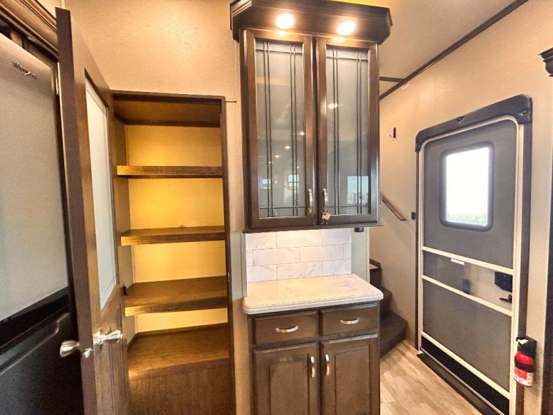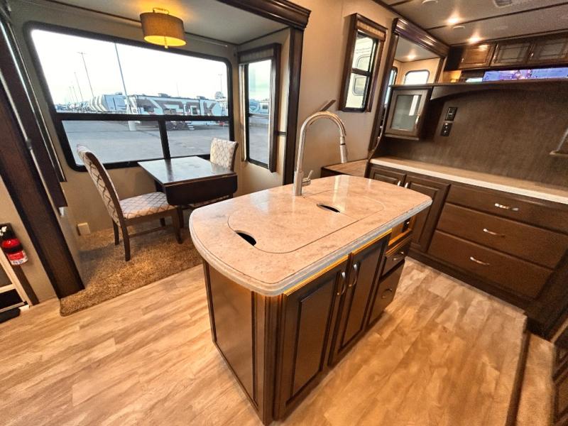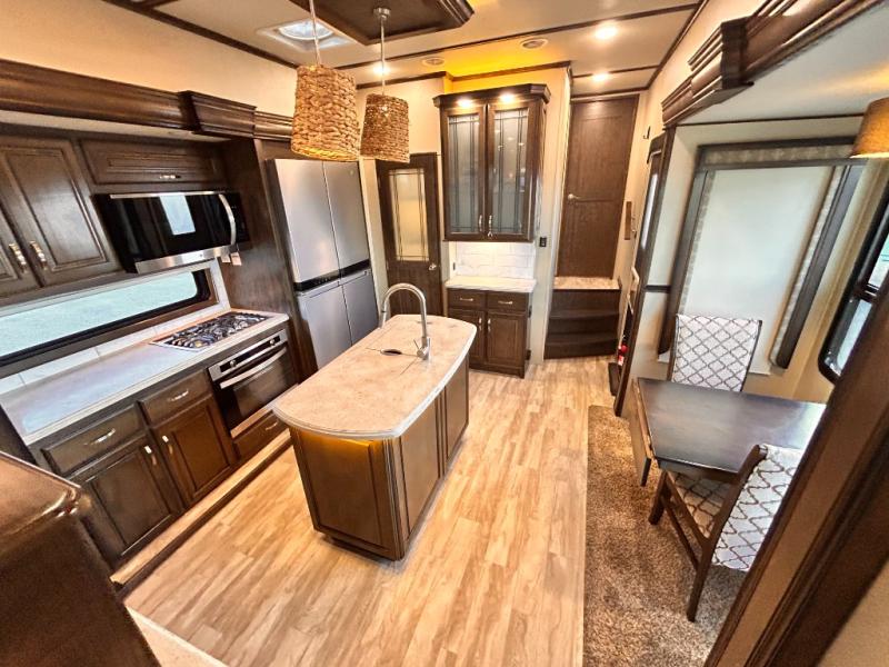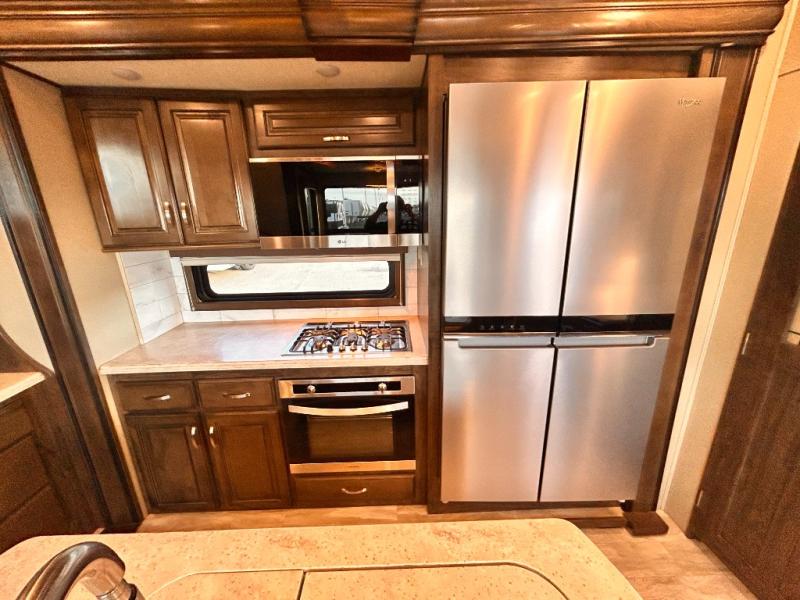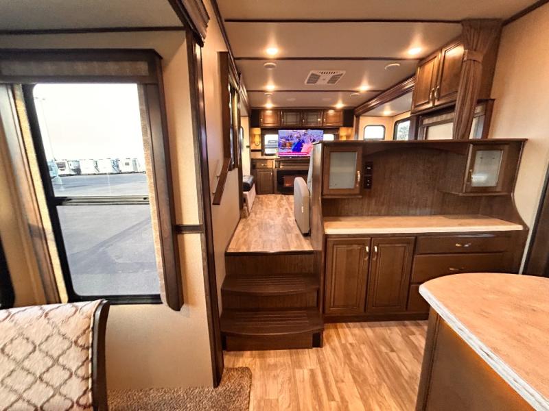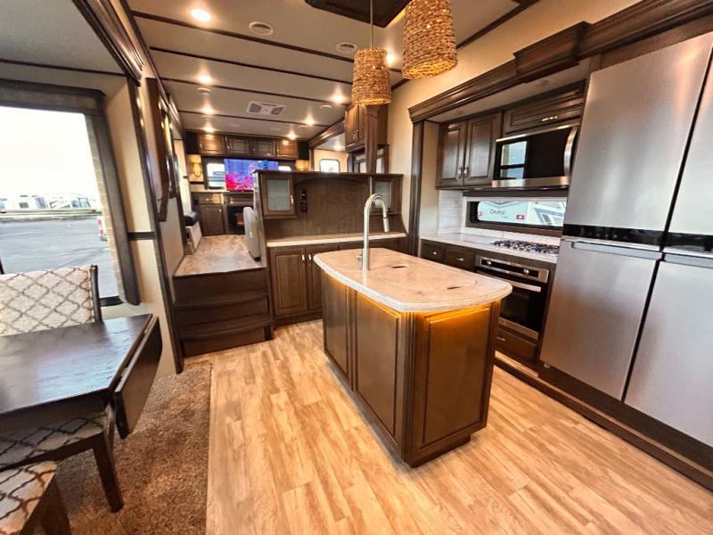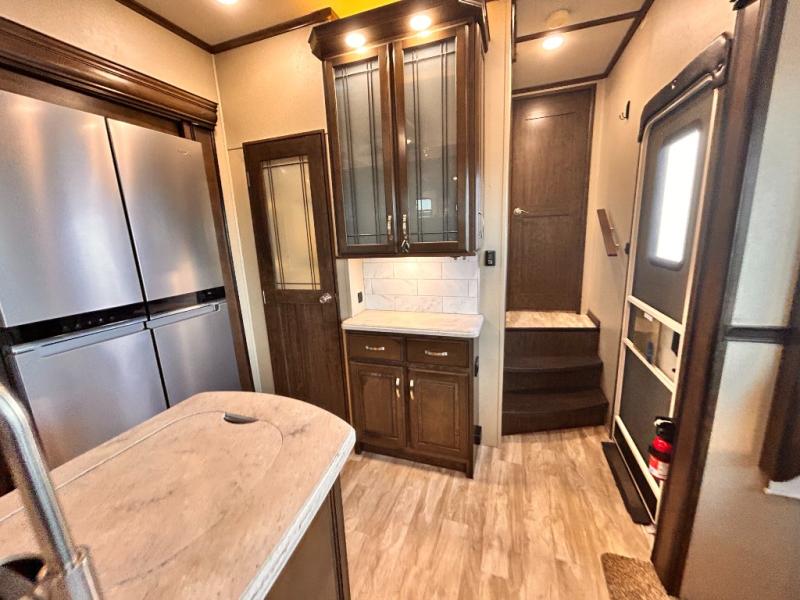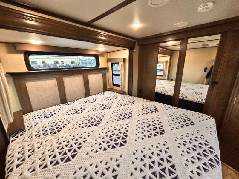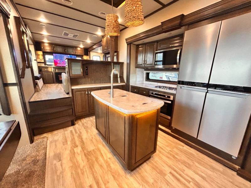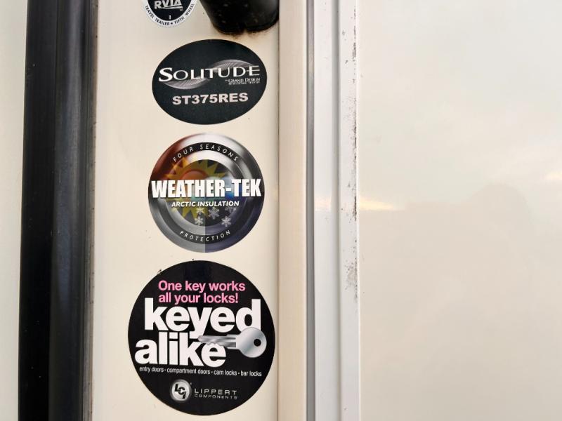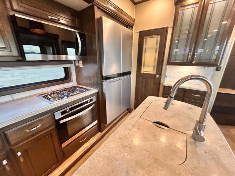 This Solitude 375RES fifth wheel allows you to travel with all the comforts of home including plenty of interior floor space to move around, extra sleeping space for the kids or grandkids, and plenty of storage for everything you might need for an extended stay. The unique exterior rear storage includes a sliding tray allowing easy access to the gear in the back. Inside, the front master bedroom will not disappoint with a pullout ottoman, flip-top dresser, and a TV to mention a few features. The cook will surely love making meals with the professional grade stainless steel cooktop, built-in oven and convection microwave. The popular kitchen island, stainless steel 18 cu. ft. four door refrigerator, and large pantry are sure to impress. The buffet adds additional counter space to serve food or place your keys and things. You might even decide to add a few options such as a washer and dryer to keep your clothes clean the whole time, a king size bed for more sleeping surface, or even a pull-out kitchen to make meals outdoors. There are many features and plenty of space for everyone!