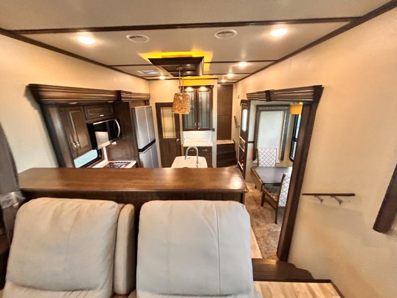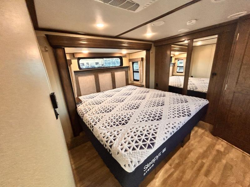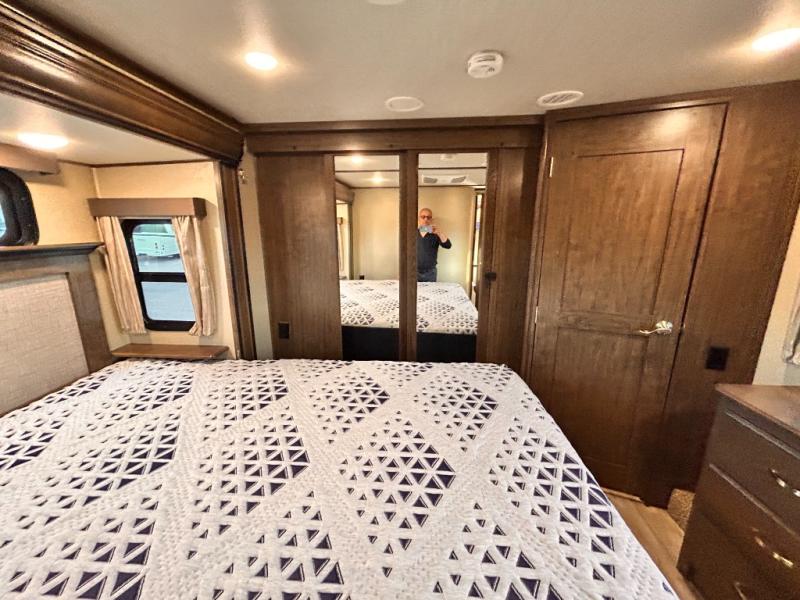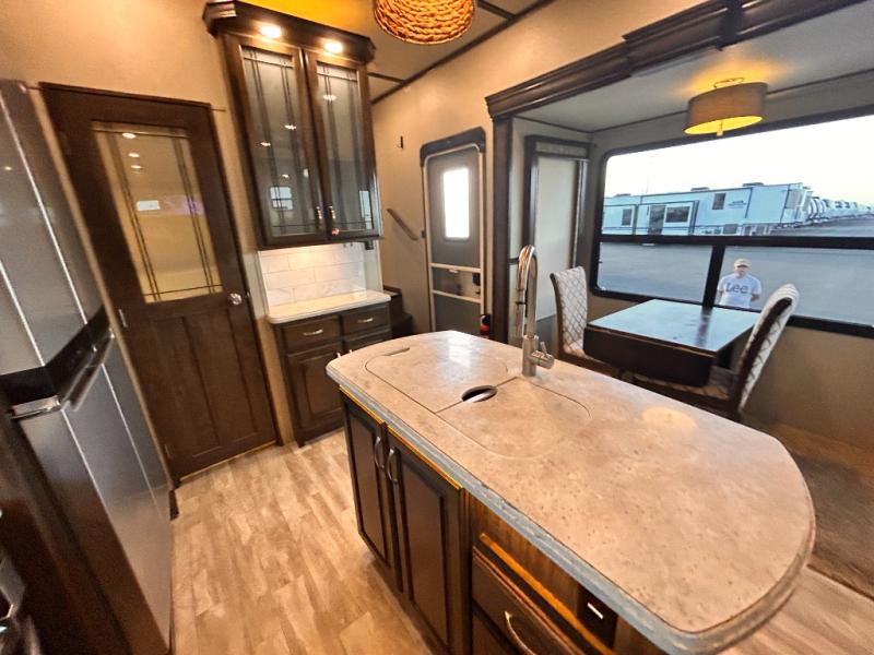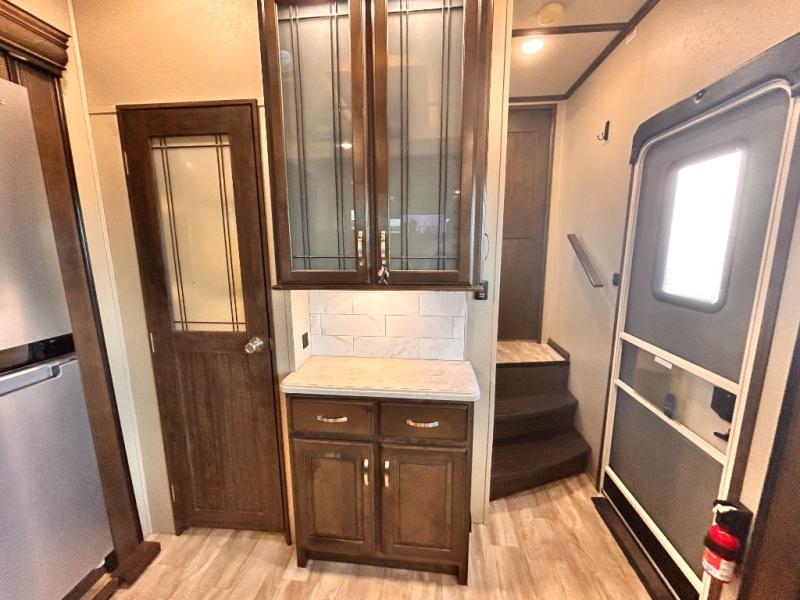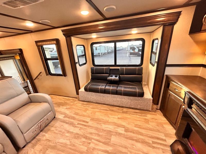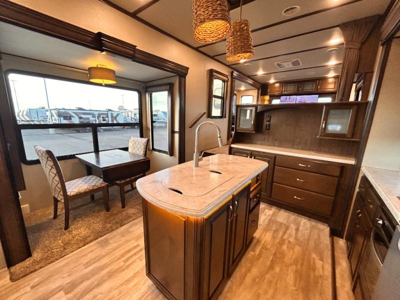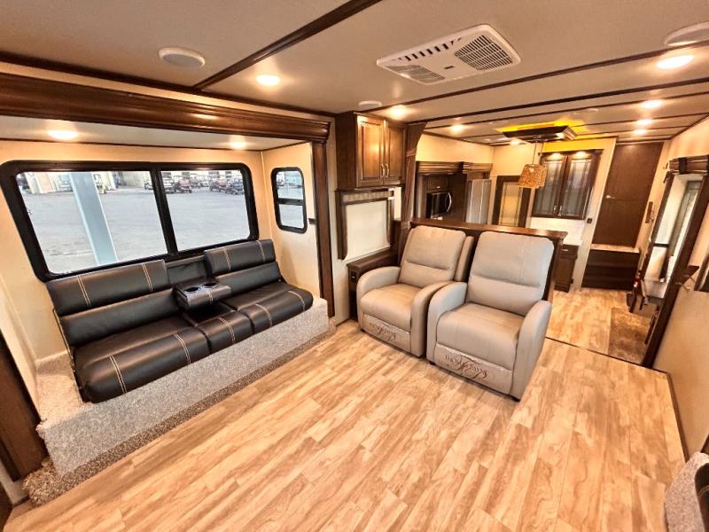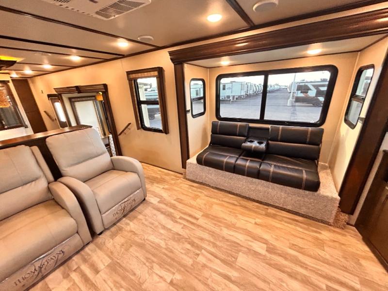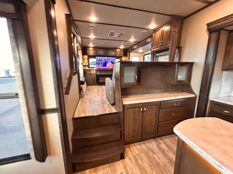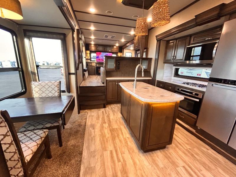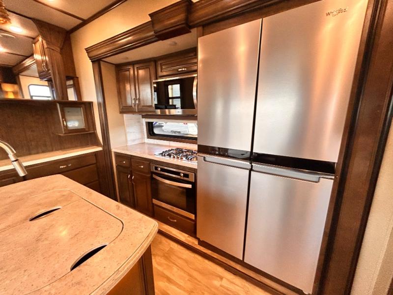 This Solitude 375RES fifth wheel allows you to travel with all the comforts of home including plenty of interior floor space to move around, extra sleeping space for the kids or grandkids, and plenty of storage for everything you might need for an extended stay. The unique exterior rear storage includes a sliding tray allowing easy access to the gear in the back. Inside, the front master bedroom will not disappoint with a pullout ottoman, flip-top dresser, and a TV to mention a few features. The cook will surely love making meals with the professional grade stainless steel cooktop, built-in oven and convection microwave. The popular kitchen island, stainless steel 18 cu. ft. four door refrigerator, and large pantry are sure to impress. The buffet adds additional counter space to serve food or place your keys and things. You might even decide to add a few options such as a washer and dryer to keep your clothes clean the whole time, a king size bed for more sleeping surface, or even a pull-out kitchen to make meals outdoors. There are many features and plenty of space for everyone!
