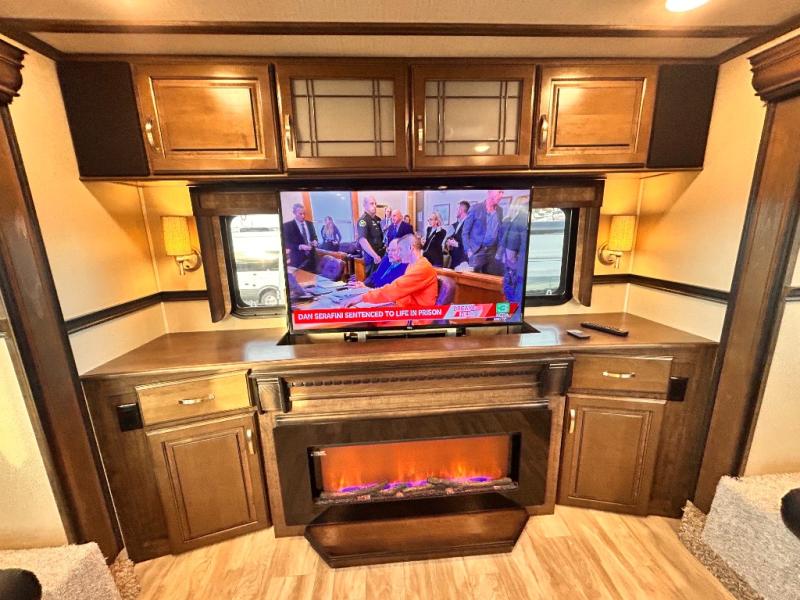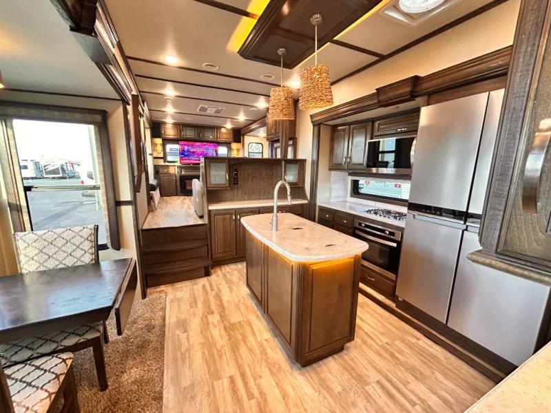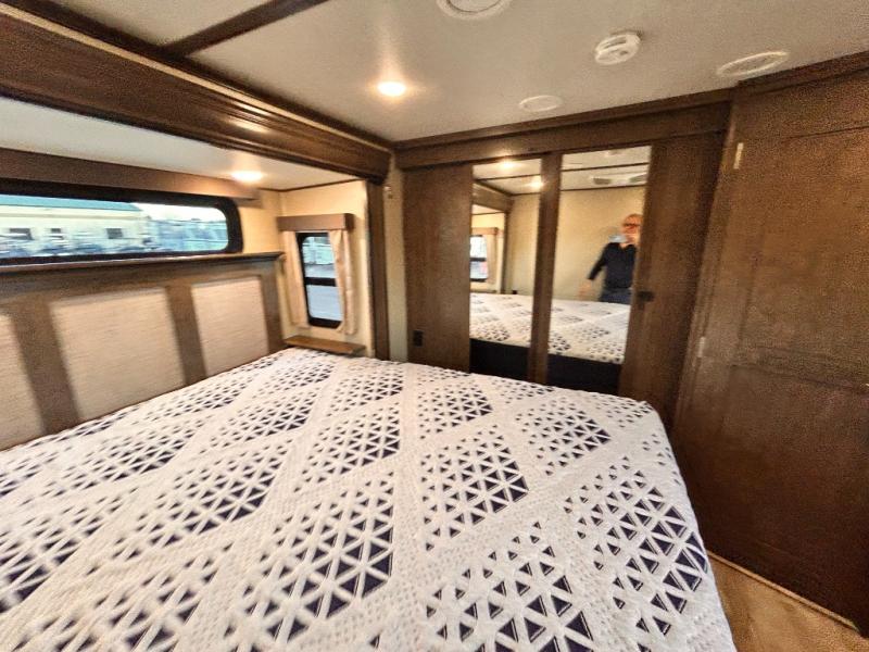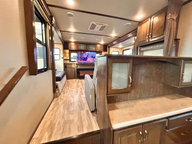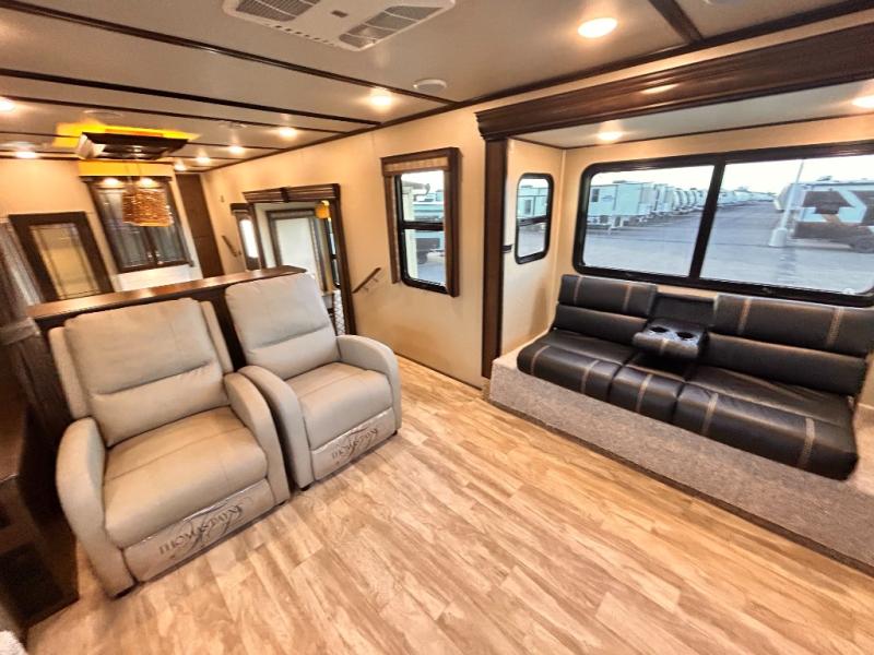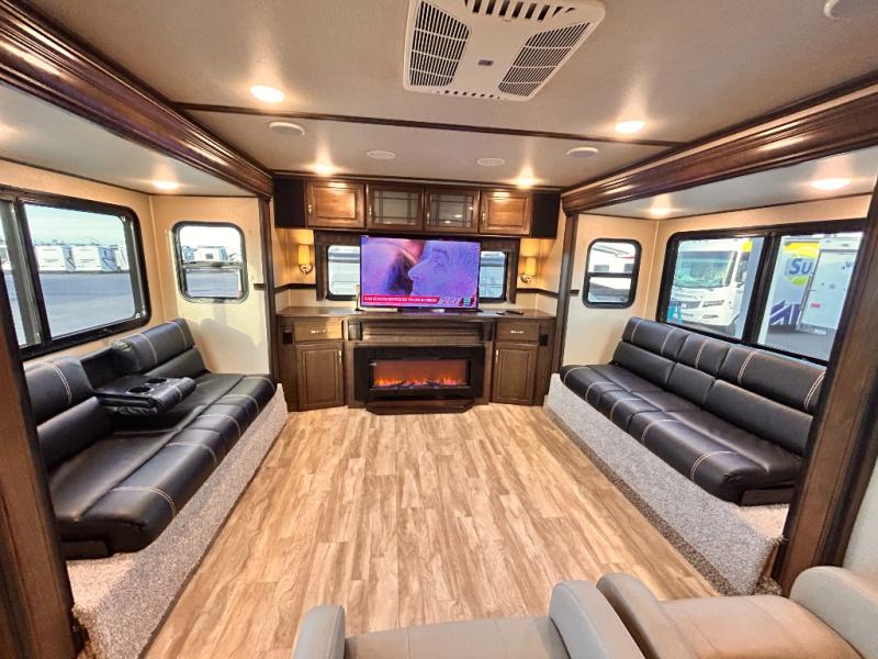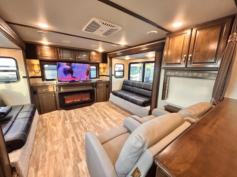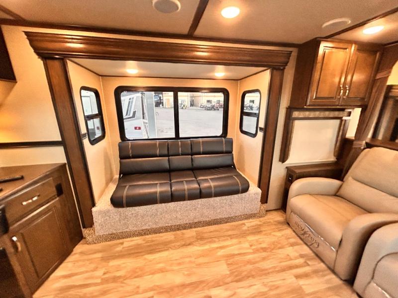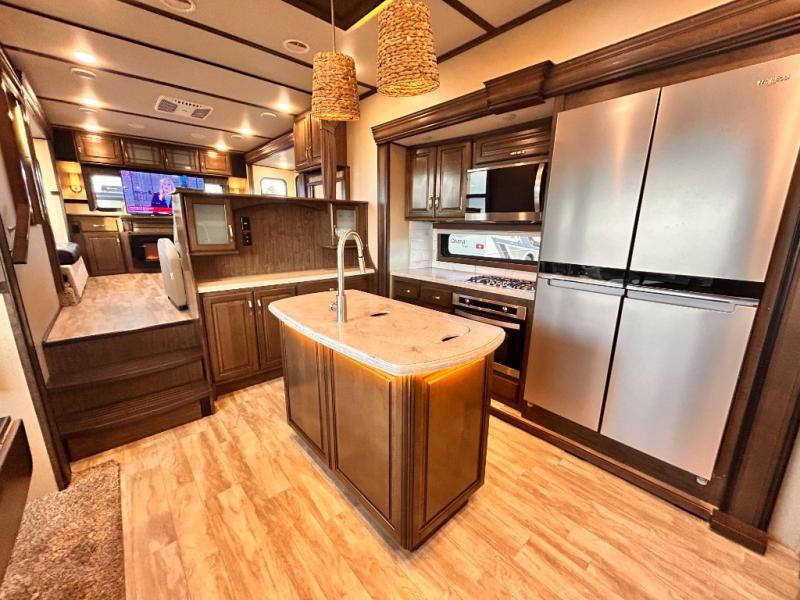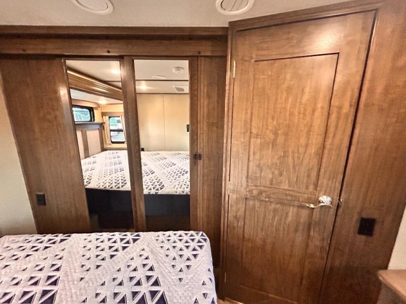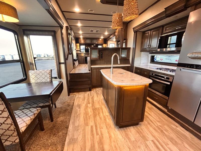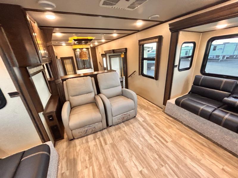 This Solitude 375RES fifth wheel allows you to travel with all the comforts of home including plenty of interior floor space to move around, extra sleeping space for the kids or grandkids, and plenty of storage for everything you might need for an extended stay. The unique exterior rear storage includes a sliding tray allowing easy access to the gear in the back. Inside, the front master bedroom will not disappoint with a pullout ottoman, flip-top dresser, and a TV to mention a few features. The cook will surely love making meals with the professional grade stainless steel cooktop, built-in oven and convection microwave. The popular kitchen island, stainless steel 18 cu. ft. four door refrigerator, and large pantry are sure to impress. The buffet adds additional counter space to serve food or place your keys and things. You might even decide to add a few options such as a washer and dryer to keep your clothes clean the whole time, a king size bed for more sleeping surface, or even a pull-out kitchen to make meals outdoors. There are many features and plenty of space for everyone!