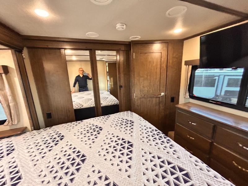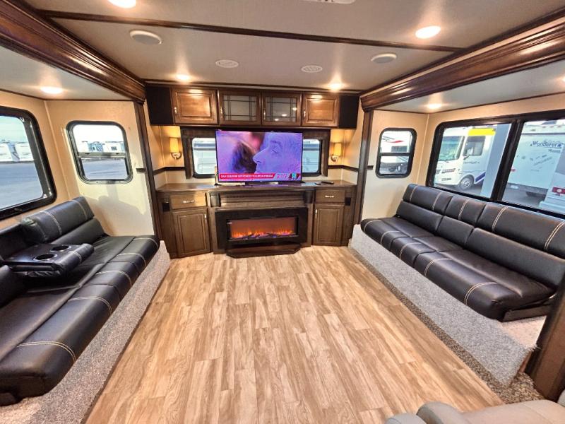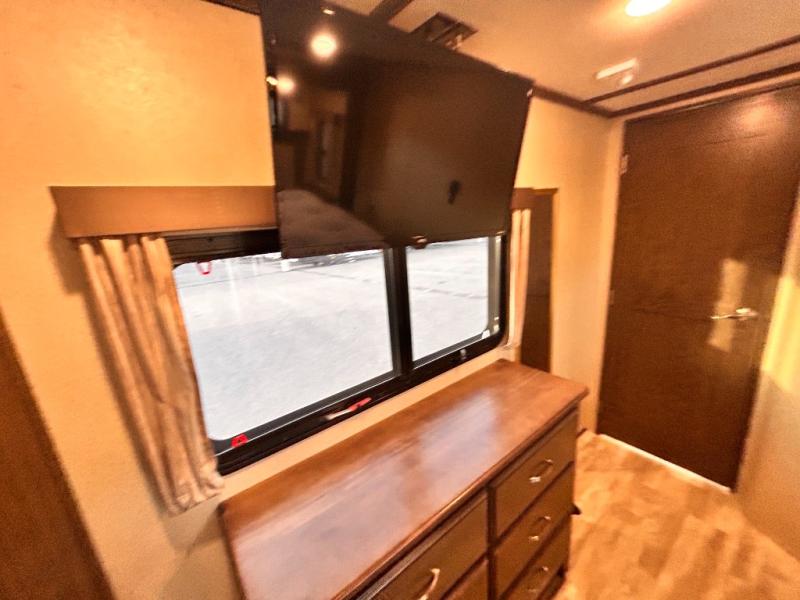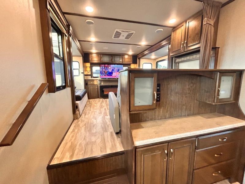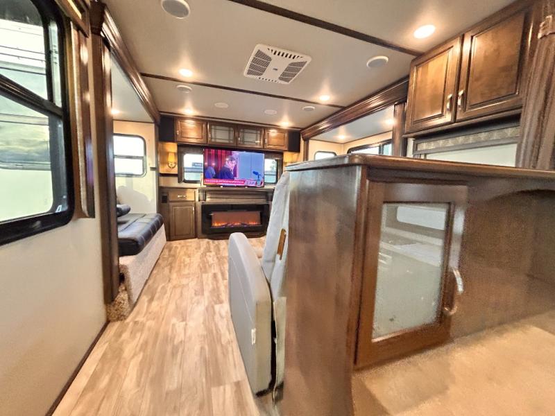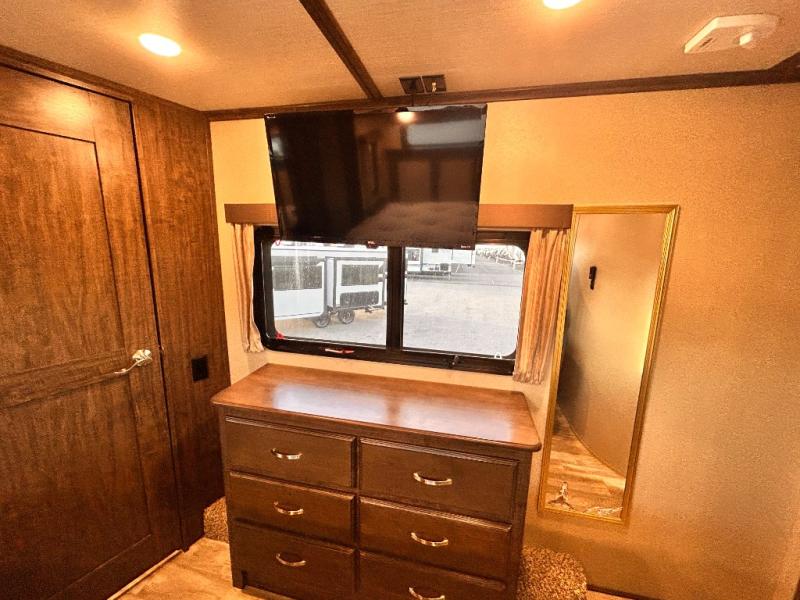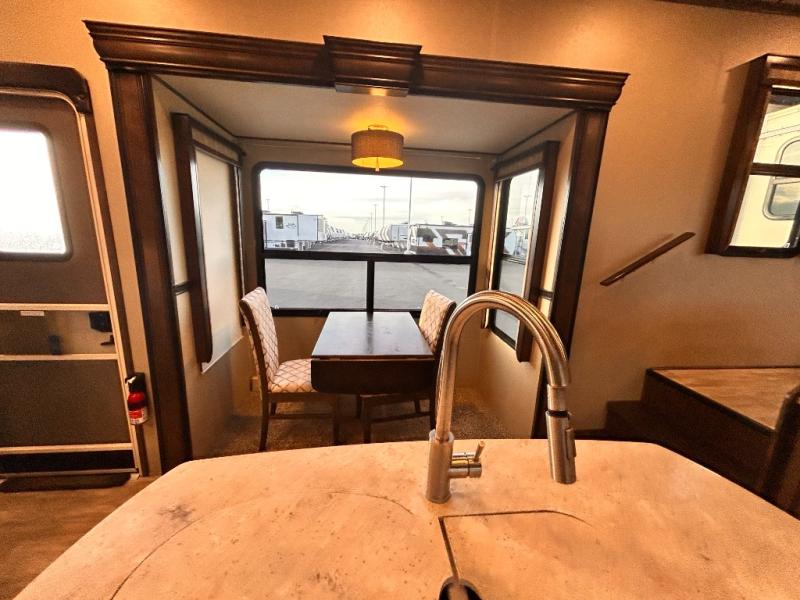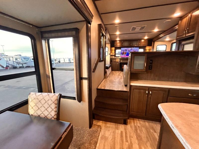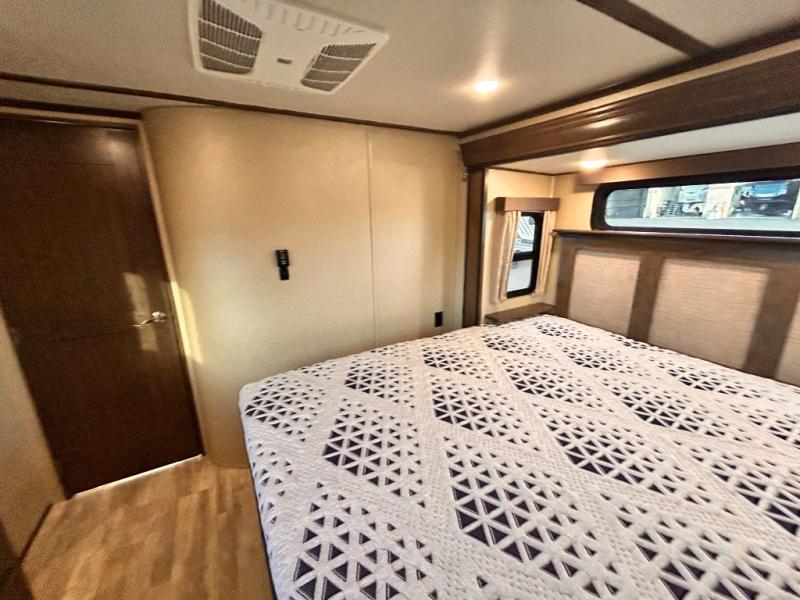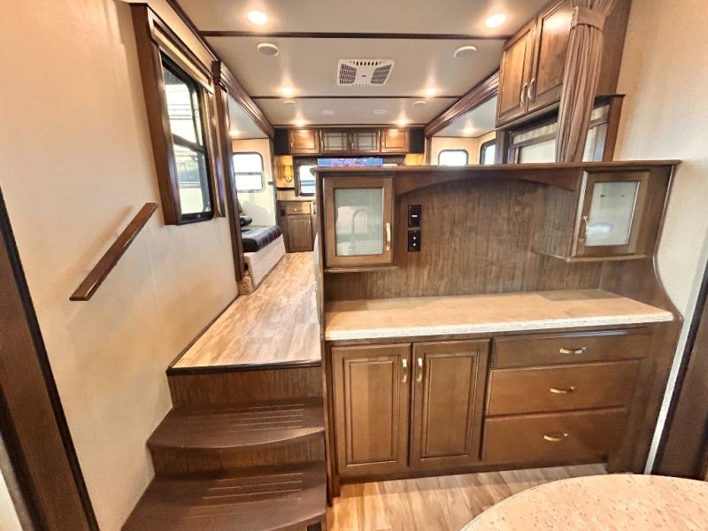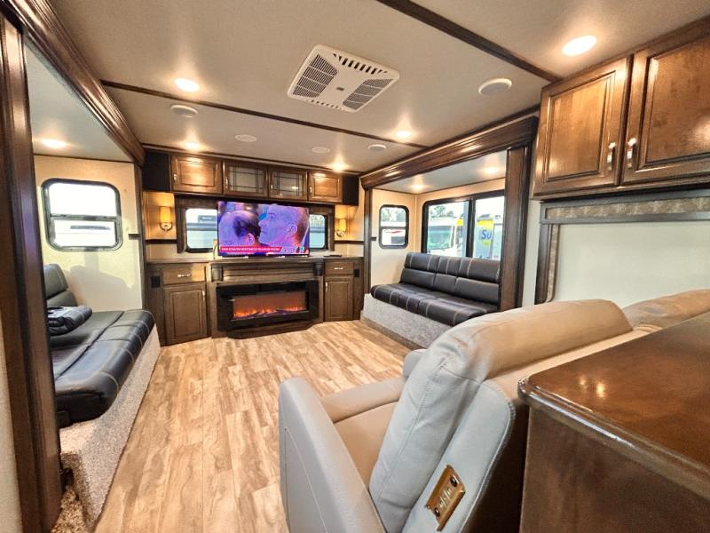 This Solitude 375RES fifth wheel allows you to travel with all the comforts of home including plenty of interior floor space to move around, extra sleeping space for the kids or grandkids, and plenty of storage for everything you might need for an extended stay. The unique exterior rear storage includes a sliding tray allowing easy access to the gear in the back. Inside, the front master bedroom will not disappoint with a pullout ottoman, flip-top dresser, and a TV to mention a few features. The cook will surely love making meals with the professional grade stainless steel cooktop, built-in oven and convection microwave. The popular kitchen island, stainless steel 18 cu. ft. four door refrigerator, and large pantry are sure to impress. The buffet adds additional counter space to serve food or place your keys and things. You might even decide to add a few options such as a washer and dryer to keep your clothes clean the whole time, a king size bed for more sleeping surface, or even a pull-out kitchen to make meals outdoors. There are many features and plenty of space for everyone!