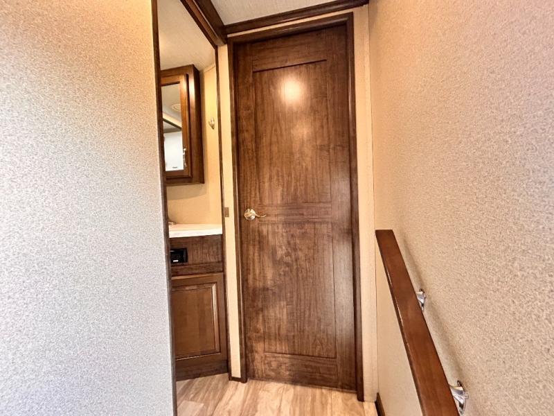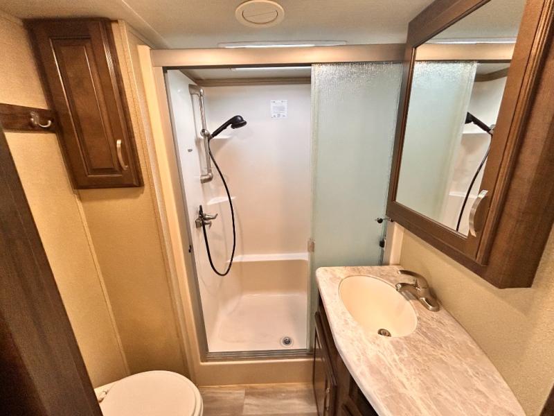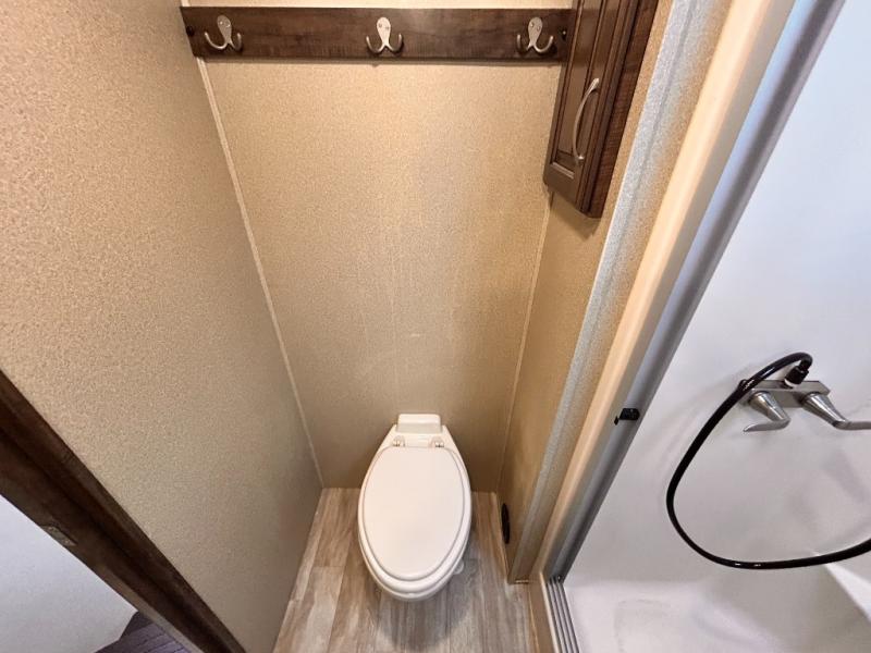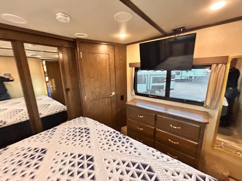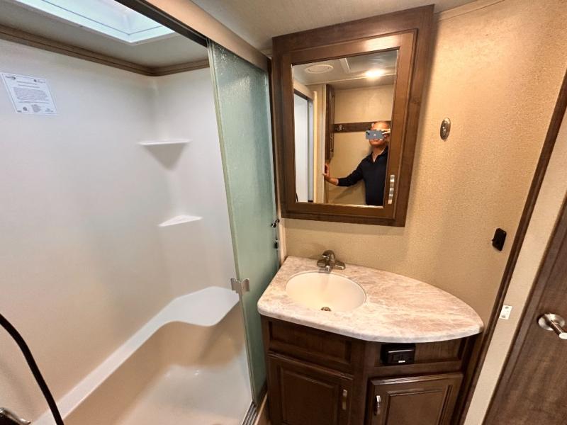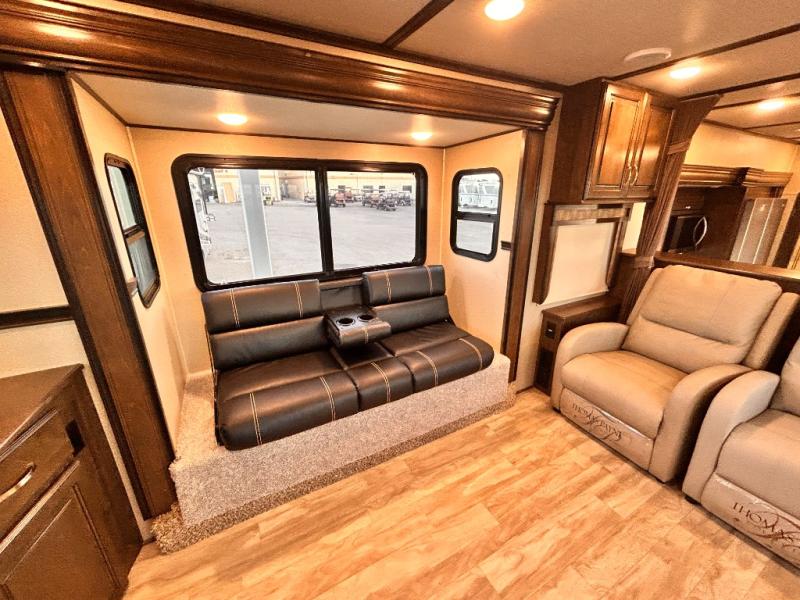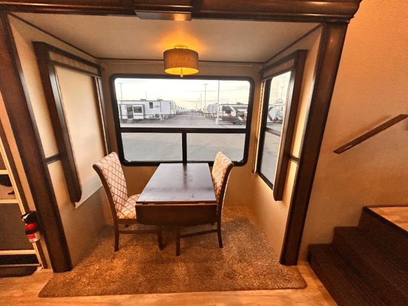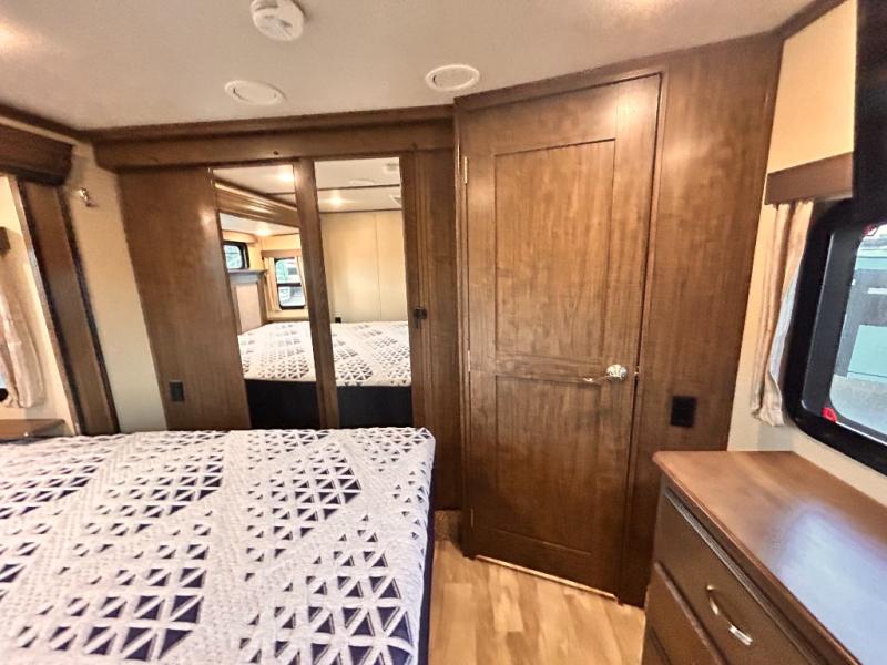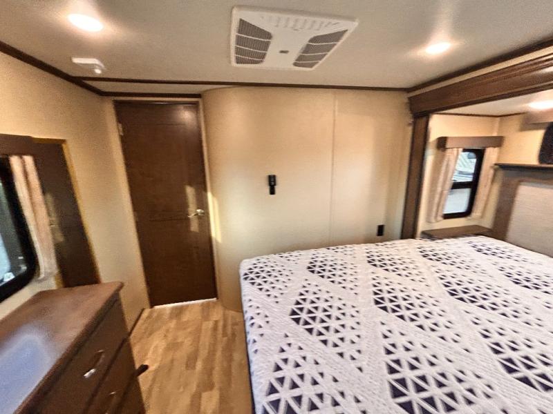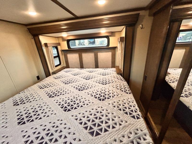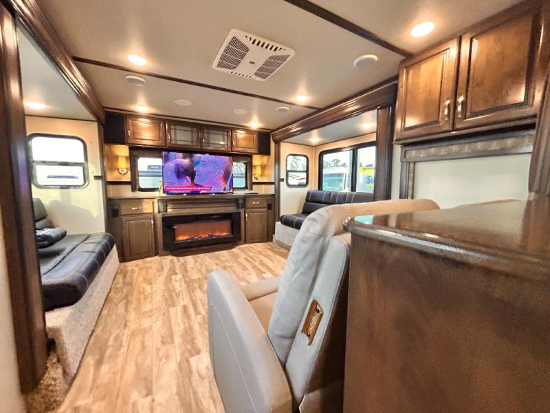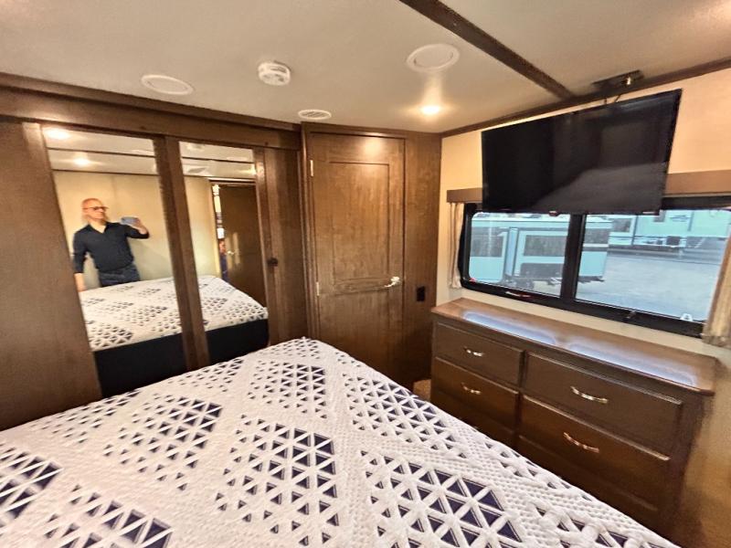 This Solitude 375RES fifth wheel allows you to travel with all the comforts of home including plenty of interior floor space to move around, extra sleeping space for the kids or grandkids, and plenty of storage for everything you might need for an extended stay. The unique exterior rear storage includes a sliding tray allowing easy access to the gear in the back. Inside, the front master bedroom will not disappoint with a pullout ottoman, flip-top dresser, and a TV to mention a few features. The cook will surely love making meals with the professional grade stainless steel cooktop, built-in oven and convection microwave. The popular kitchen island, stainless steel 18 cu. ft. four door refrigerator, and large pantry are sure to impress. The buffet adds additional counter space to serve food or place your keys and things. You might even decide to add a few options such as a washer and dryer to keep your clothes clean the whole time, a king size bed for more sleeping surface, or even a pull-out kitchen to make meals outdoors. There are many features and plenty of space for everyone!