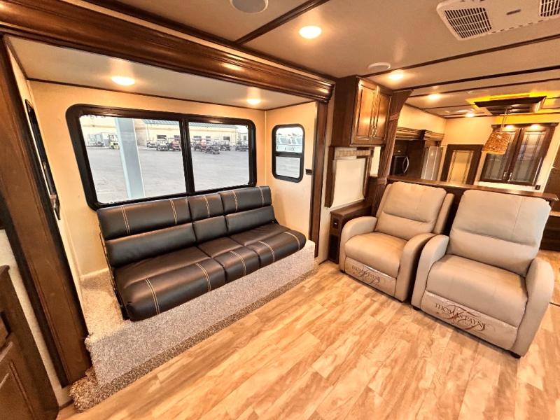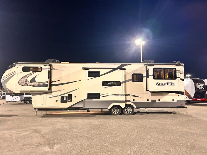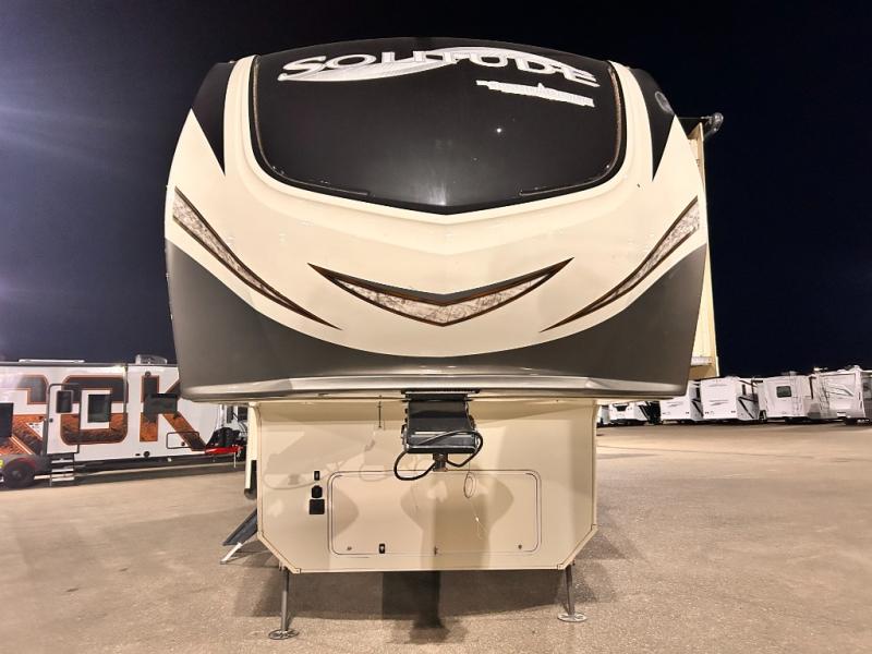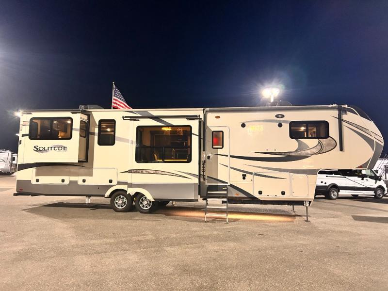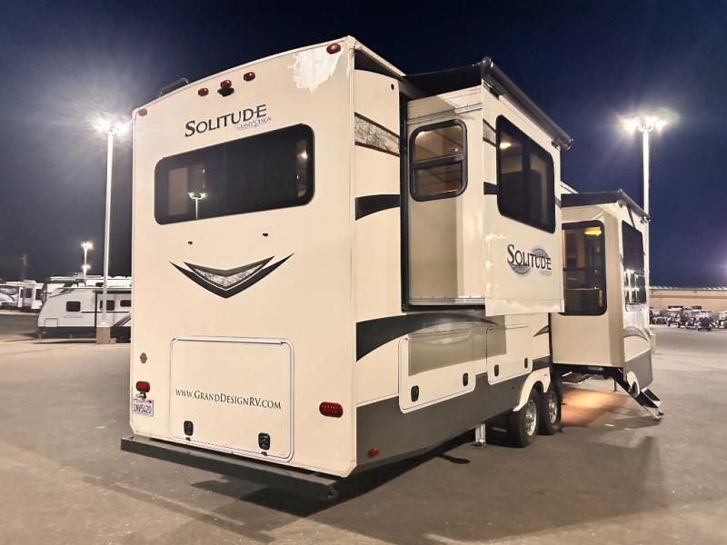 With each Solitude fifth wheel by Grand Design you will receive affordable luxury for your extended stays or weekend get-a-ways. From the solid foundation including a Equa-Flex suspension to the taller ceilings, taller and deeper cabinets, the power reclining theatre seating with swivel table including a heat and massage function, a pet dish drawer, a Stealth AC system, and the Weather-Tek package which allows you to travel any season you choose. It's time to enjoy luxury living where ever you decide to land.