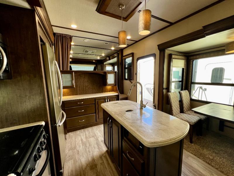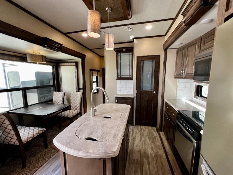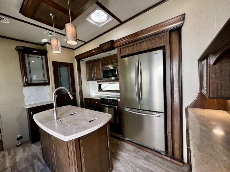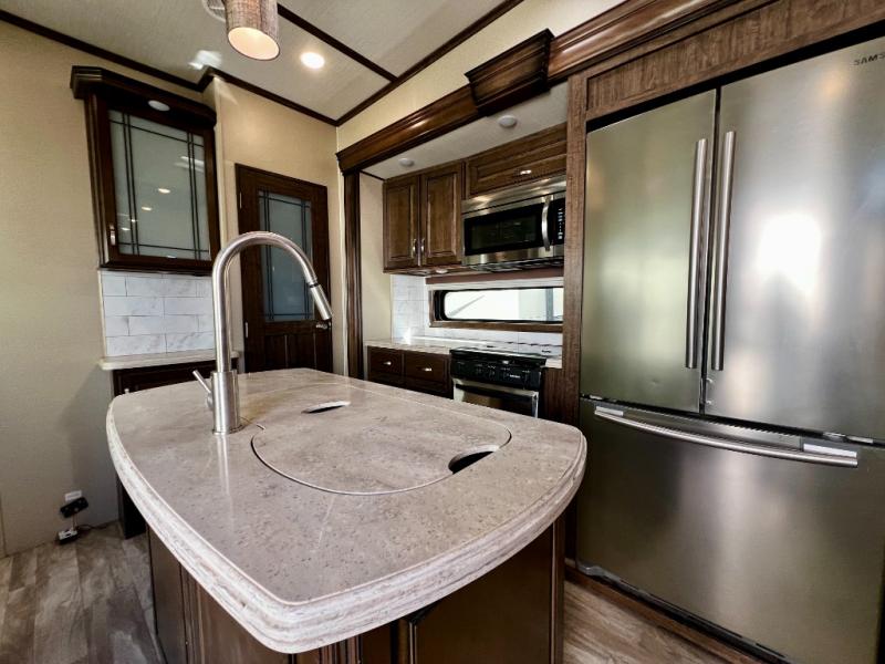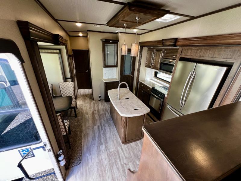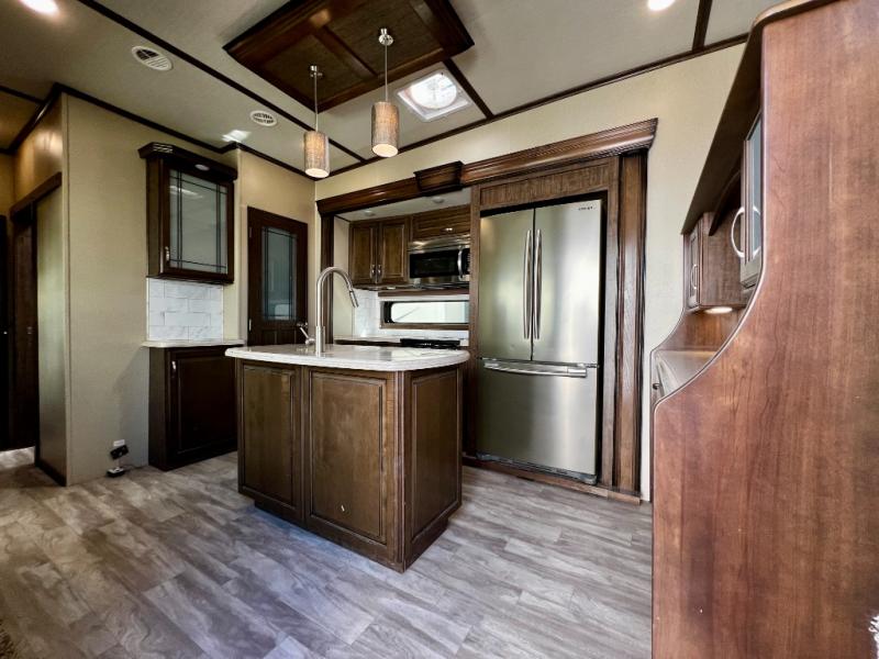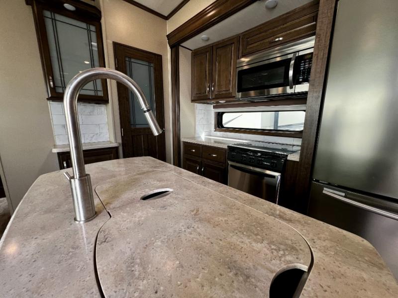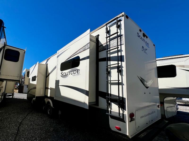 On the hunt for a full-time fifth wheel with all the comforts of home, plus some? This Solitude 379FLS R fifth wheel allows you to travel any season with plenty of floor space to move about, and storage almost everywhere you look, plus extra sleeping space for overnight guests. You will enjoy your own master bedroom with a pullout ottoman, a closet with drawers, a TV, and the second exterior entry door. If you like to make meals instead of eating fast food, the professional grade stainless steel cooktop, built-in oven and convection microwave will come in handy. You can stock up on food before heading out with the stainless steel 18 cu. ft. residential refrigerator and large pantry available to you. If you like, you may choose to add a washer and dryer to keep your clothes clean, and a king size bed for more sleeping surface.