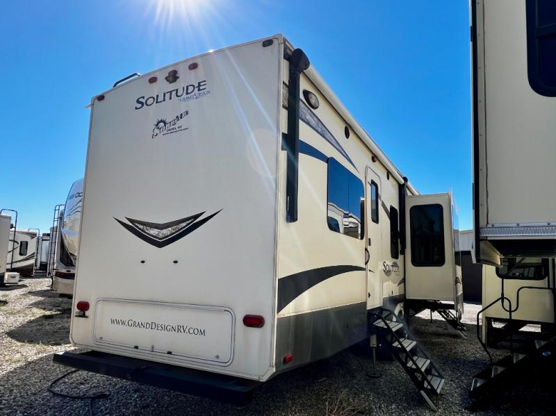 With each Solitude fifth wheel by Grand Design you will receive affordable luxury for your extended stays or weekend get-a-ways. From the solid foundation including a Equa-Flex suspension to the taller ceilings, taller and deeper cabinets, the power reclining theatre seating with swivel table including a heat and massage function, a pet dish drawer, a Stealth AC system, and the Weather-Tek package which allows you to travel any season you choose. It's time to enjoy luxury living where ever you decide to land.