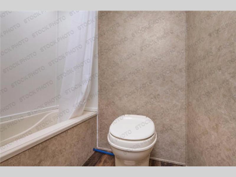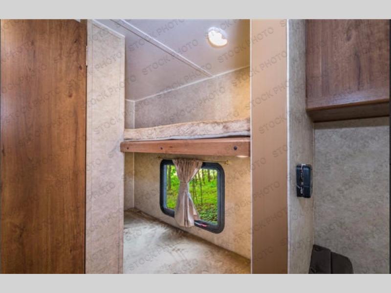 In the rear corner find a set of bunk beds that the kids will surely love. The opposite corner features a private tub/shower and toilet for added convenience.