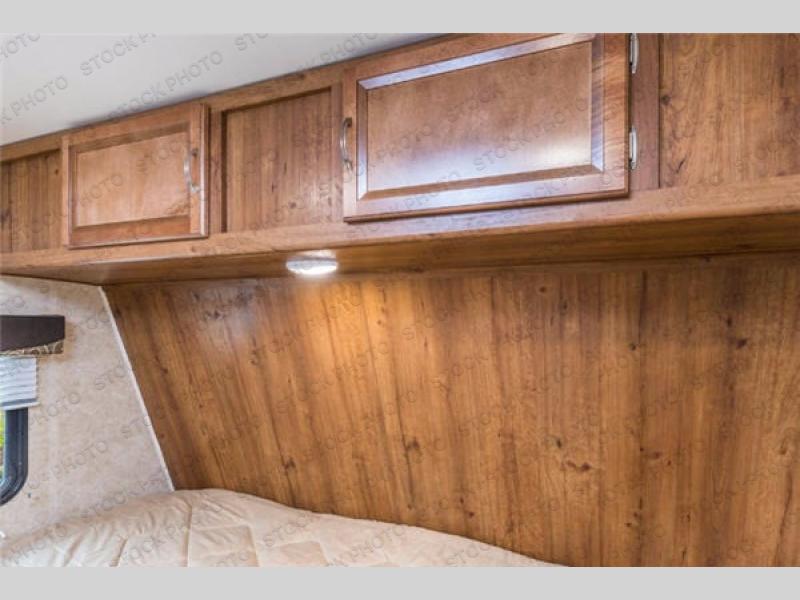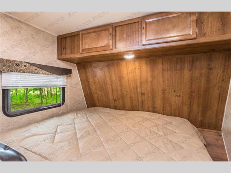To the right of the door there is a queen size bed with overhead storage that stretches the entire width of the trailer. This is perfect for mom and dad to get a great night's rest and be ready for a brand new day!