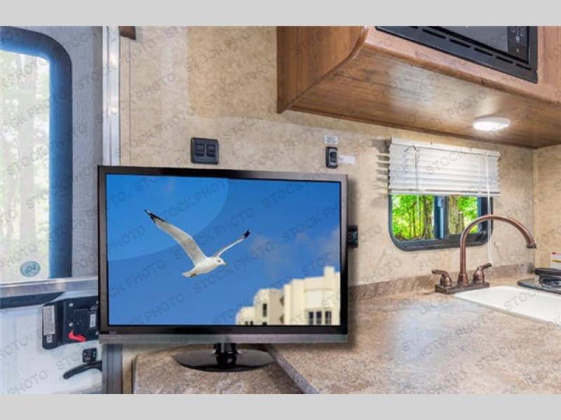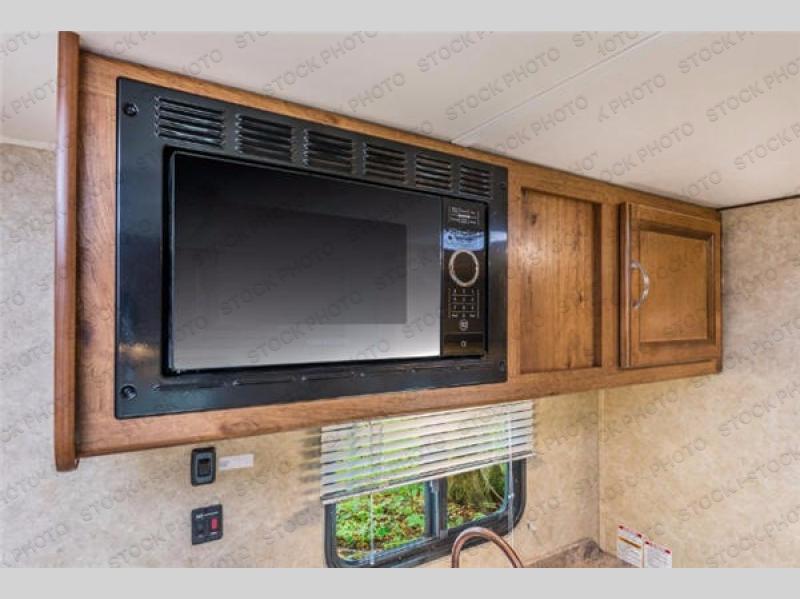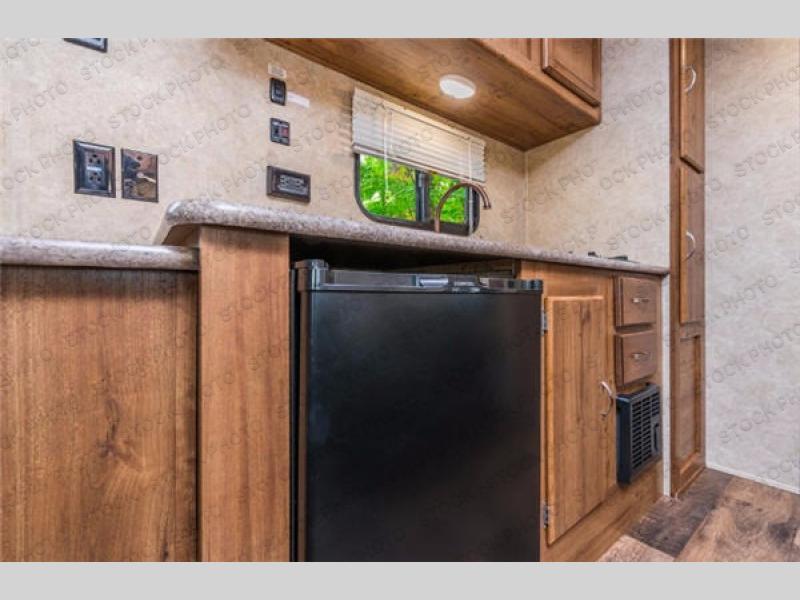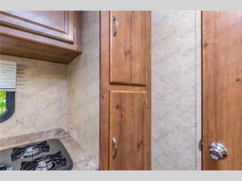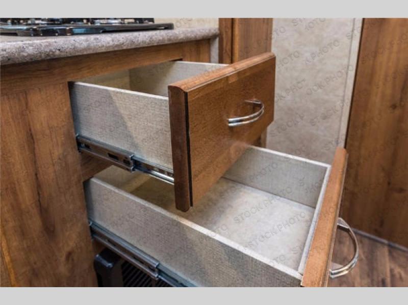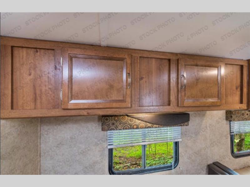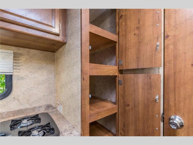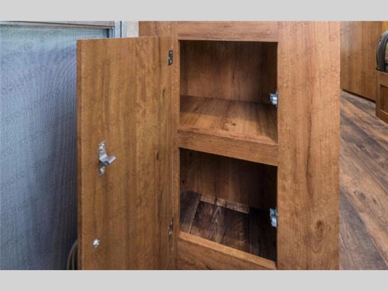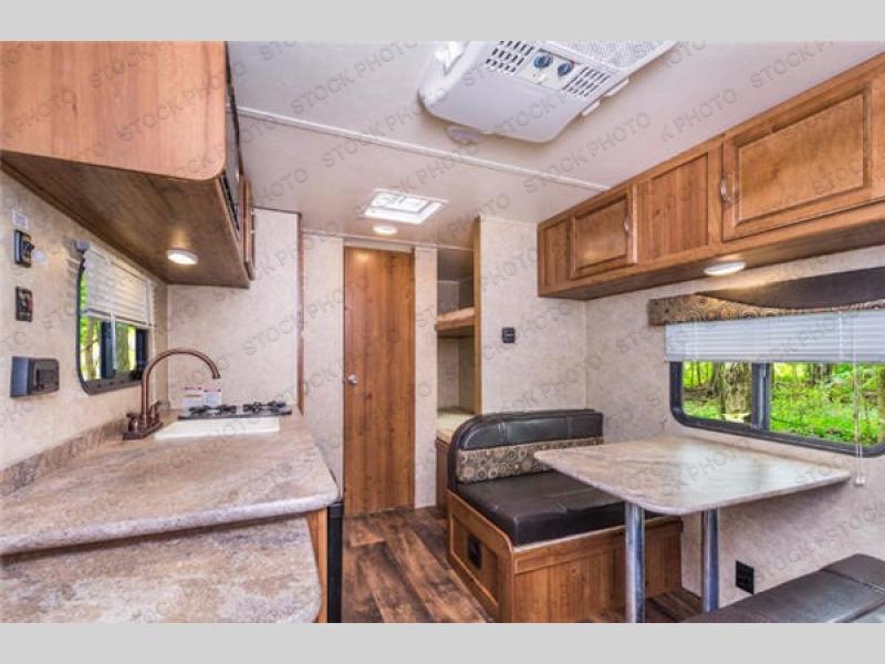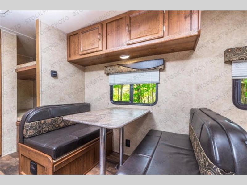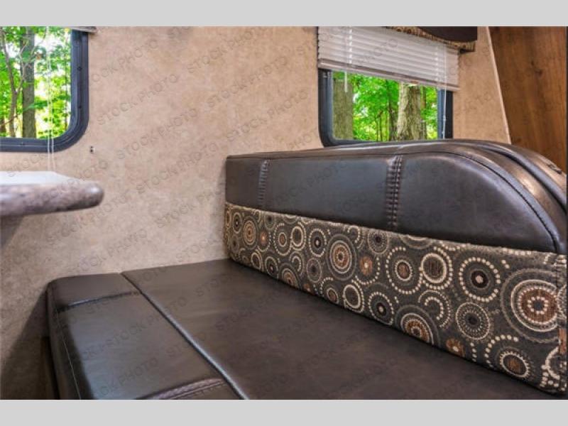 Step inside and notice the book case next to the countertop just inside the door on your left. Straight ahead you will find a booth dinette which is perfect for mealtime, or playing board games and cards. Plus, it offers overhead storage for your things. You can fold down the table in the evening to create more sleeping space if you need it.