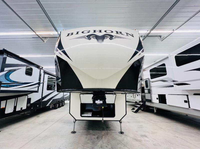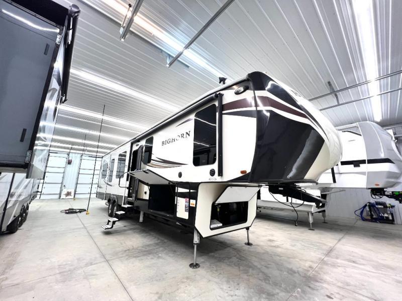 Are you ready for a luxury fifth wheel? Well, come check out any of the Bighorn models. The exteriors feature the largest amount of storage with 140 cu. ft. of storage for all of your gear. These models have an E-Z Flex suspension system by Dexter with quad shocks which offers the smoothest ride around! There is a heated and enclosed underbelly so you can easily camp in all types of weather. Along the rear and at the dinette you can enjoy the scenic view from the panoramic windows. Inside each model you will find glazed hardwood Sedona cabinetry plus Amish-crafted natural hardwood cabinet doors with hidden hinges and drawers. There are plenty of residential features such as the resilient flooring, the stainless steel sink with matching solid surface sink covers, and the 20" deep size drawers. Come make a Bighorn your home away from home!