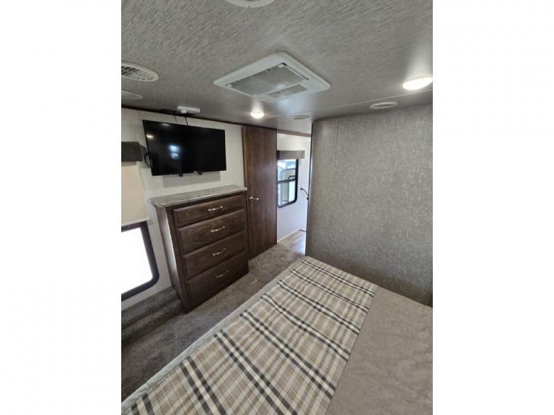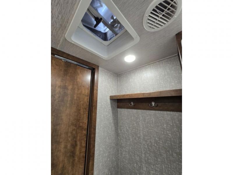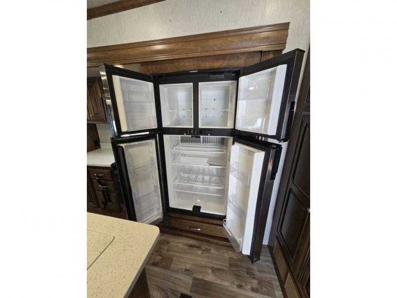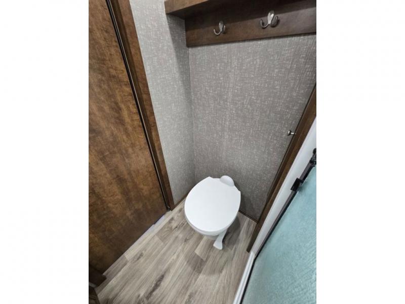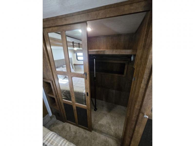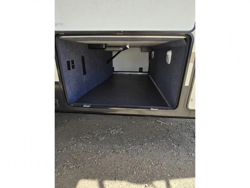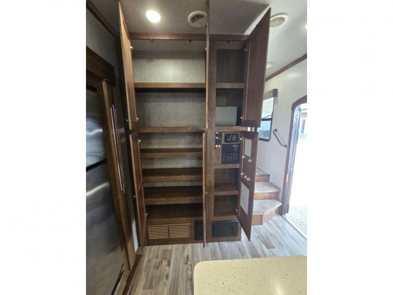 This Bighorn Traveler is the perfect couple's fifth wheel because of the king-size bed and large wardrobe in the master bedroom. You will find seating for yourself and your guests in the rear living area on the residential furniture with power massage or at the free-standing table with chairs. You can enjoy watching your favorite programs on the 50" LED TV while visiting with the cook who is preparing food on the kitchen island or washing dishes after meals. There is plenty of storage space located throughout the trailer, including inside of the massive exterior drop frame pass-through compartment.