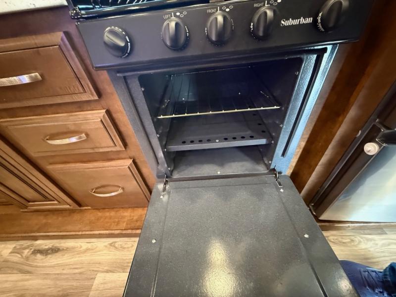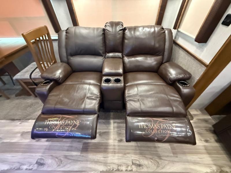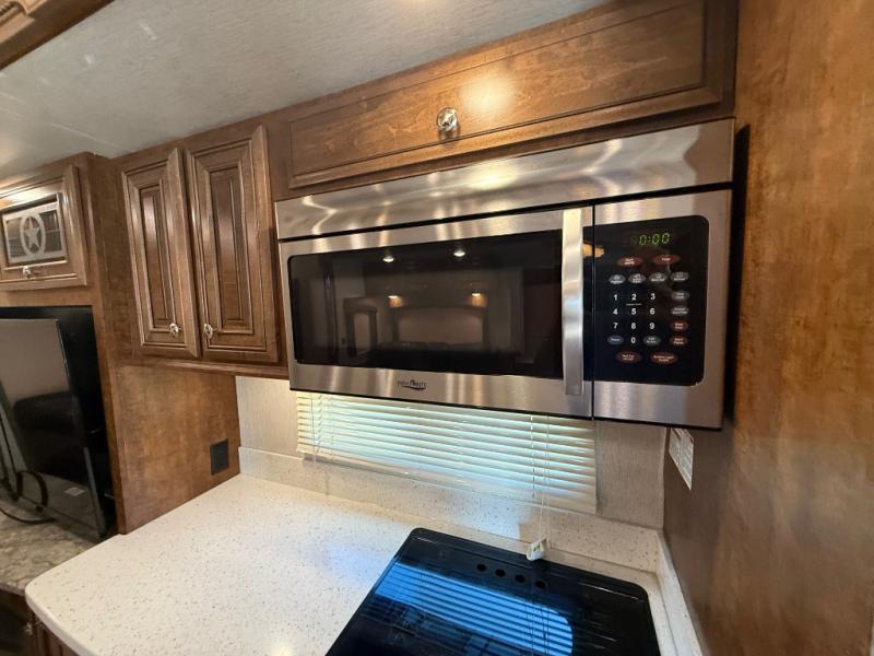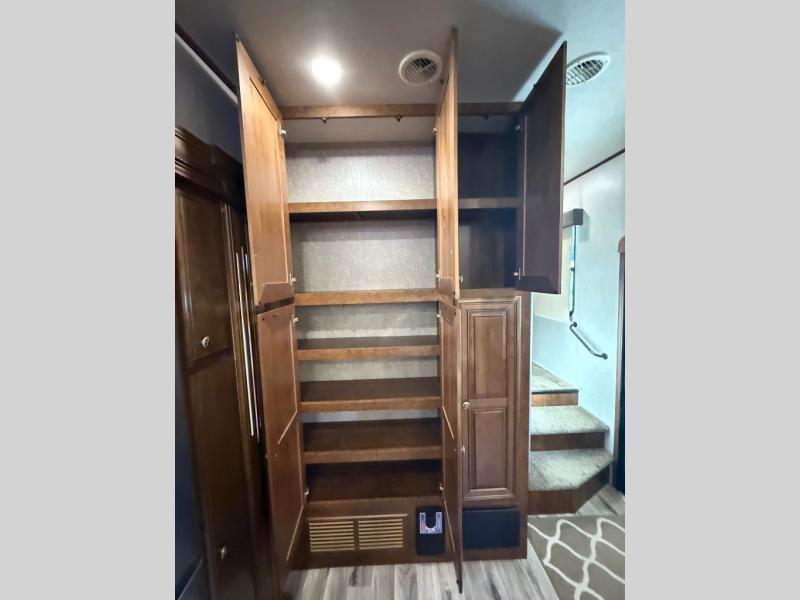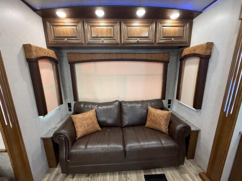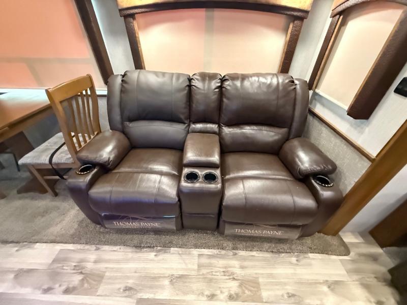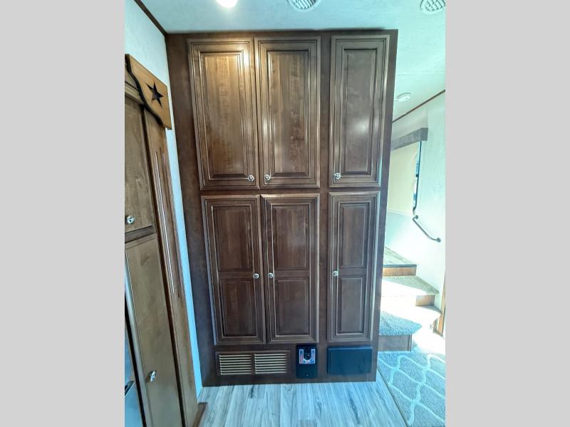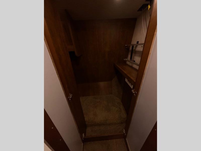 This Bighorn Traveler is the perfect couple's fifth wheel because of the king-size bed and large wardrobe in the master bedroom. You will find seating for yourself and your guests in the rear living area on the residential furniture with power massage or at the free-standing table with chairs. You can enjoy watching your favorite programs on the 50" LED TV while visiting with the cook who is preparing food on the kitchen island or washing dishes after meals. There is plenty of storage space located throughout the trailer, including inside of the massive exterior drop frame pass-through compartment.
