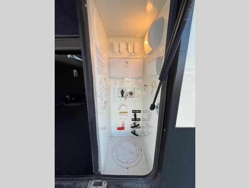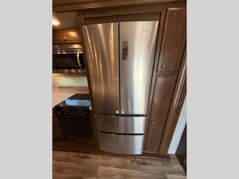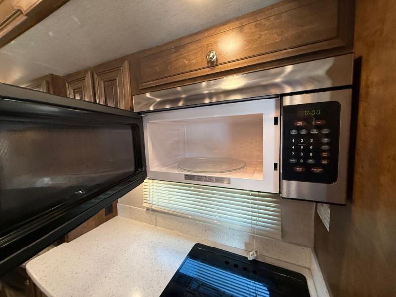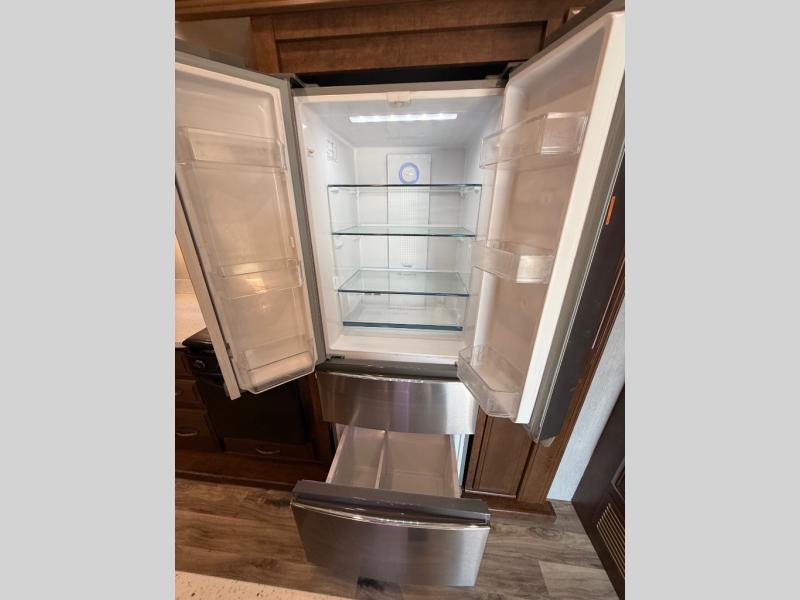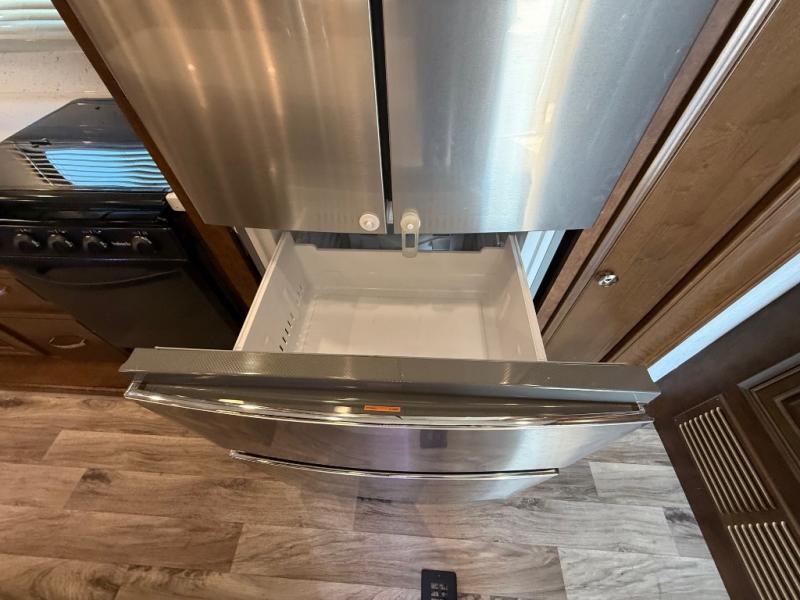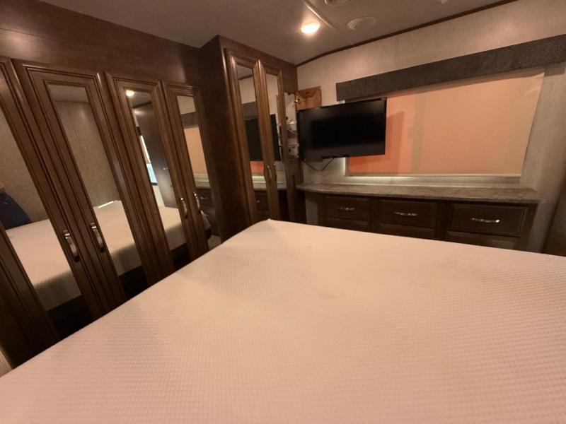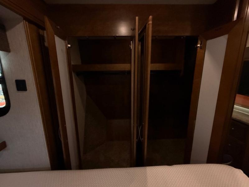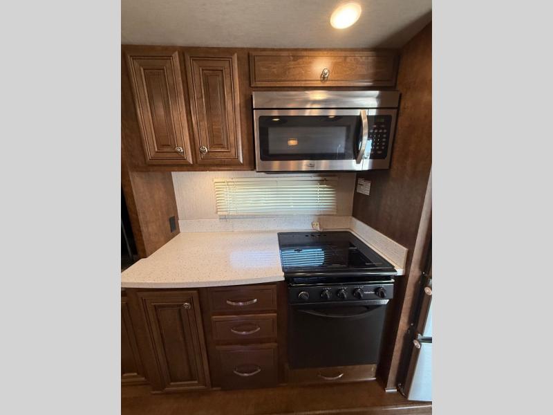 This Bighorn Traveler is the perfect couple's fifth wheel because of the king-size bed and large wardrobe in the master bedroom. You will find seating for yourself and your guests in the rear living area on the residential furniture with power massage or at the free-standing table with chairs. You can enjoy watching your favorite programs on the 50" LED TV while visiting with the cook who is preparing food on the kitchen island or washing dishes after meals. There is plenty of storage space located throughout the trailer, including inside of the massive exterior drop frame pass-through compartment.