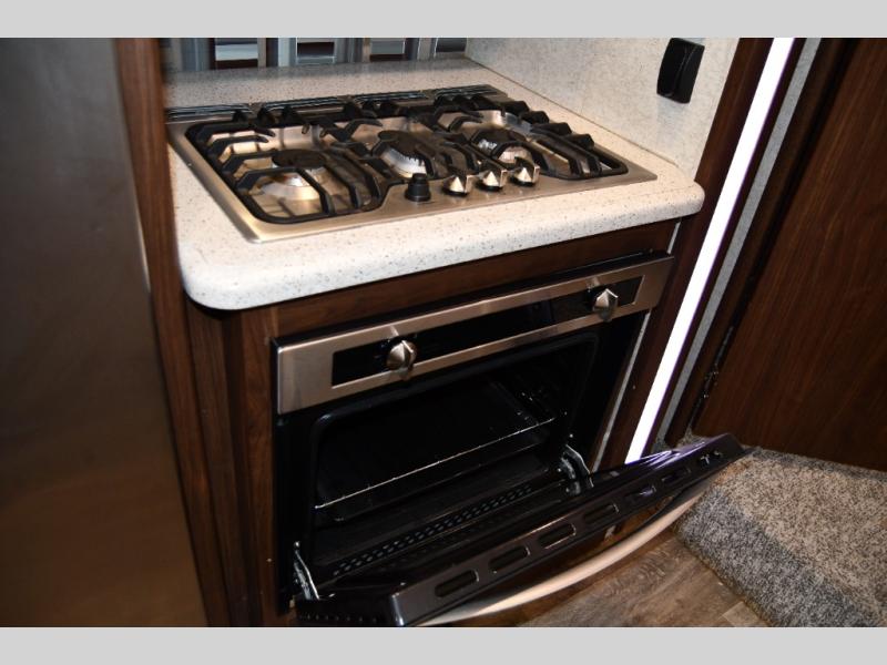 Inside, you’ll find a thoughtfully designed interior that blends durability with upscale comfort. The open living area features plush seating, solid-surface countertops, and an inviting entertainment center—ideal for relaxing after a long day outdoors. The fully equipped kitchen offers ample storage, residential-style appliances, and generous prep space, so meals on the road feel just like home.