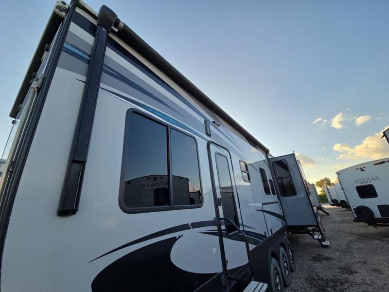 The Cyclone toy hauler fifth wheels by Heartland RV are not your ordinary toy hauler. These models have beautiful cabinets and plenty of comforts throughout such as high quality residential furniture, a 55” LCD HDTV flat screen TV, cable TV and satellite hook-ups, plus a separate DVD/CD/MP3 Bluetooth stereo for the garage and exterior. Along the exterior there are stunning graphics and you will enjoy the view out of the large bedroom picture windows. The two side awnings with LED lights provide plenty of shade during the day, and at night you can grab a snack, your camp chair, and enjoy visiting outdoors just a bit longer. The ultra-light ramp door allows you to easily load your off road toys. In the garage you will also find an electric rear screen, decorative chair rail, plus built-in overhead cabinets with an entertainment center and more! You may even want to add the S5 Package which includes a 2nd fuel cell, 40" garage TV, solid surface counter top in the bedroom, central vacuum, 32" bedroom TV, and upgraded furniture with USB ports and built-in tables.