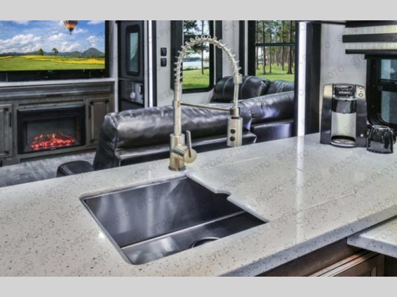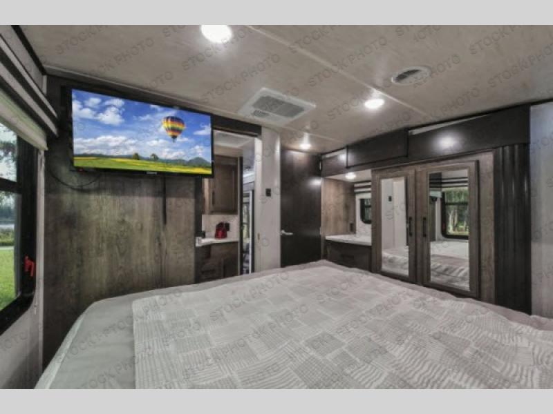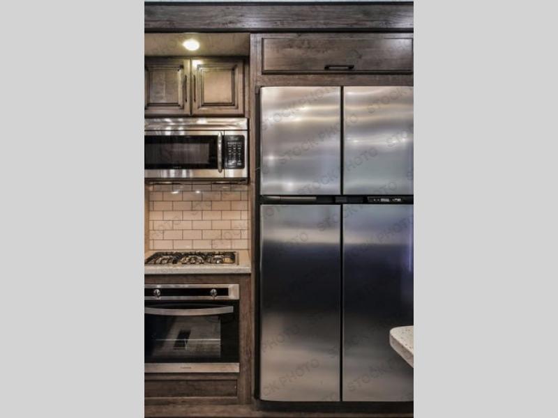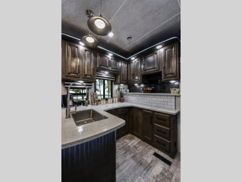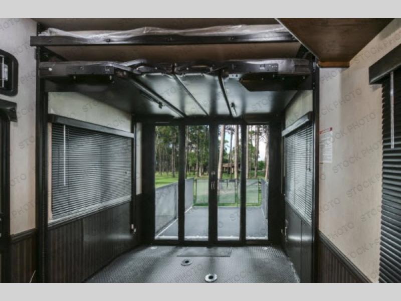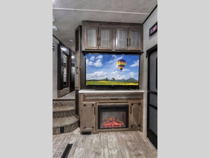 The Cyclone toy hauler fifth wheels by Heartland RV are not your ordinary toy hauler. These models have beautiful cabinets and plenty of comforts throughout such as high quality residential furniture, a 55” LCD HDTV flat screen TV, cable TV and satellite hook-ups, plus a separate DVD/CD/MP3 Bluetooth stereo for the garage and exterior. Along the exterior there are stunning graphics and you will enjoy the view out of the large bedroom picture windows. The two side awnings with LED lights provide plenty of shade during the day, and at night you can grab a snack, your camp chair, and enjoy visiting outdoors just a bit longer. The ultra-light ramp door allows you to easily load your off road toys. In the garage you will also find an electric rear screen, decorative chair rail, plus built-in overhead cabinets with an entertainment center and more! You may even want to add the S5 Package which includes a 2nd fuel cell, 40" garage TV, solid surface counter top in the bedroom, central vacuum, 32" bedroom TV, and upgraded furniture with USB ports and built-in tables.
