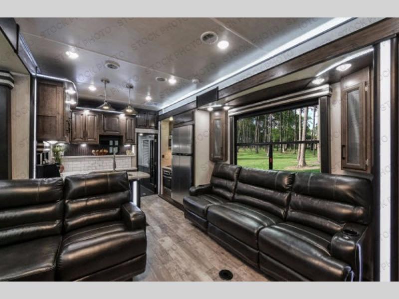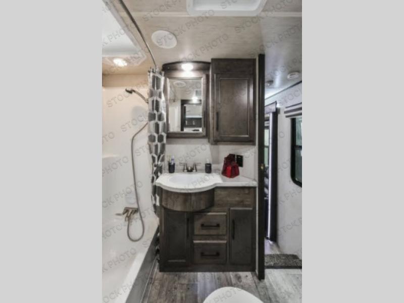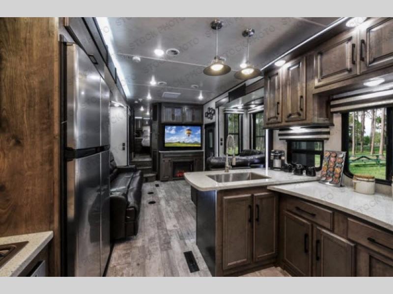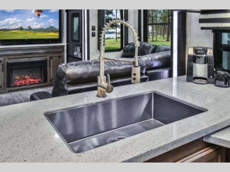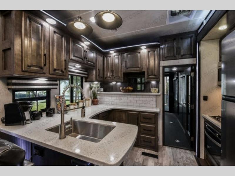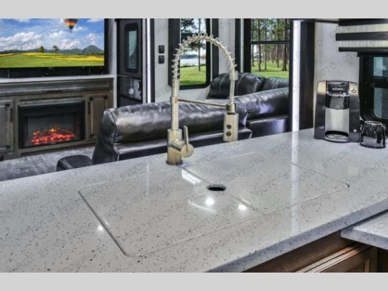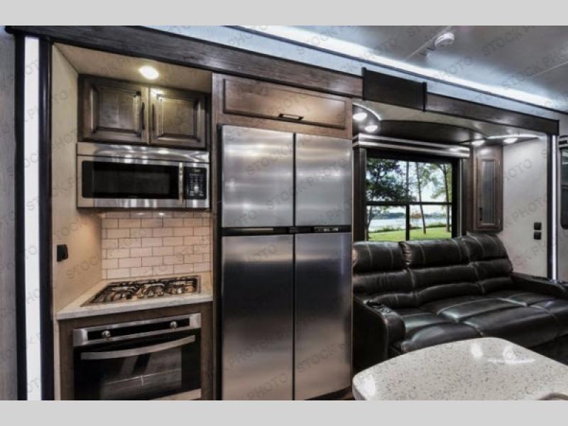 The Cyclone toy hauler fifth wheels by Heartland RV are not your ordinary toy hauler. These models have beautiful cabinets and plenty of comforts throughout such as high quality residential furniture, a 55” LCD HDTV flat screen TV, cable TV and satellite hook-ups, plus a separate DVD/CD/MP3 Bluetooth stereo for the garage and exterior. Along the exterior there are stunning graphics and you will enjoy the view out of the large bedroom picture windows. The two side awnings with LED lights provide plenty of shade during the day, and at night you can grab a snack, your camp chair, and enjoy visiting outdoors just a bit longer. The ultra-light ramp door allows you to easily load your off road toys. In the garage you will also find an electric rear screen, decorative chair rail, plus built-in overhead cabinets with an entertainment center and more! You may even want to add the S5 Package which includes a 2nd fuel cell, 40" garage TV, solid surface counter top in the bedroom, central vacuum, 32" bedroom TV, and upgraded furniture with USB ports and built-in tables.