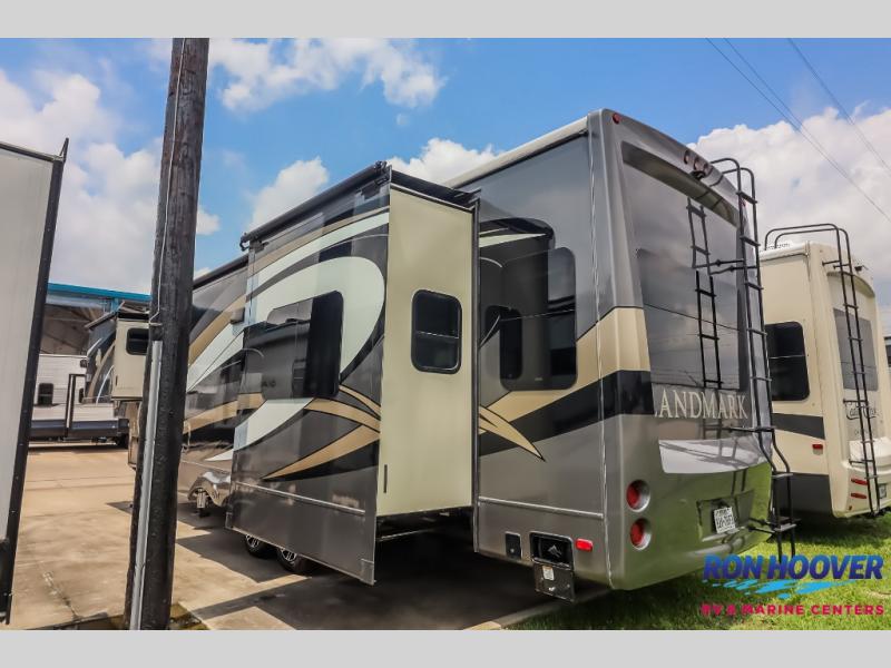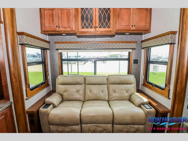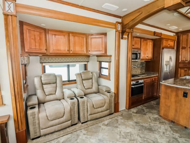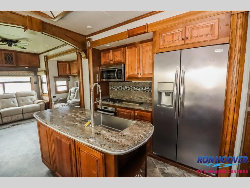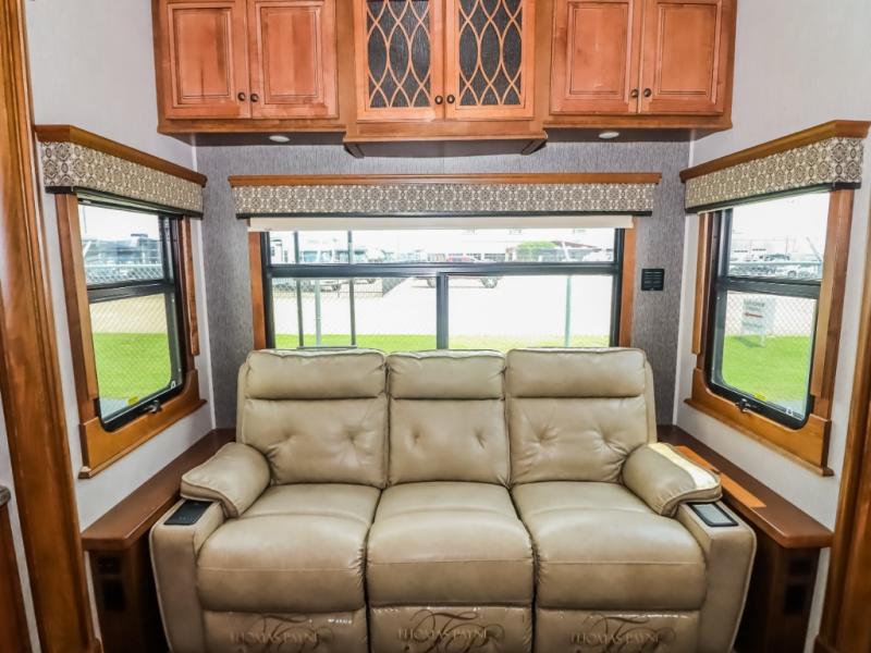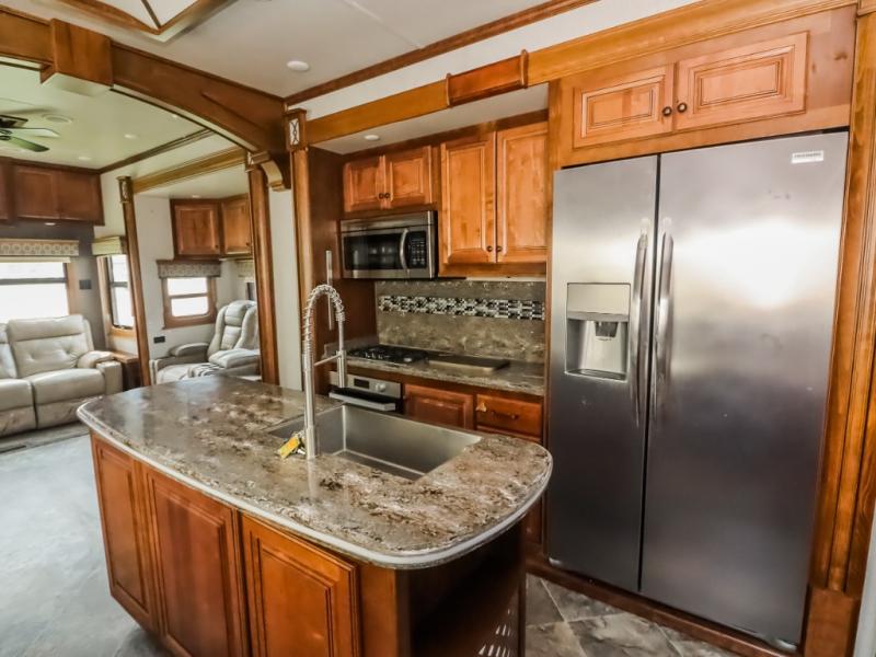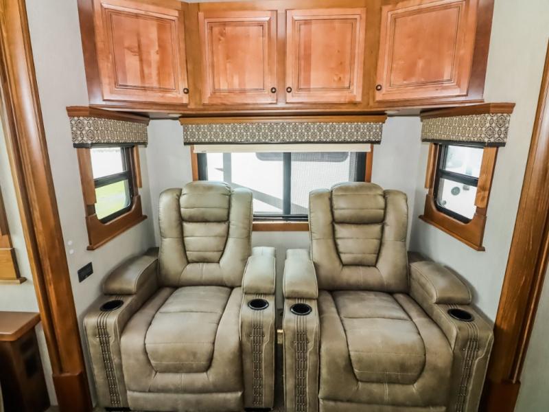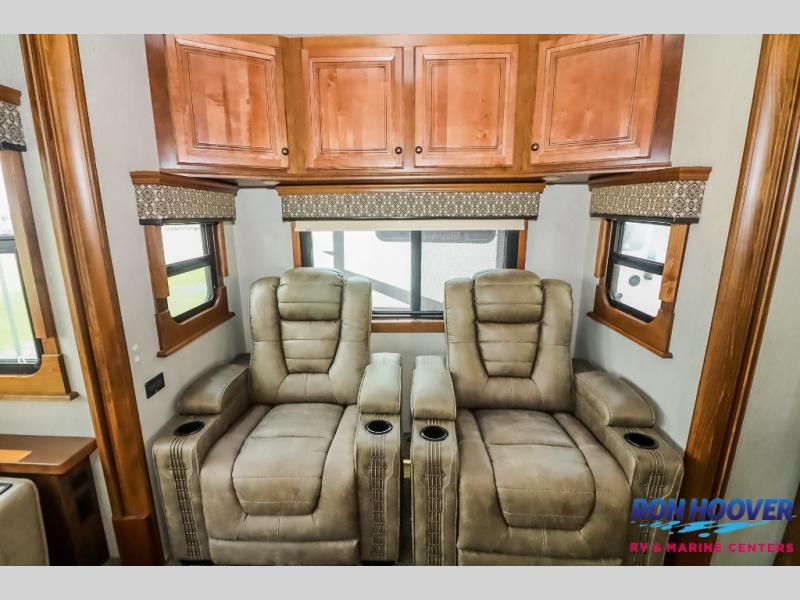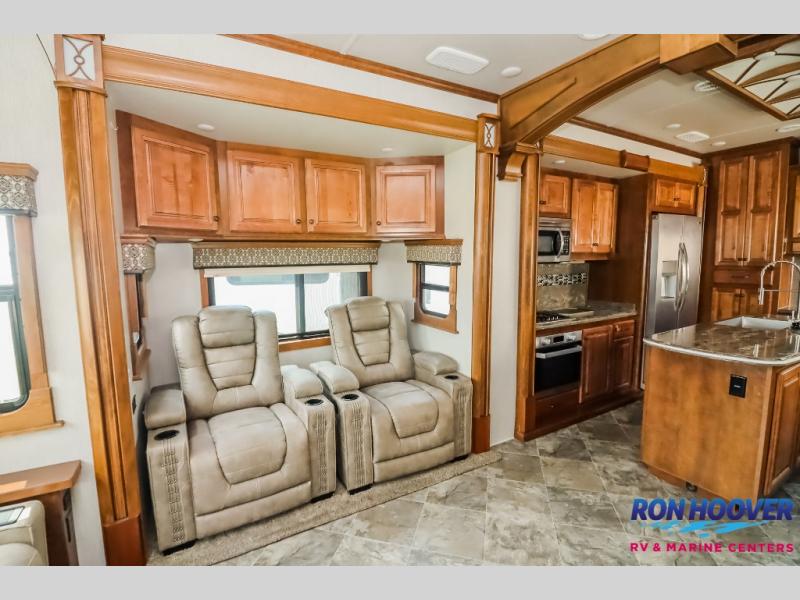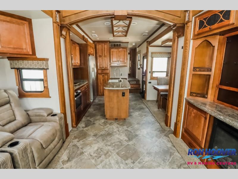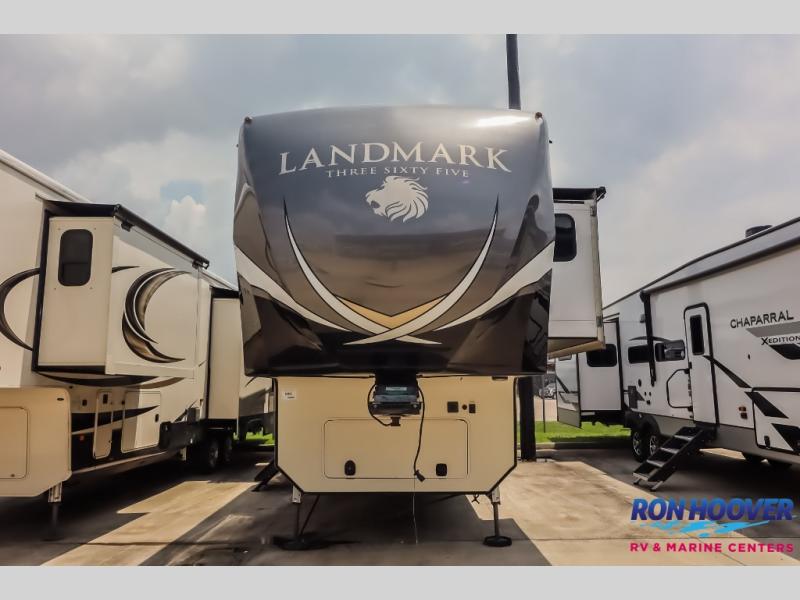 When you are ready to begin your next vacation, choose this Heartland Landark 365 Charleston fifth wheel. This model can easily be your home away from home. You will enjoy plenty of interior space throughout this fifth wheel with five slide outs, with four of the slide outs being located in the living room and kitchen! In the evening, you can relax in the living room while watching TV and reclining in the power theater seats or on the sofa. In the kitchen, you will find an at-home touch with the edge lit solid surface countertops.