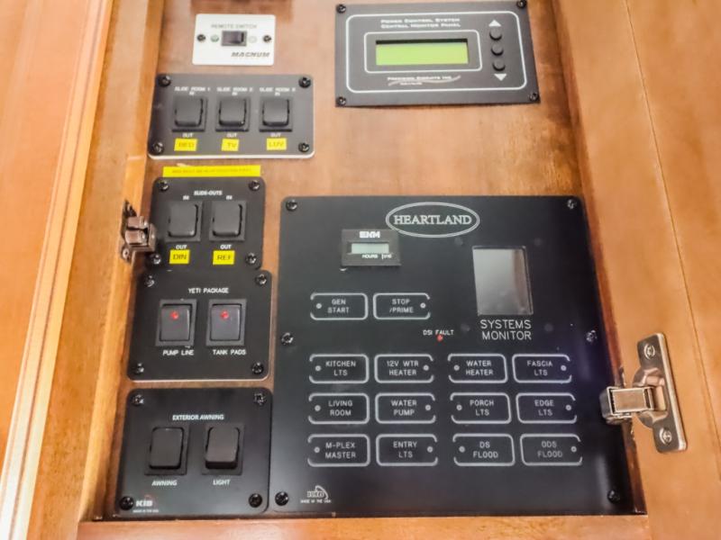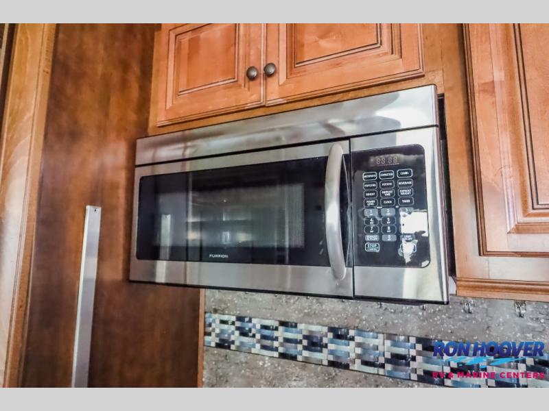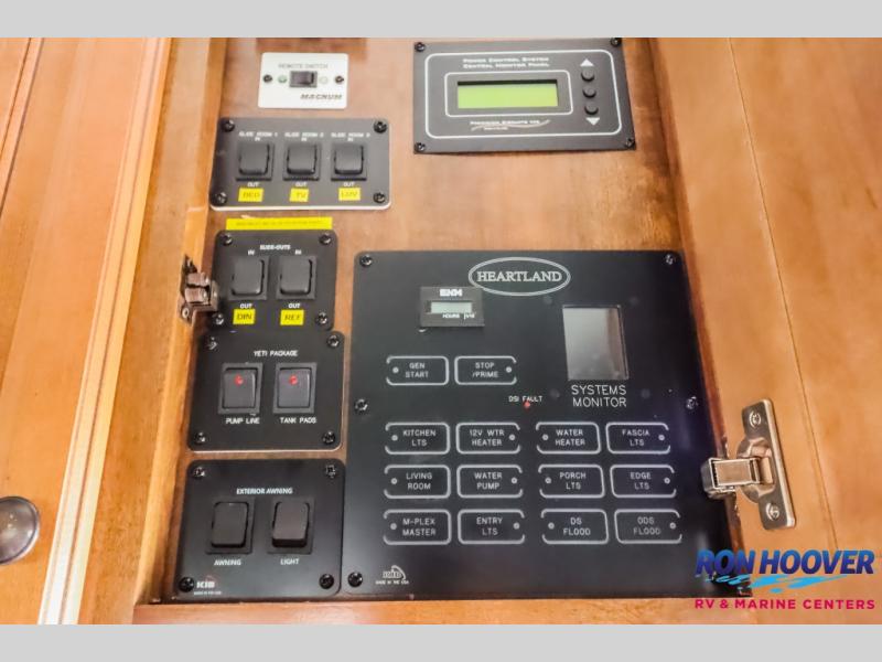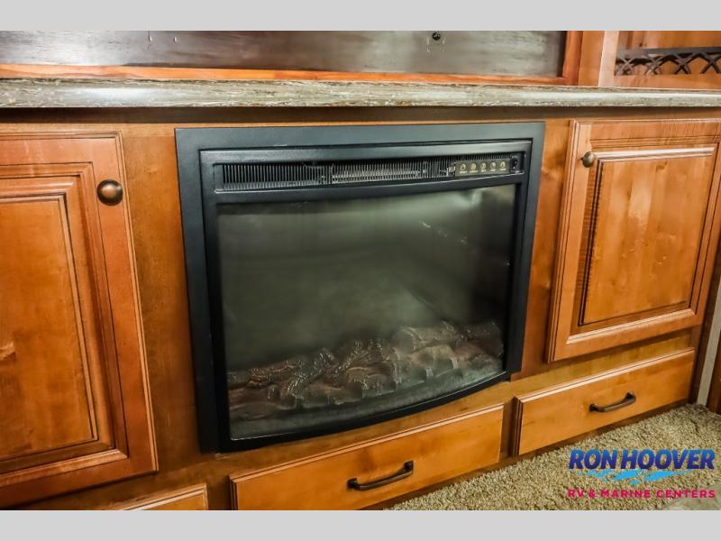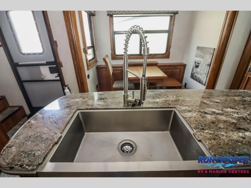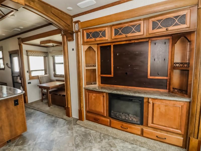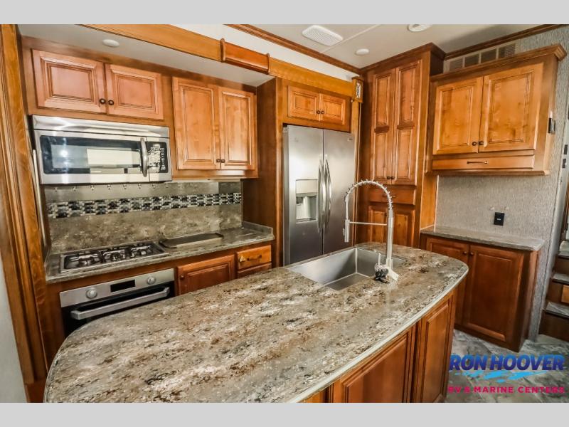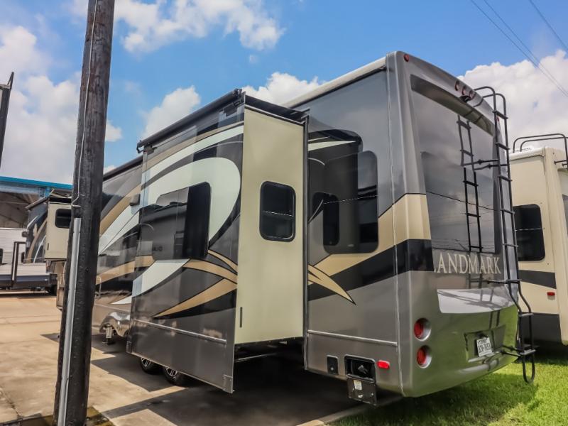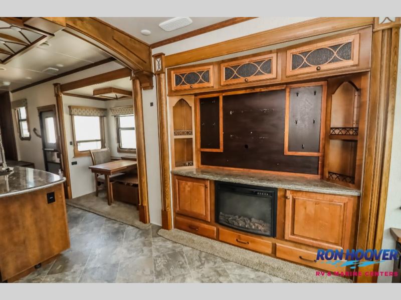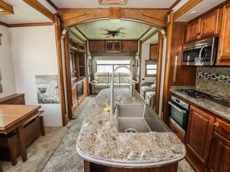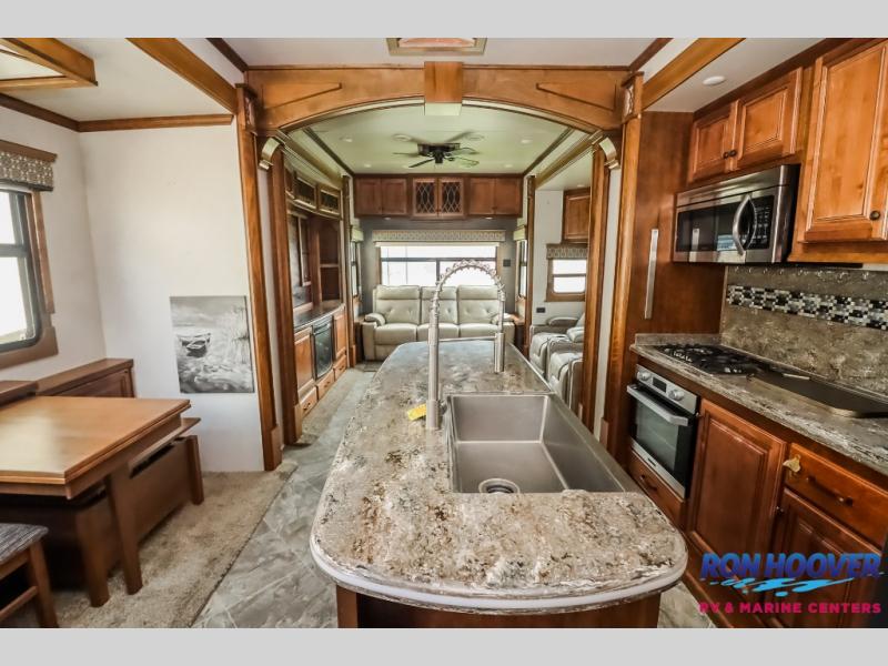 When you are ready to begin your next vacation, choose this Heartland Landark 365 Charleston fifth wheel. This model can easily be your home away from home. You will enjoy plenty of interior space throughout this fifth wheel with five slide outs, with four of the slide outs being located in the living room and kitchen! In the evening, you can relax in the living room while watching TV and reclining in the power theater seats or on the sofa. In the kitchen, you will find an at-home touch with the edge lit solid surface countertops.