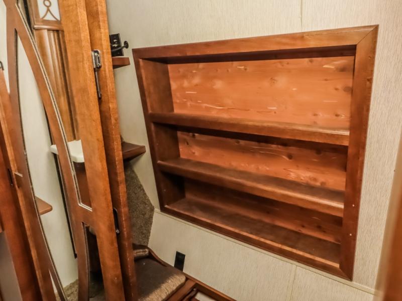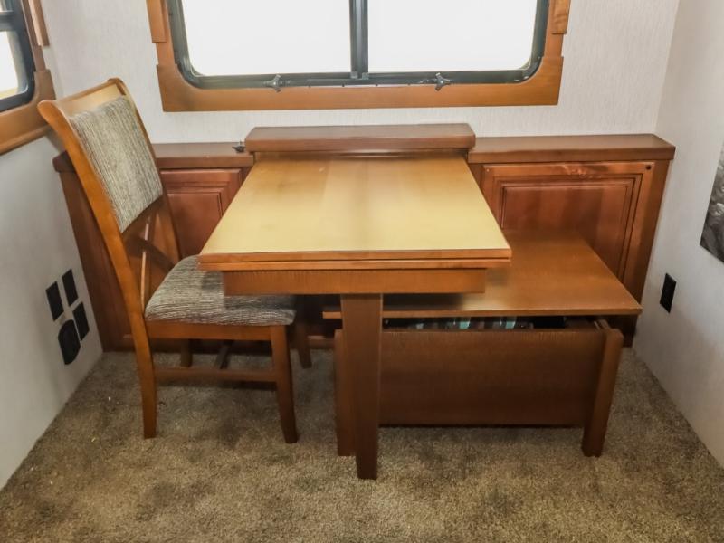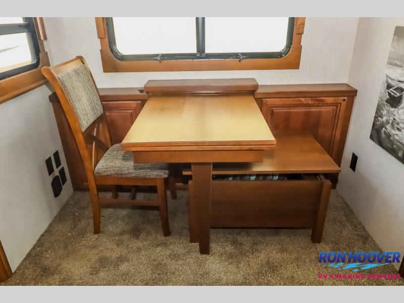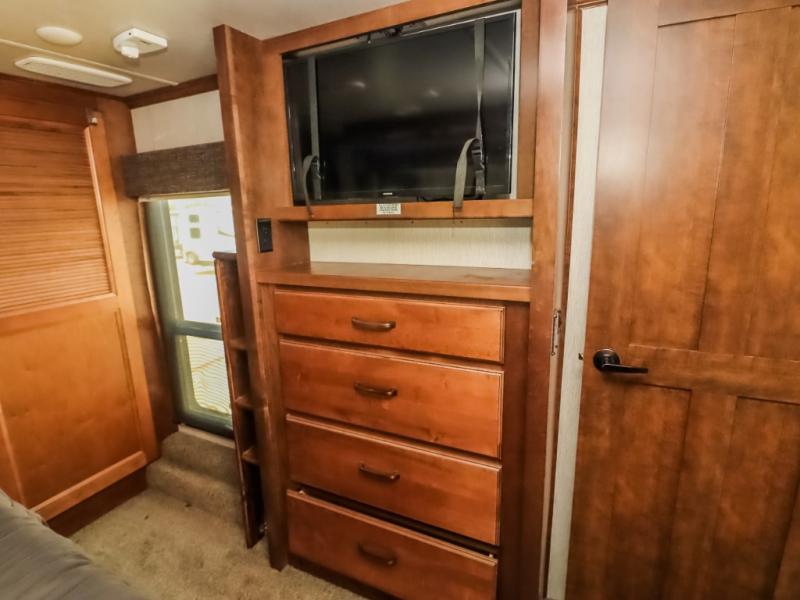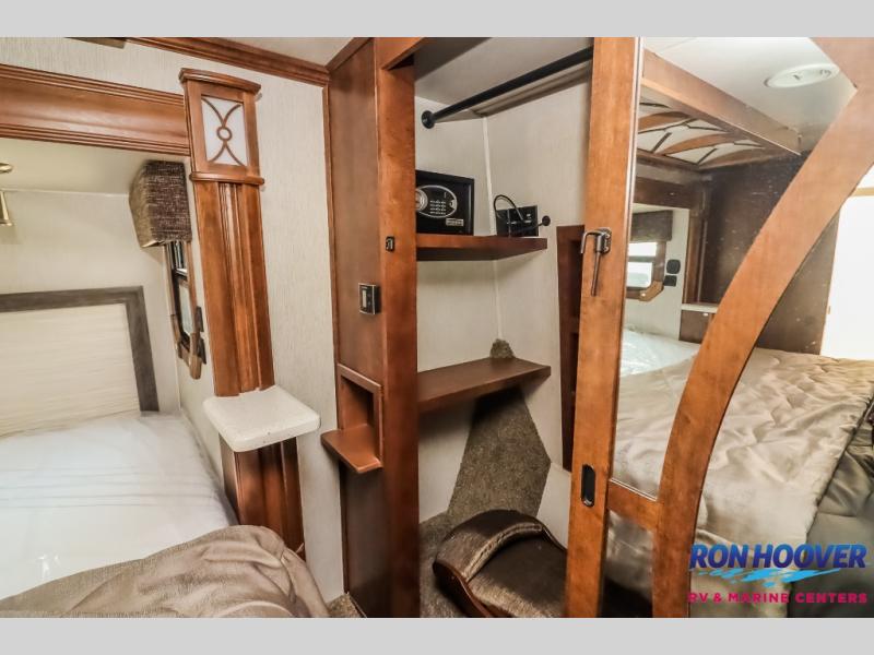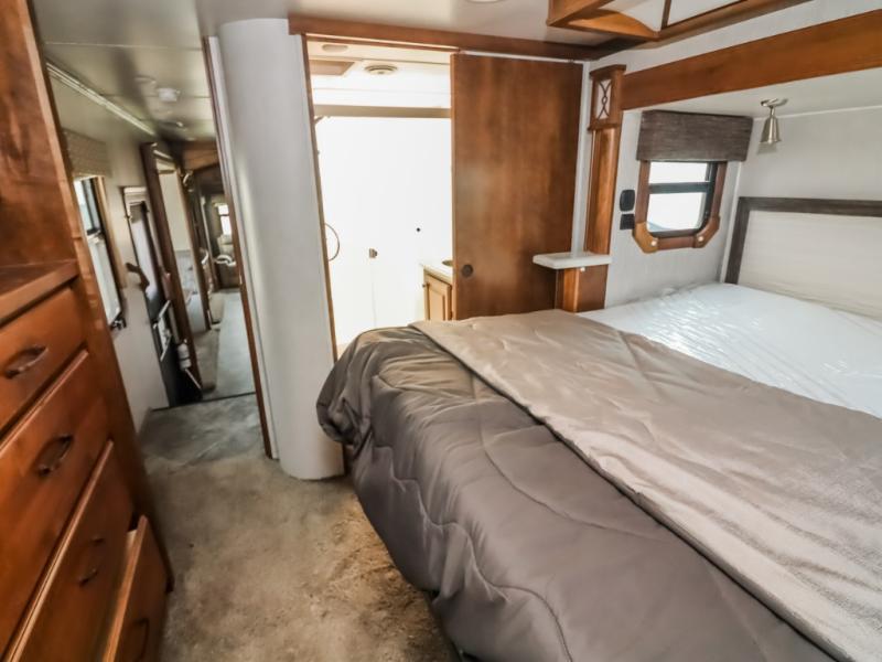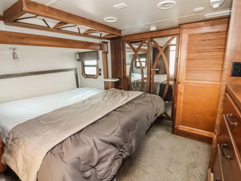 What I liked most: The living area has great view from all angles as long as you are on the couches. The raised ceilings give this fifth wheel a breathable atmosphere. The bedroom has more than enough storage.