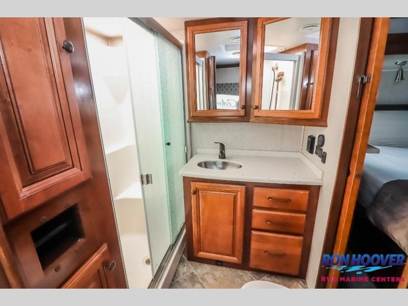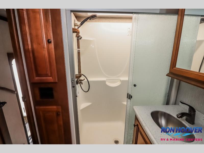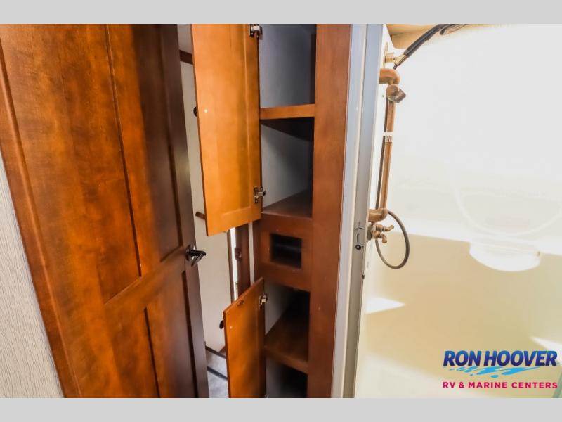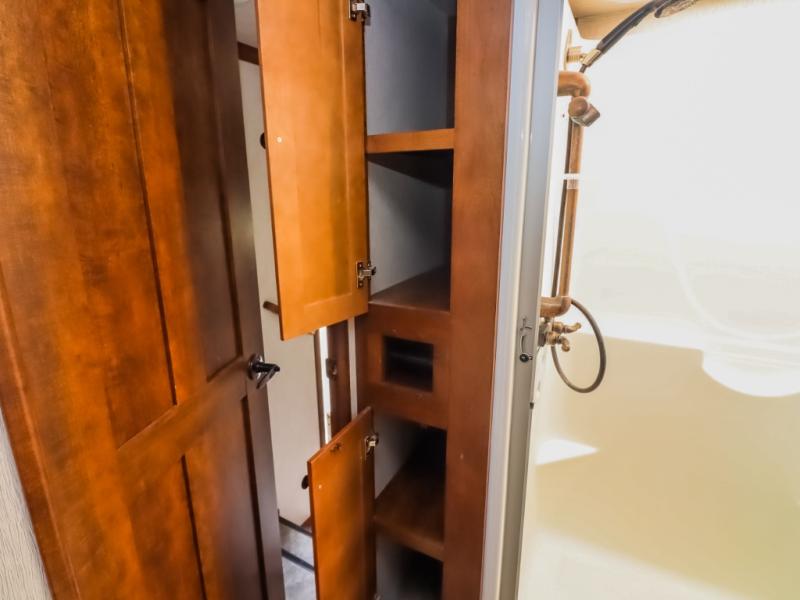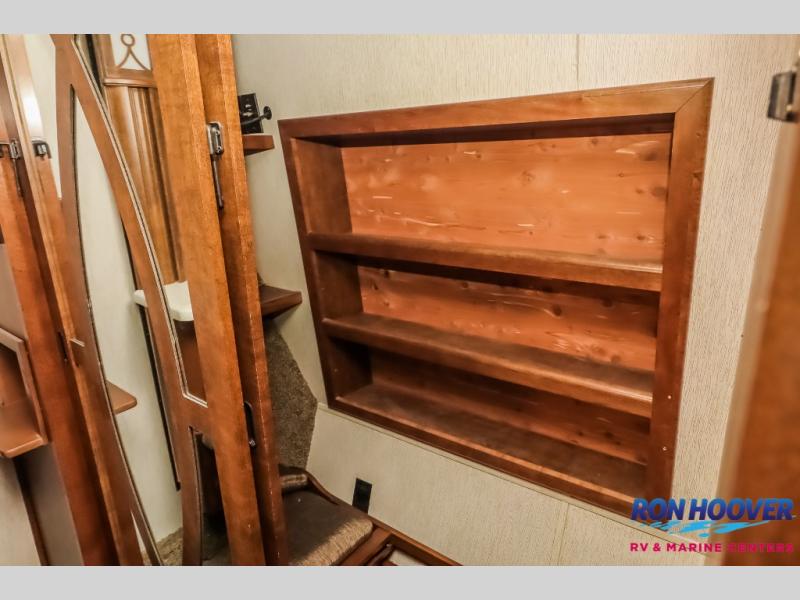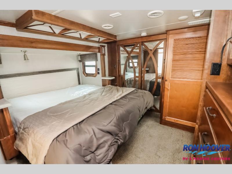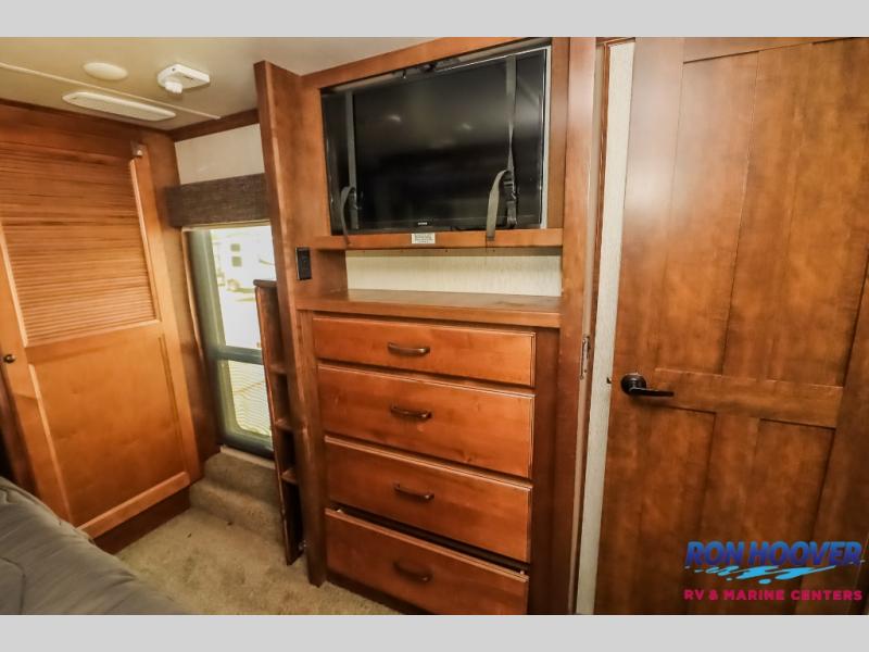 What I liked most: The living area has great view from all angles as long as you are on the couches. The raised ceilings give this fifth wheel a breathable atmosphere. The bedroom has more than enough storage.