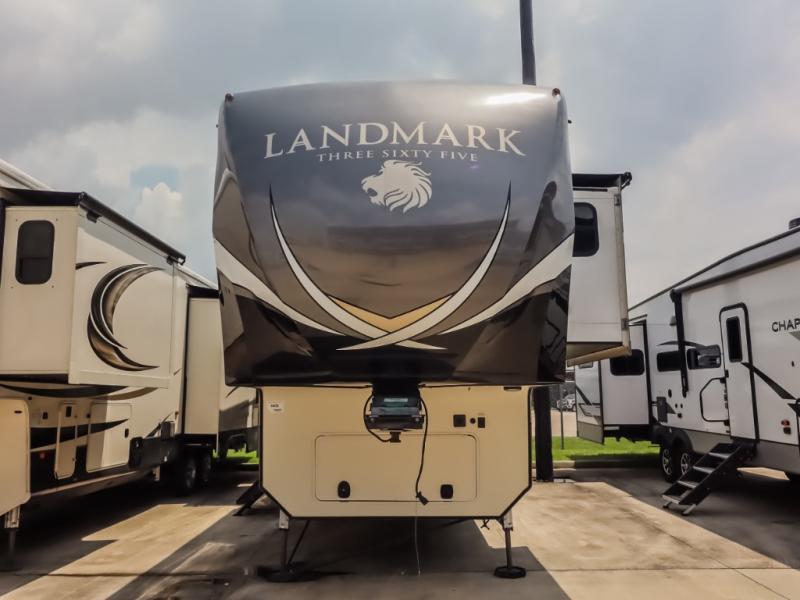 Come experience true luxury when you camp with the Landmark 365 by Heartland RV. These fifth wheels boast of comfort and convenience throughout. The sofa tables offer USB ports, so you can easily charge your electronic devices. In the living room, choose the optional Away Package and enjoy power theater seating with heat and massage - now that's luxury! The bedrooms offer adjustable reading lights, a power tilt bed, plus a TV. A few key features that you would find at home include a backlit tile backsplash, a residential refrigerator, and a farmhouse stainless single basin kitchen sink with a cutting board. There are also beautiful Maple hardwood cabinets throughout, plus so much more!