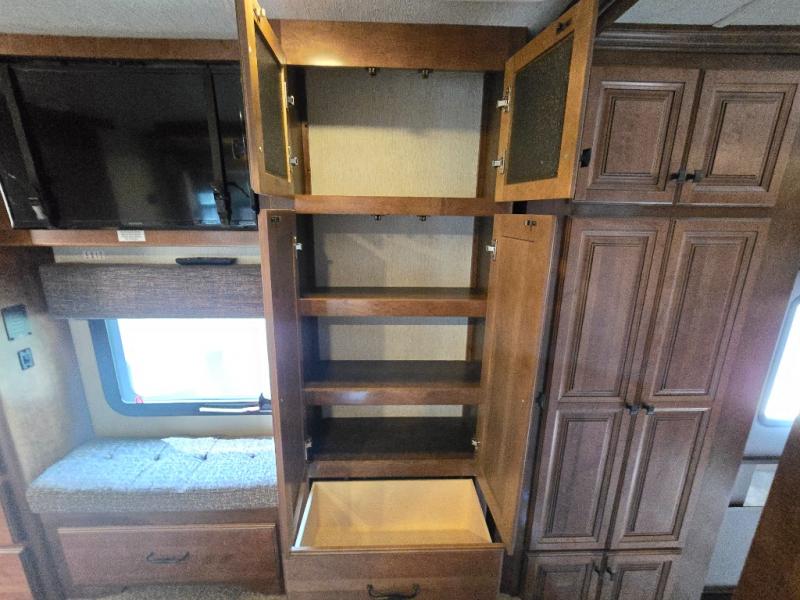 What I liked most: The bathroom has a big mirror, lots of storage, and a wardrobe closet so I can grab my clothes right out of the shower. The bedroom entertainment center looks well designed and of high quality with the tv in a picture frame.