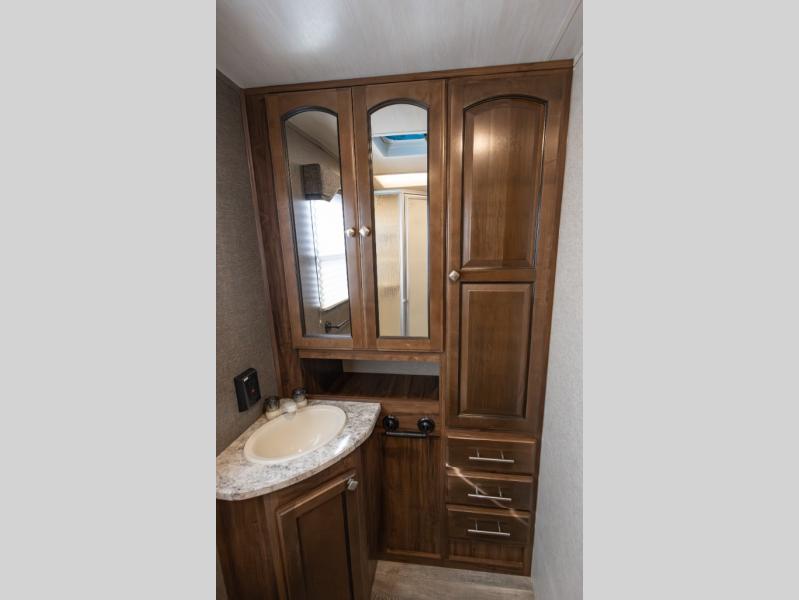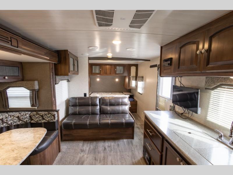 Are you ready for relaxing days and evenings filled with sitting around the campfire visiting with your family? You will want this single slide out North Trail 22FBS travel trailer! This model can easily sleep four people. After you set up camp then come inside and enjoy the comforts throughout from the sofa to the u-dinette where you can eat your meals or play a card game or two. The rear bathroom features extra storage and an angled shower. When mom and dad are ready to turn in for the night then come enjoy the front bedroom! This model is available in the Caliber Edition.