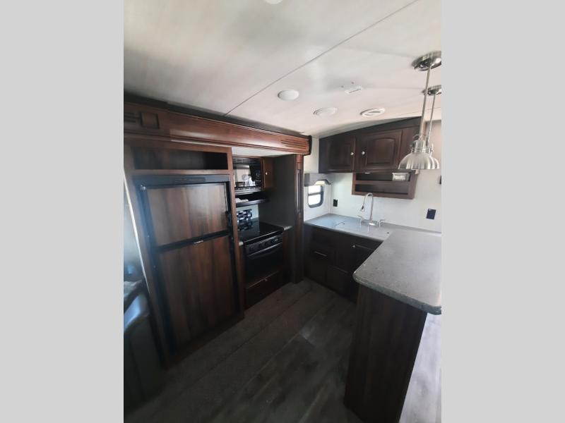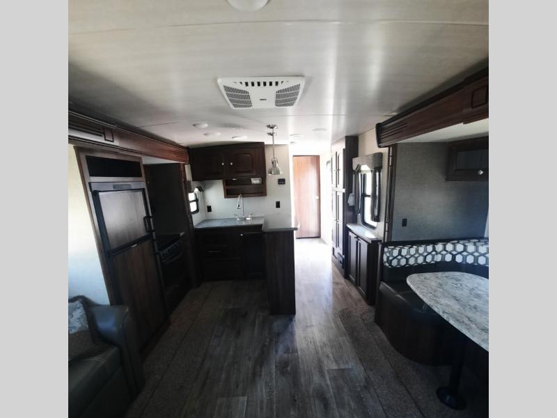 Opposite the u-shaped dinette find a slide out sofa with storage above, and a refrigerator, plus three burner range. The L-shaped counter features a double sink along the interior wall and another side features a couple of bar stools so the cook in the family can enjoy a little company while whipping up snacks and light meals as you travel, plus so much more!