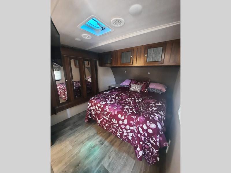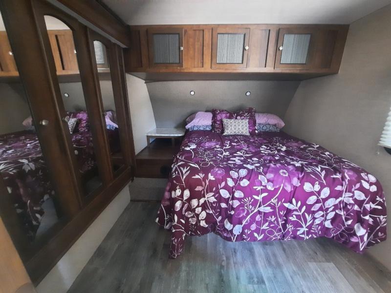 In the front bedroom you will enjoy a spacious room with slide out wardrobe, bedside closet on one side, and an overhead cabinet for your things as well. Enjoy a good night's sleep on the queen bed. An optional flat screen TV is mounted on the interior bedroom wall opposite the bed for easy viewing.
