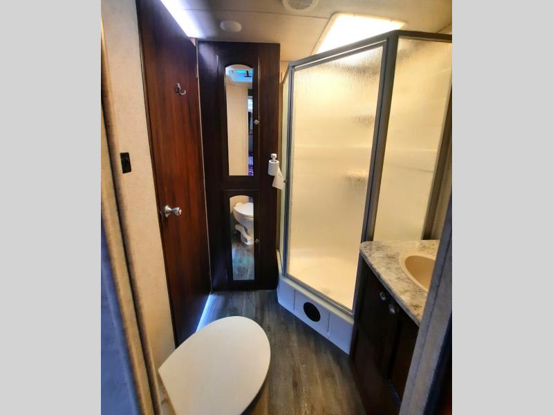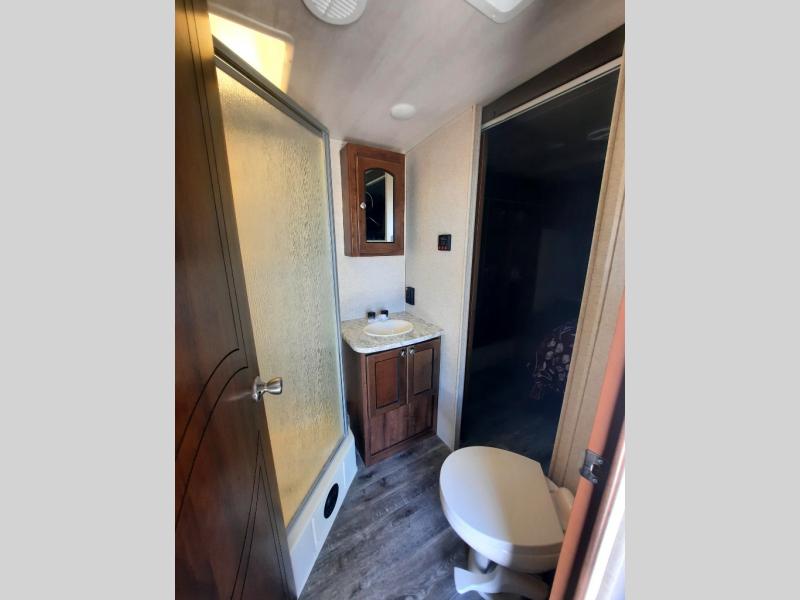 Step inside and notice the convenient location of the bathroom. No running through the unit when enjoying the great outdoors. There is an angled shower, linen cabinet, toilet, and sink with storage above. The sliding door inside the bath leads directly into the front master suite.