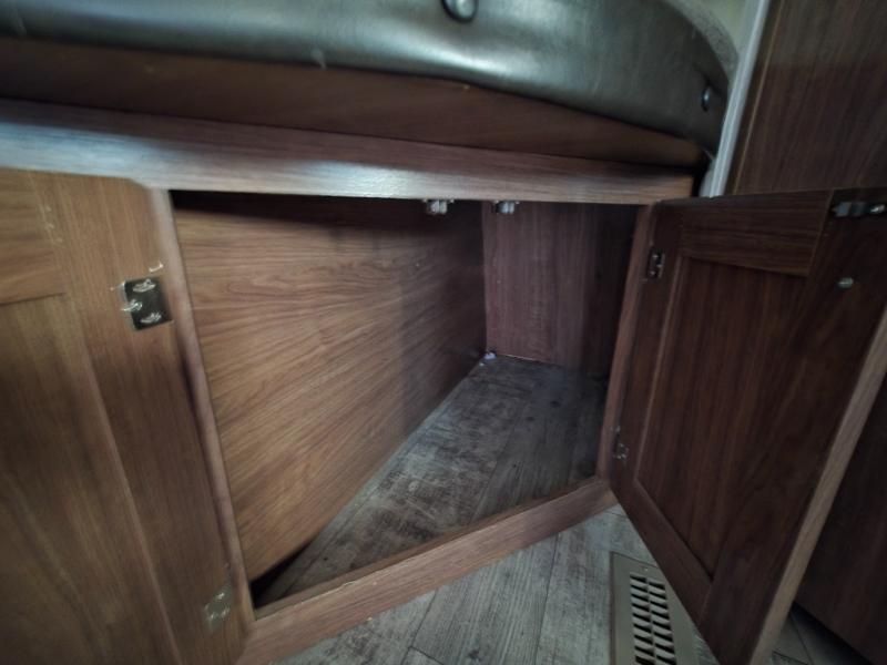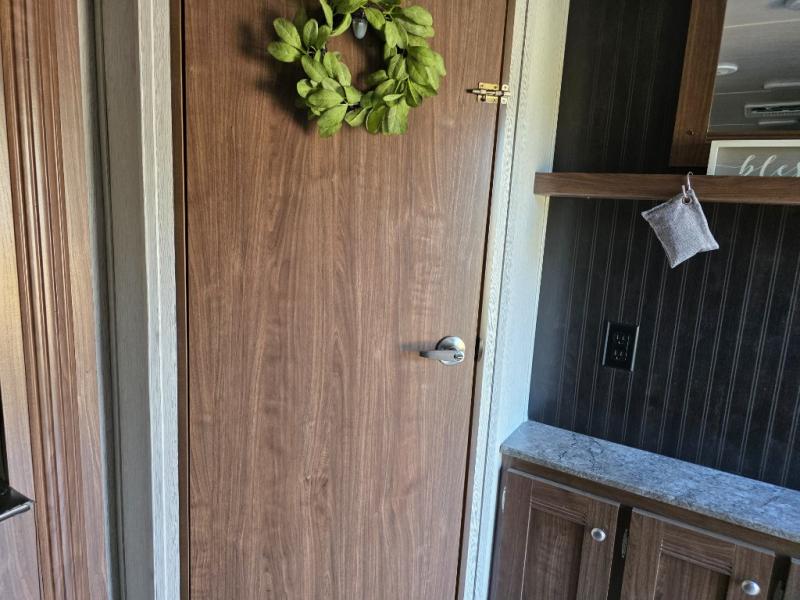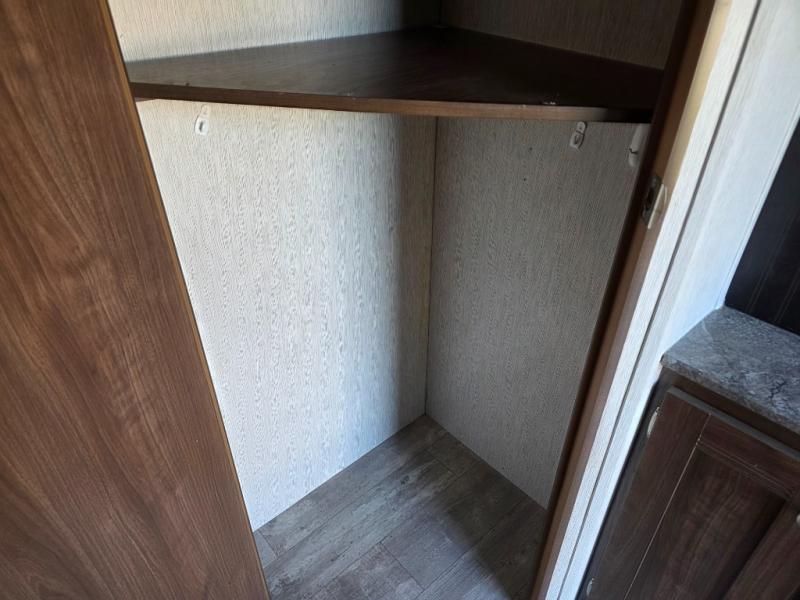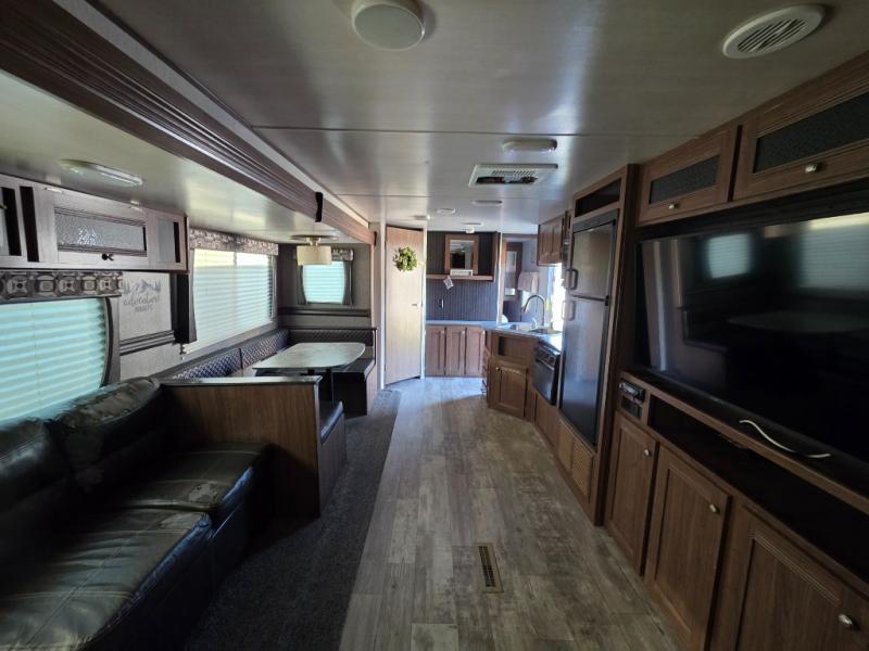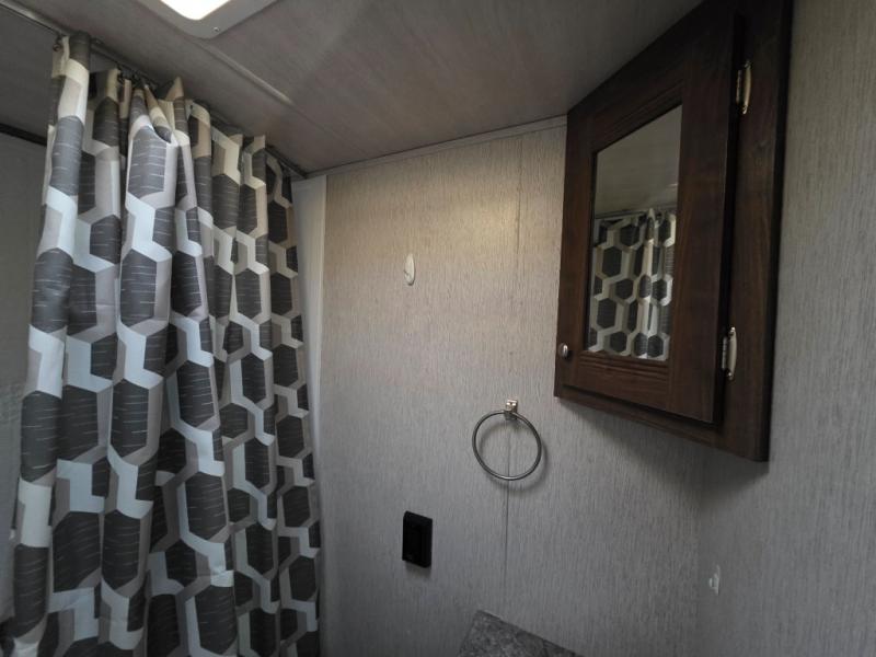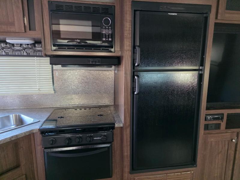 If you enjoy soaking up the sunshine and spending time outdoors, then this Pioneer travel trailer is the one for you. Since this trailer comes with an outdoor kitchen, you can even prepare dinner outside in the bright sunlight while catching up with the neighbors and listening to your favorite music on the exterior speakers. The U-shaped dinette on the interior will be helpful for dining together, playing cards later, or sleeping at night, and you will even be able to have your own secluded sleeping place with the queen-size bed in the front private bedroom.