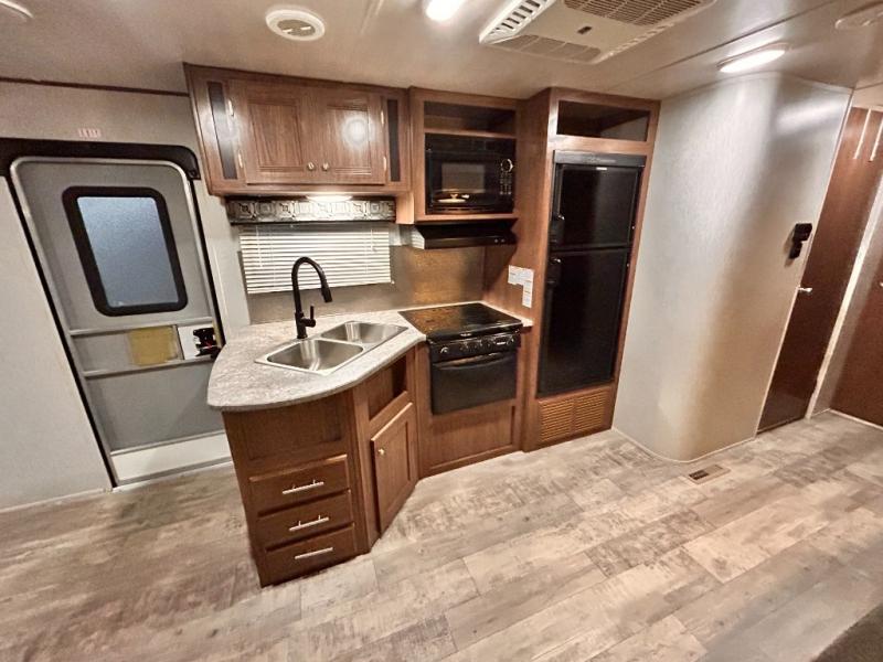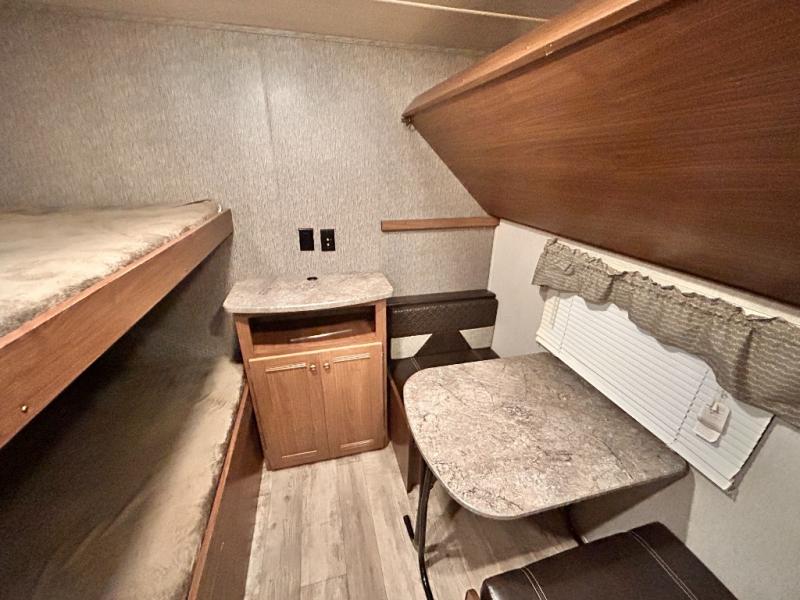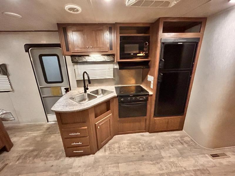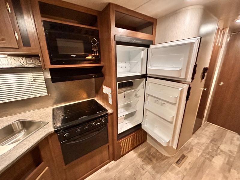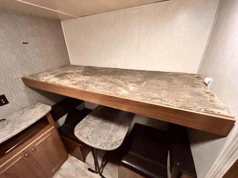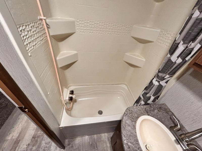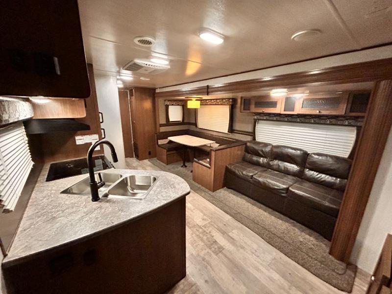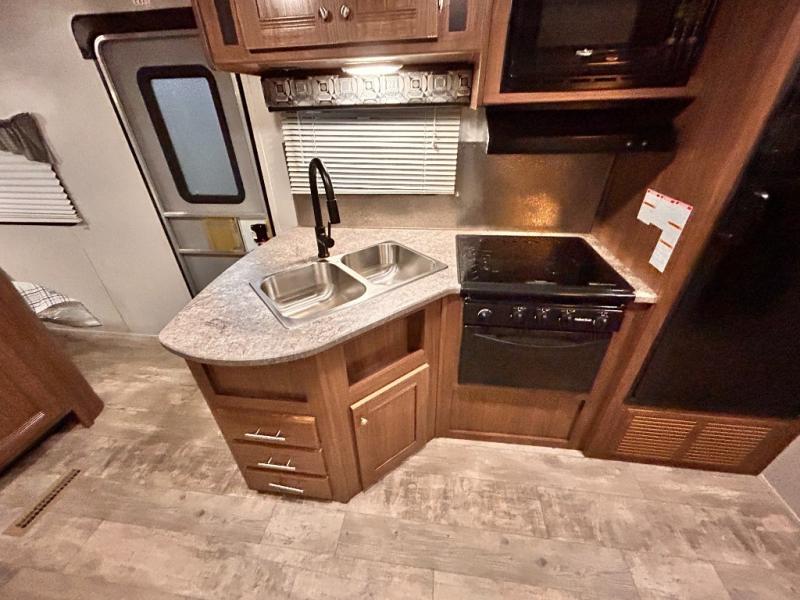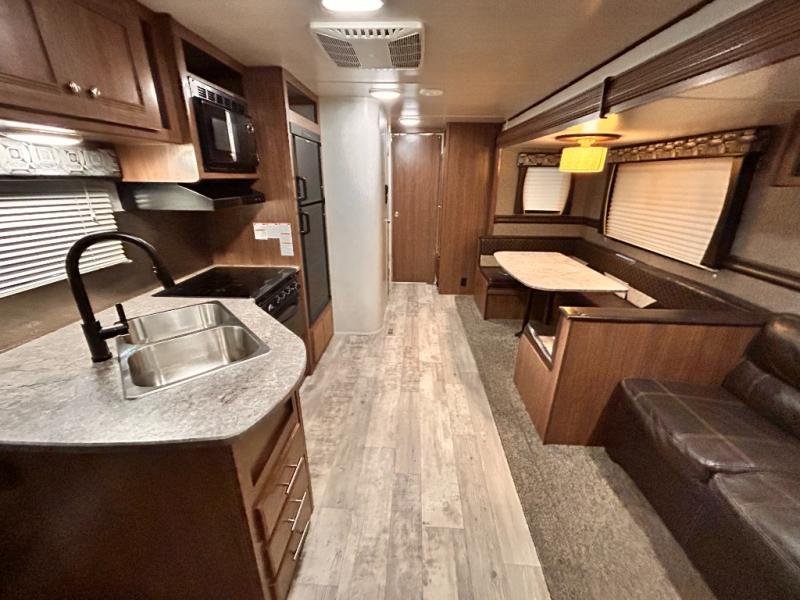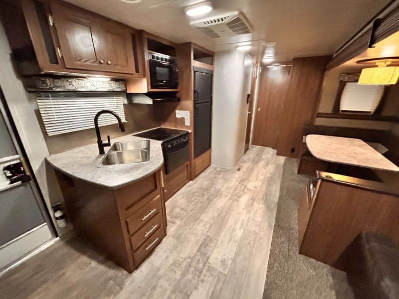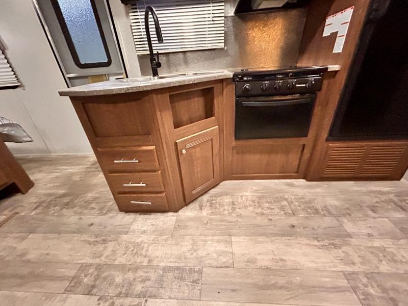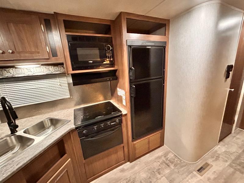 As you enter this model, you will find that the slide out along the road side helps to open up the floor space and gives you more living space. Within the slide out there is a sofa with an overhead cabinet and a u-shaped dinette. Both the dinette and sofa can easily convert into additional sleeping space at night, if needed. Along the foot of the bed there is an entertainment center where you can add a TV if you like. The kitchen amenities are located along the door side of this model. Here you will find a double sink, a three burner range, an overhead cabinet, plus a refrigerator.