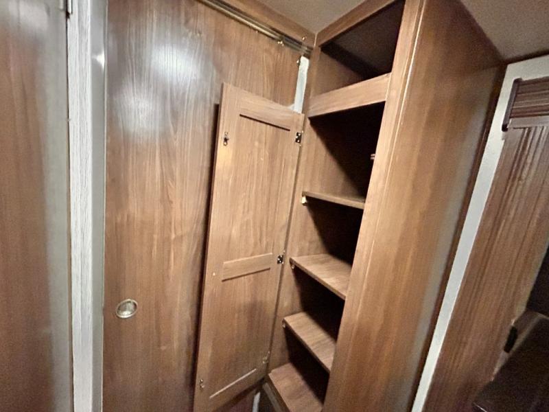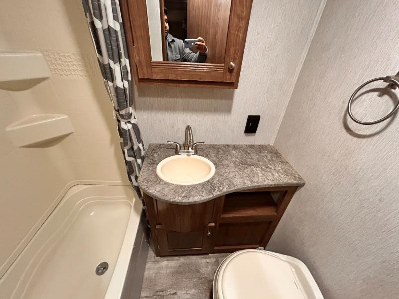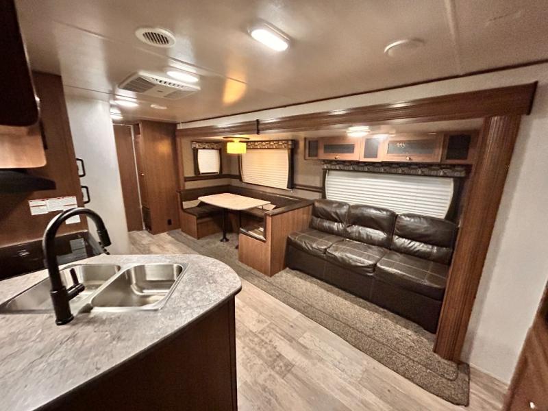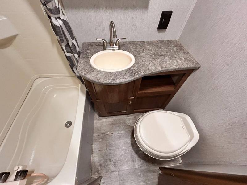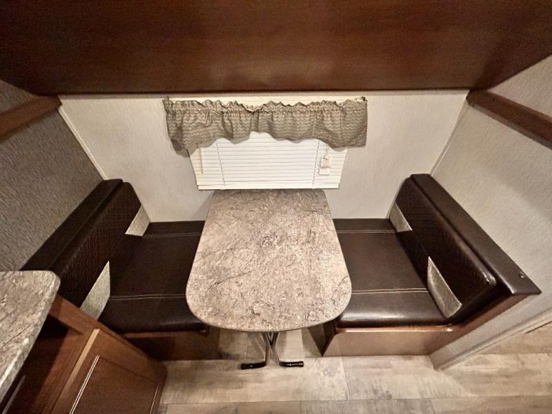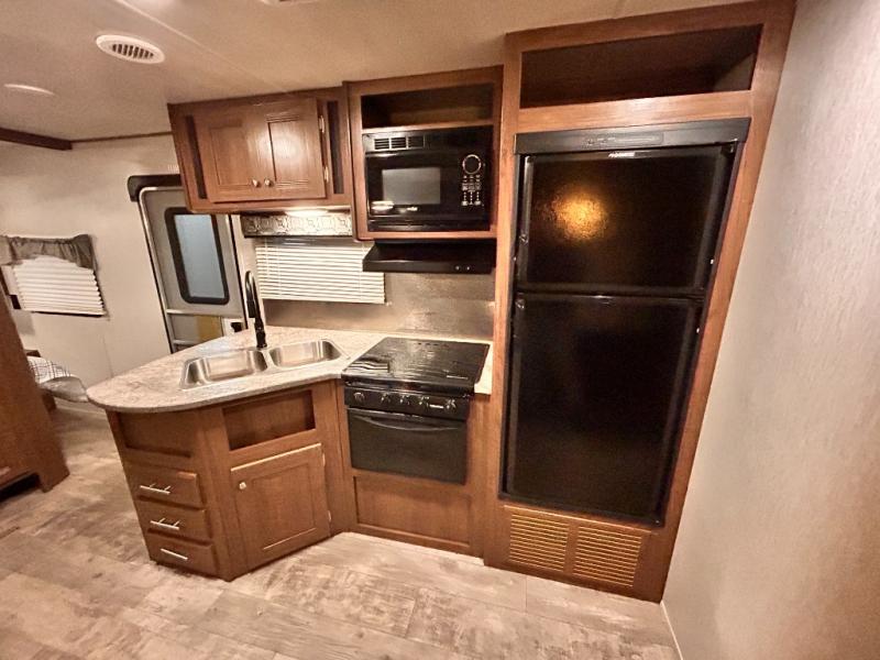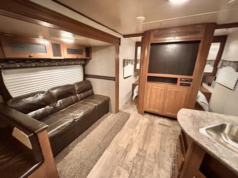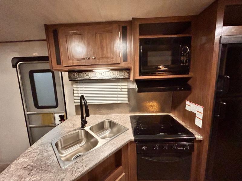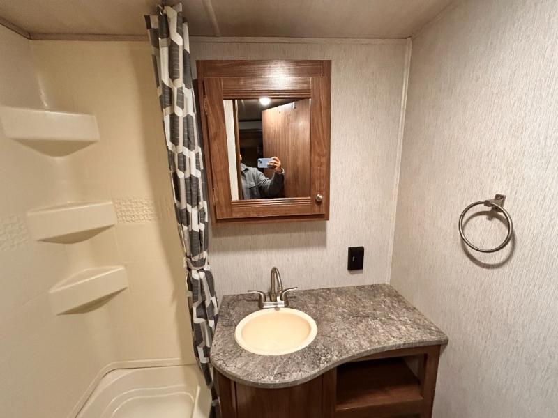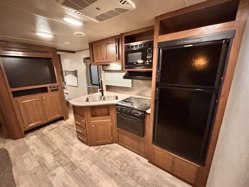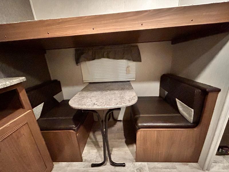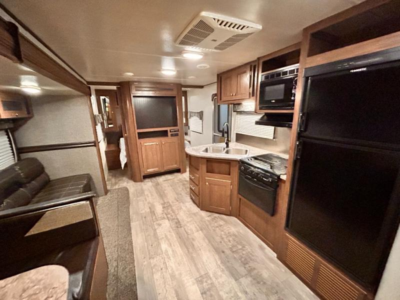 As you enter this model, you will find that the slide out along the road side helps to open up the floor space and gives you more living space. Within the slide out there is a sofa with an overhead cabinet and a u-shaped dinette. Both the dinette and sofa can easily convert into additional sleeping space at night, if needed. Along the foot of the bed there is an entertainment center where you can add a TV if you like. The kitchen amenities are located along the door side of this model. Here you will find a double sink, a three burner range, an overhead cabinet, plus a refrigerator.