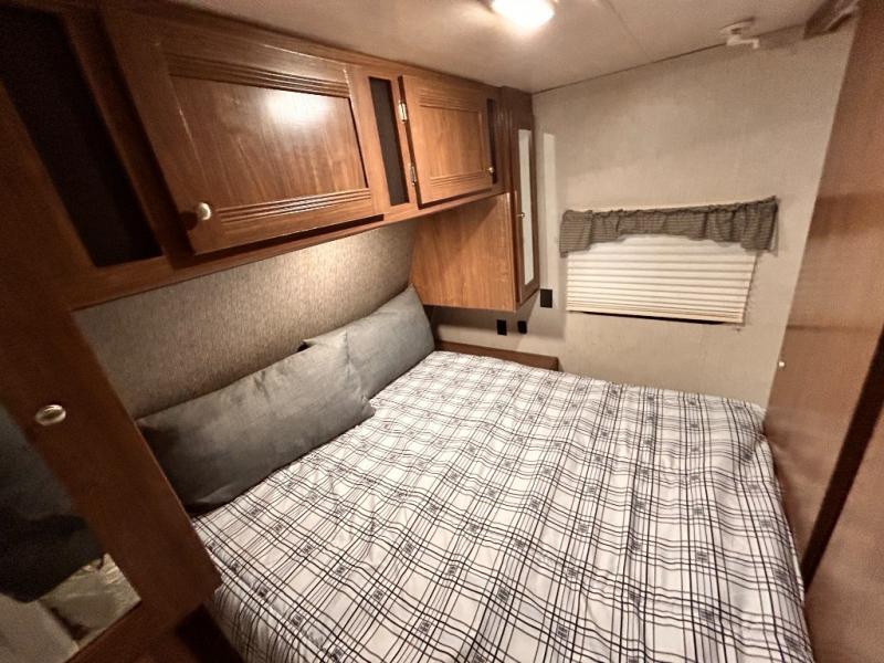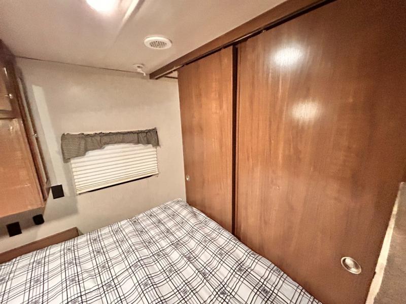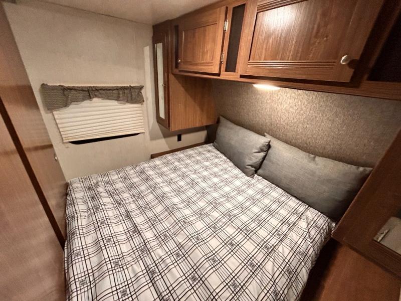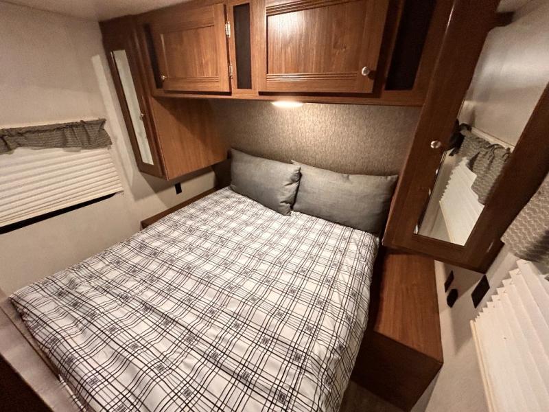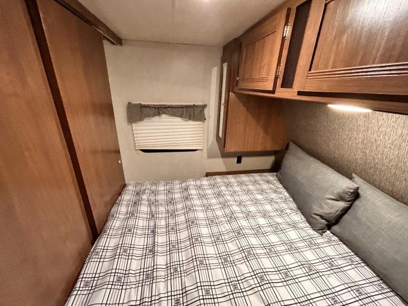 In the front bedroom there is a queen bed, nightstands, and overhead cabinets for your personal belongings.