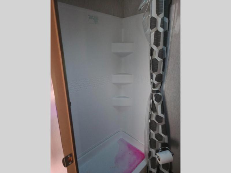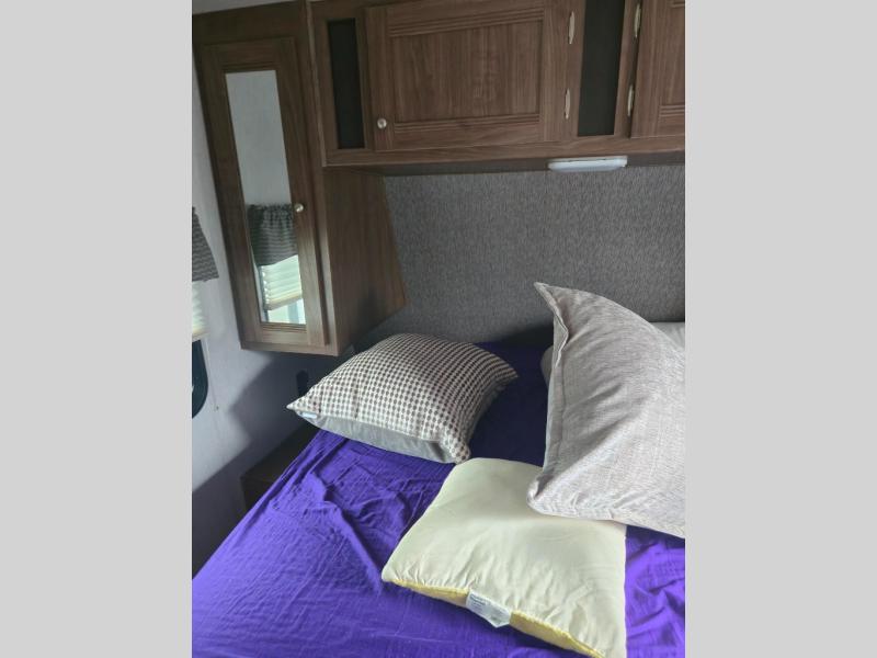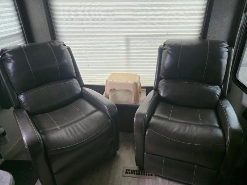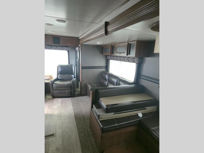 As you enter through the rear door you will find two lounge chairs, an end table, and an overhead cabinet along the rear wall. The slide out along the road side features a sofa, overhead cabinet, and a u-shaped dinette. Both the sofa and dinette easily convert into additional sleeping space at night if needed. Along the interior wall, adjacent to the dinette, there is an entertainment center, and you can add a TV if you like.