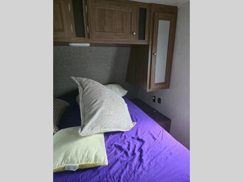A sliding door closes off the bedroom from the rest of the trailer. In the bedroom there is a queen bed, nightstands, and an overhead cabinet. A private entry door is also in the bedroom which will lead you outside, and more!
