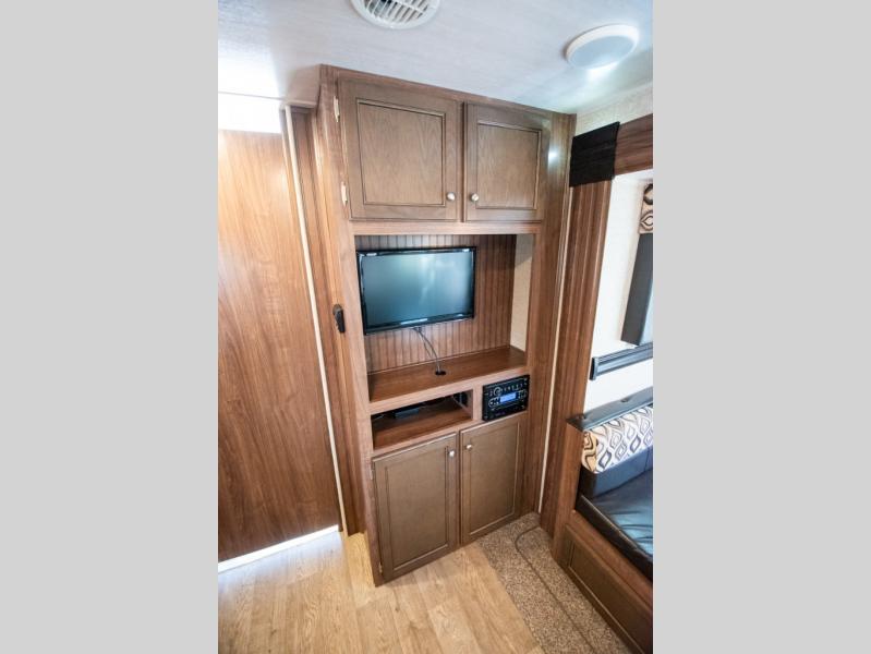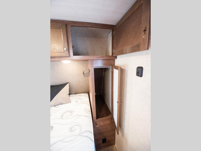 Located in the very front of the trailer there is a bed with a storage area along the foot of the bed, and an overhead cabinet which runs the width of the trailer, and more!
