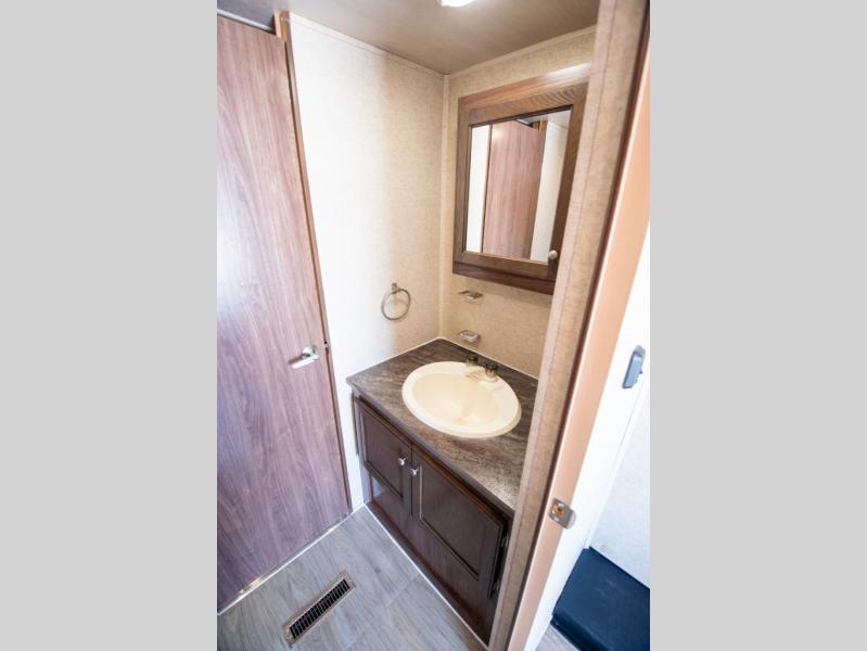 The bathroom has a sink along one side, and a toilet plus a shower across the hall, on the road side of the trailer.