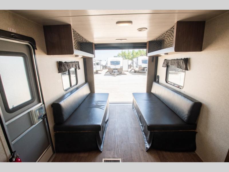 In the combined front area you will find that the kitchen amenities are located along the door side of this model. There is a refrigerator, a three burner range, a double sink, plus an overhead cabinet for dishes or other items. Straight in from the entry door there is a u-shaped slide. During the day, enjoy your meals or snacks around the dinette, and at night easily convert this area into additional sleeping space.