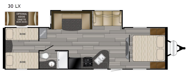 Spacious Floorplan – The 30LX provides a roomy layout designed for family adventures. With a slide-out living area, private master bedroom, and a separate bunkhouse, everyone has space to relax and unwind.