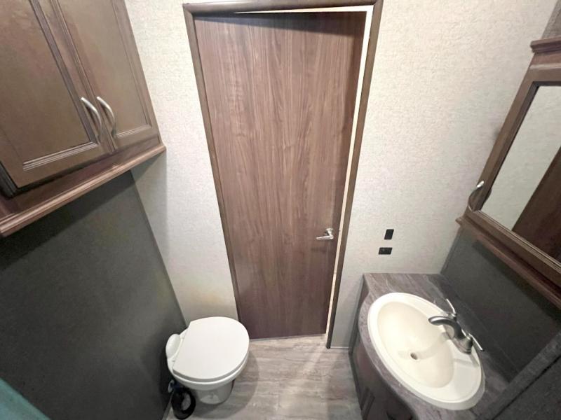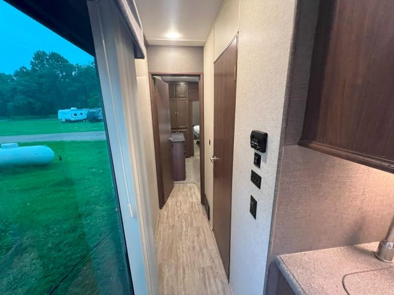 Step inside through the sliding glass patio doors. To the right enjoy a spacious open concept kitchen and living room with a front entertainment center. The slide to the right of the door features a dining table to serve your meals at, and a sofa with overhead storage. The slide out opposite provides even more seating with space for two lounge chairs, and a refrigerator and pantry.