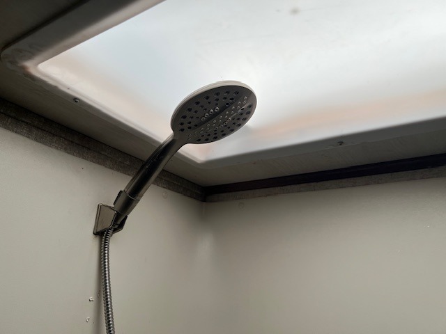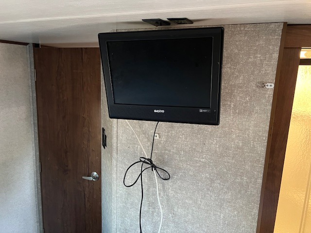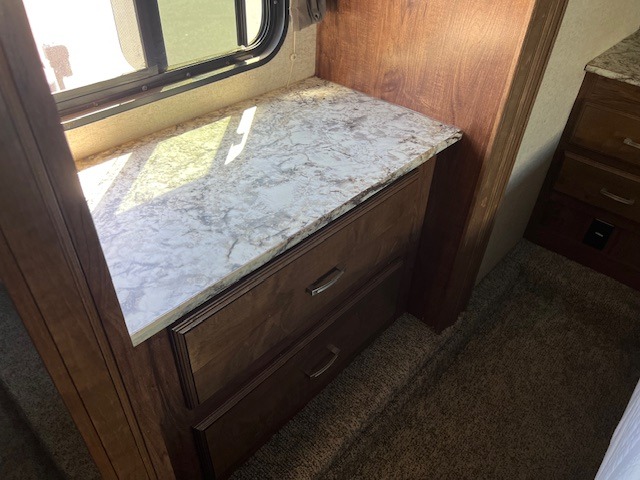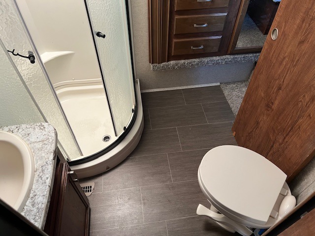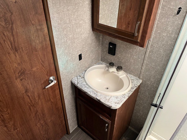 Head up the steps to the front bedroom and complete side aisle bath. At the top of the steps on your left enjoy an angled shower, toilet, and vanity with sink, plus an overhead medicine cabinet. There is a convenient second bath door that allows access into the bedroom, plus there is linen storage inside the bath from the bedroom slide out.