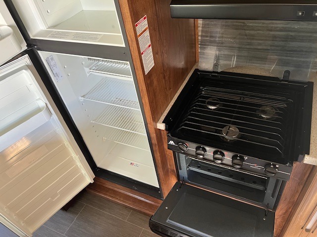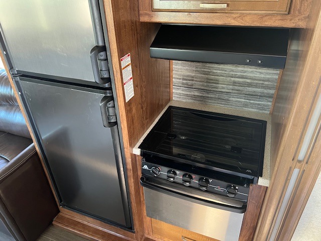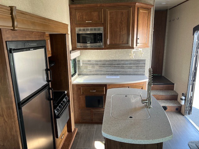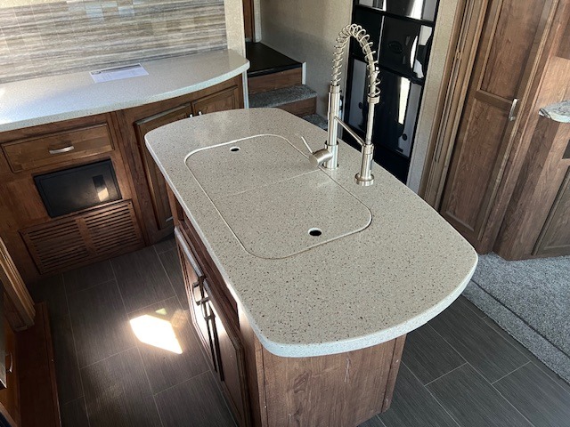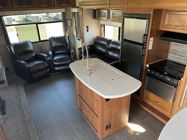 Along the road side you will find a second slide that features a sofa with storage above, and the kitchen refrigerator and three burner range which makes it easy to do your own cooking while away from home. You will find generous counter space along the interior wall, and more with the convenient kitchen island in the center which also includes a double sink for cleaning up. You will also find ample storage here as well.