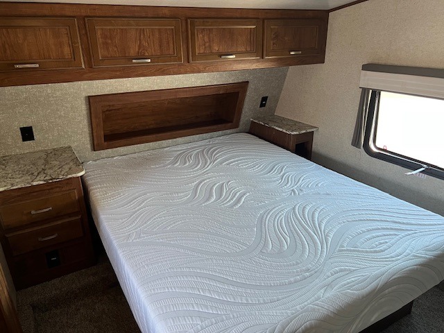 The front master can also be accessed from a hallway door. In this bedroom retreat enjoy a comfortable queen size bed with nightstands on either side as well as overhead storage, and inside the slide out wardrobe along the road side, plus more.