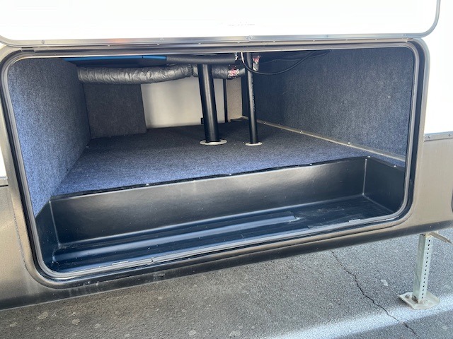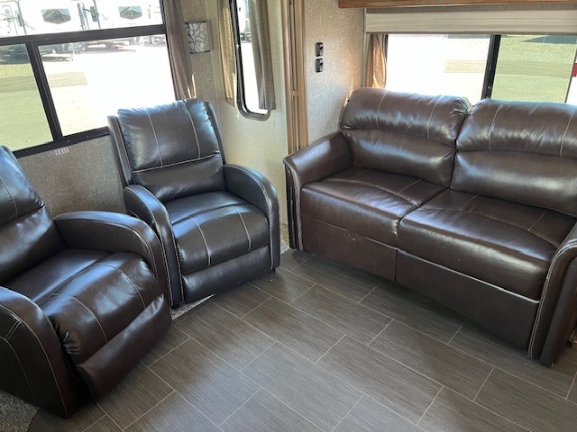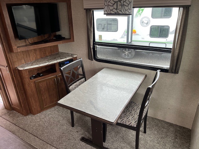 Step inside and notice the open concept living space with the dual opposing slides fully expanded. There is a corner storage/entertainment center and free standing dining table for four in the slide to your immediate left. Across the rear wall you will find two lounge chairs and a bit of storage in upper cabinets that stretch the entire width of the unit.